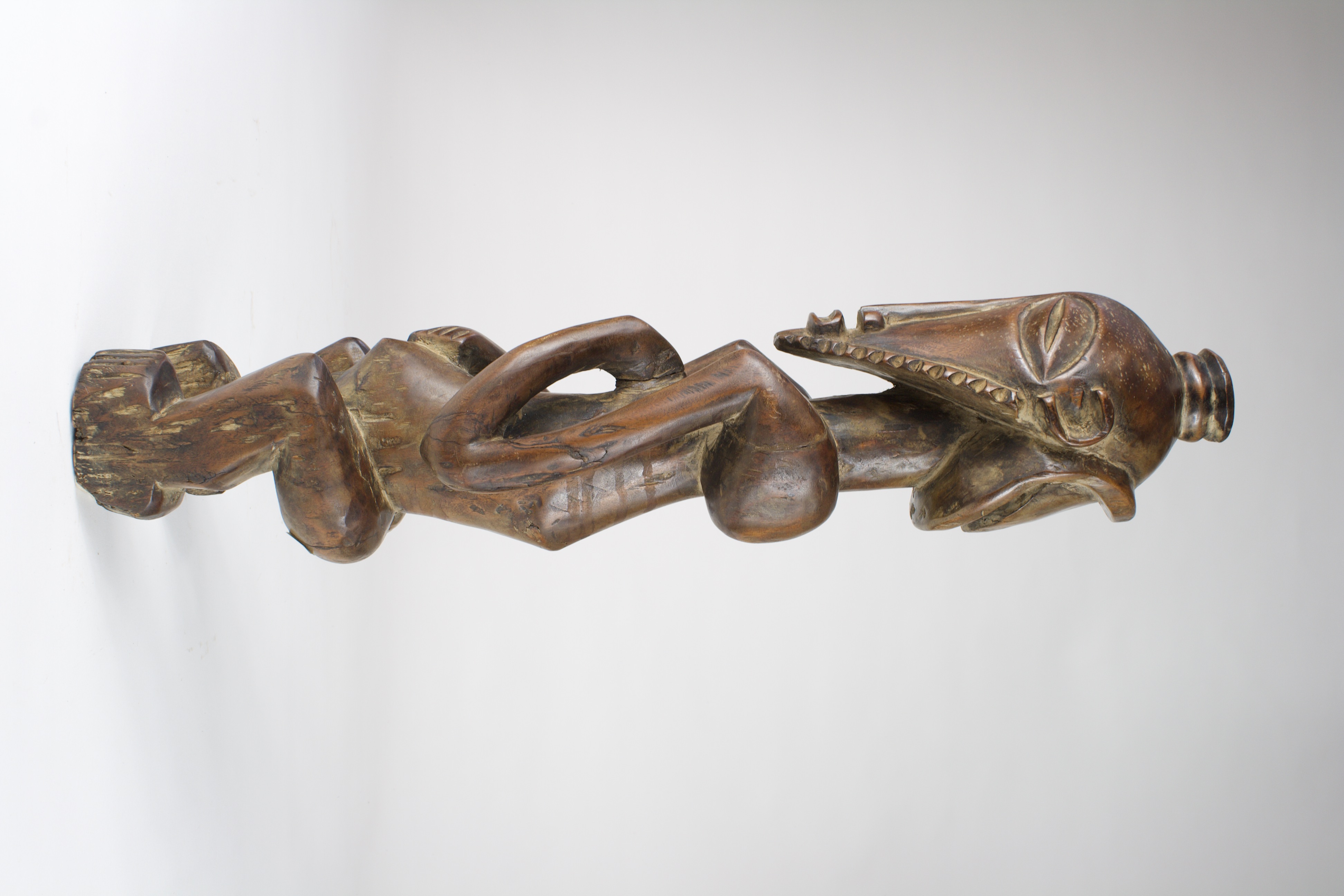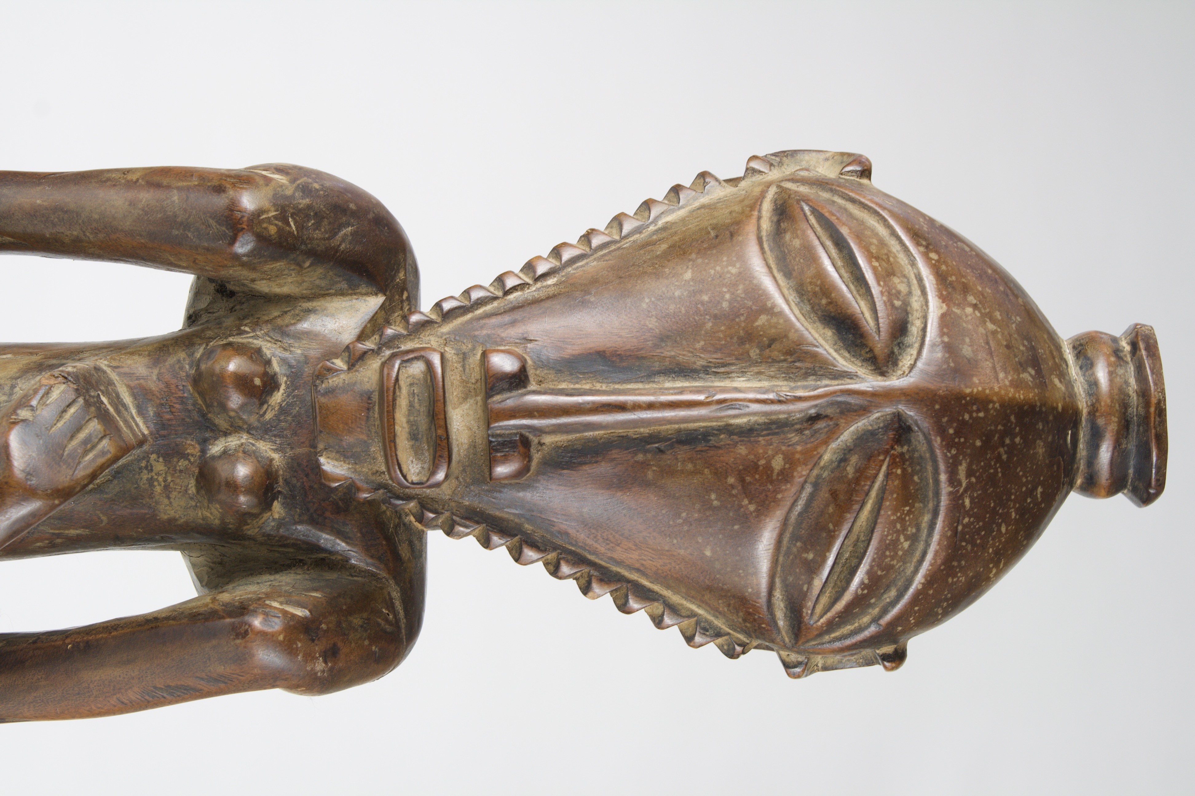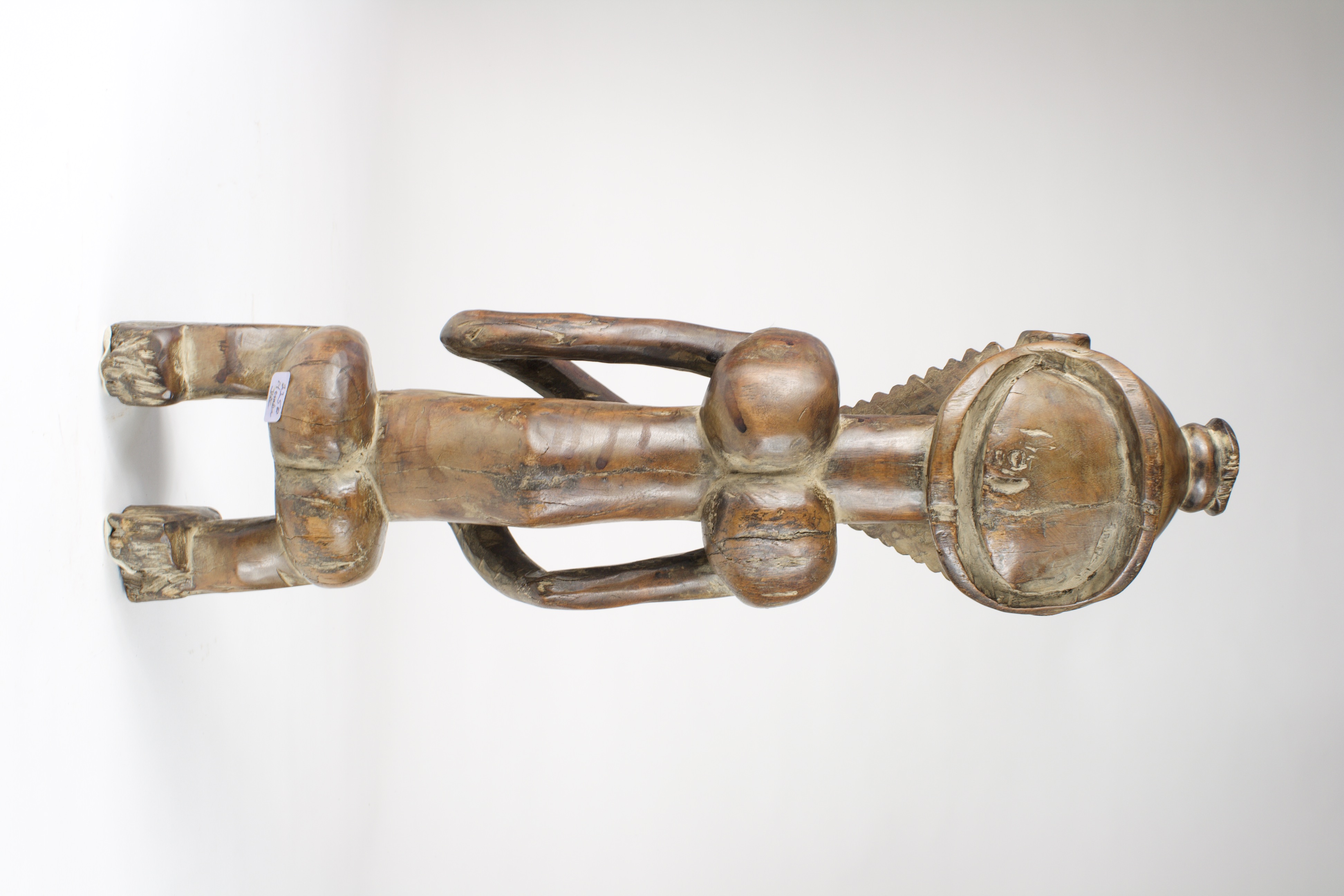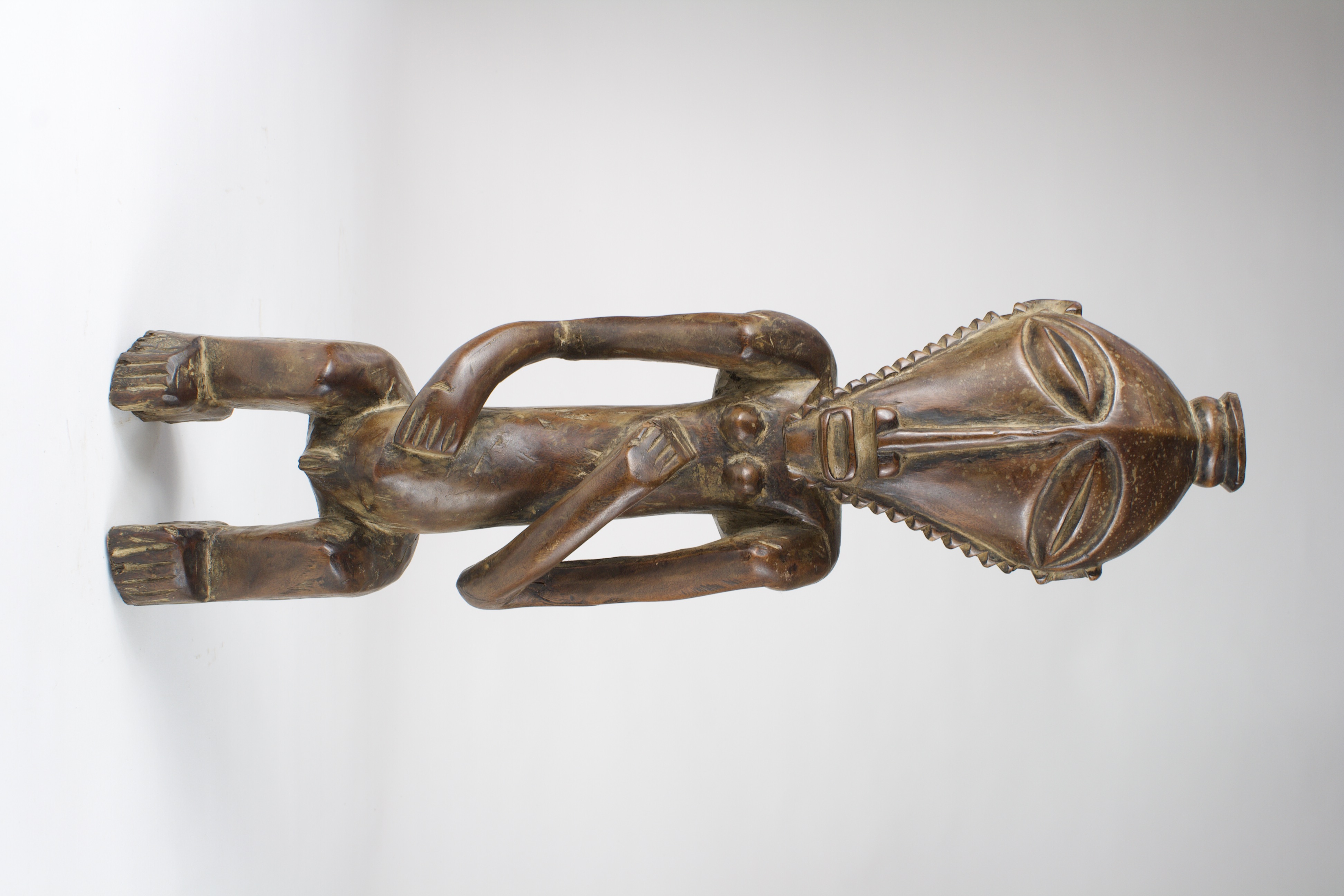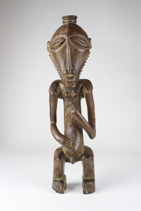 Standing female figure, carved of wood with identifiable characteristics of the Hemba style such as the head shape, coiffure, ovular eyes and beard like detail around the face. One hand rests on the pronounced navel, with the other angles upwards towards the chest. The female genitalia has been exaggerated, possibly expressing a maternal function or image of fertility.