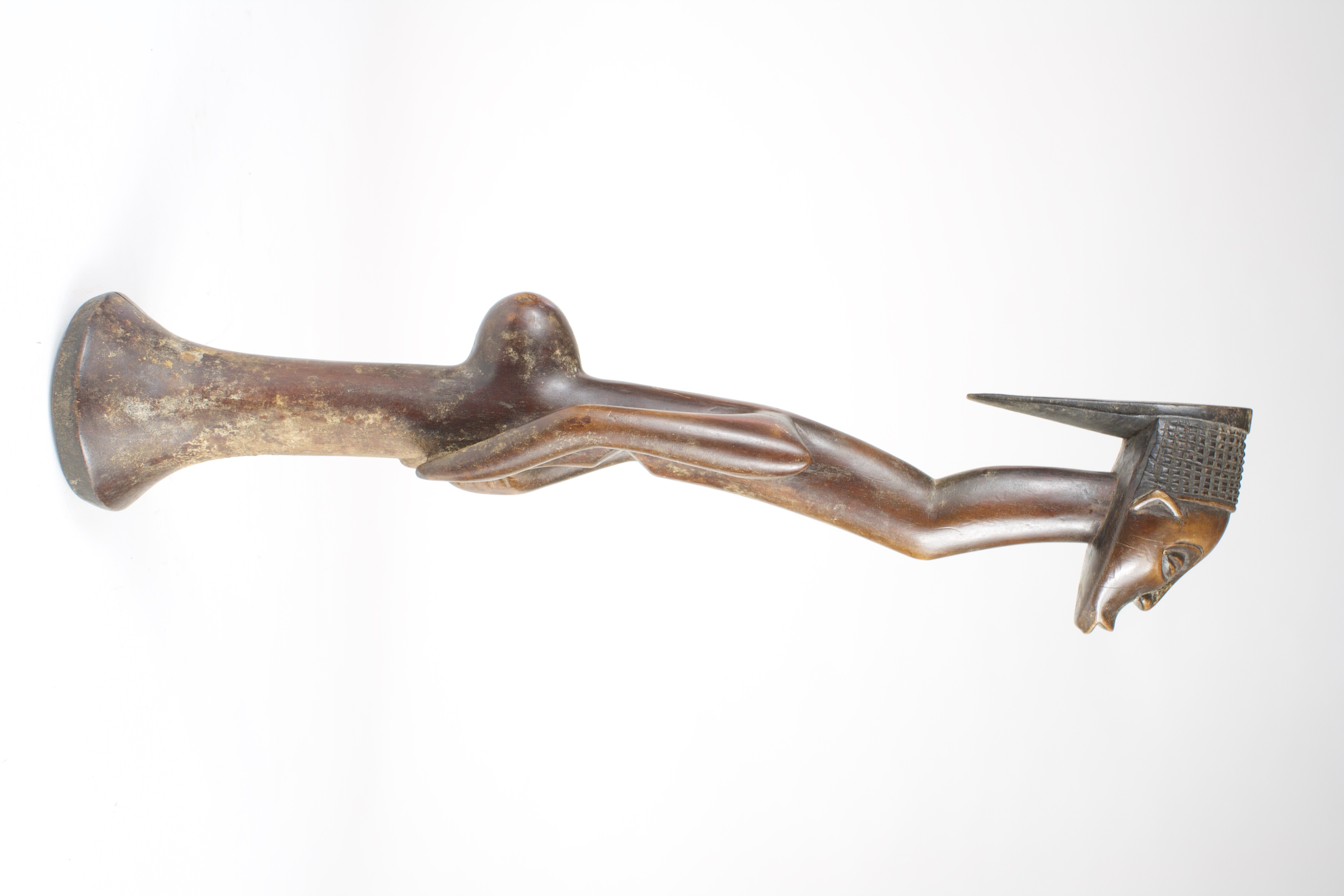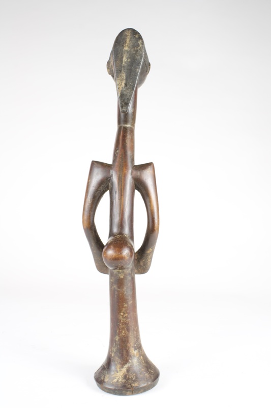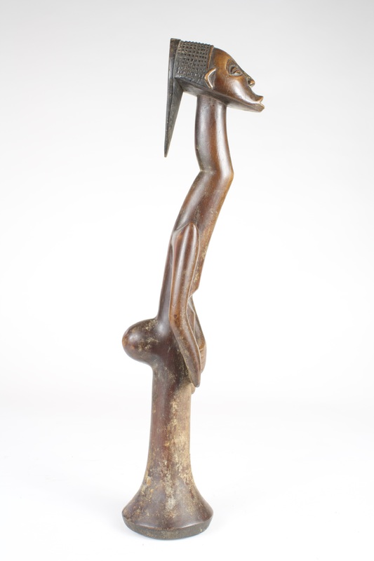 The elongated figure features a slender, curved neck leading to a rounded head adorned with an intricately carved headdress, protruding buttocks, and pointed shoulders with a rod-like lower half, possibly for support. This figure could represent an ancestor or symbolize authority.