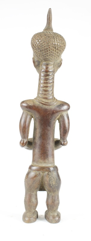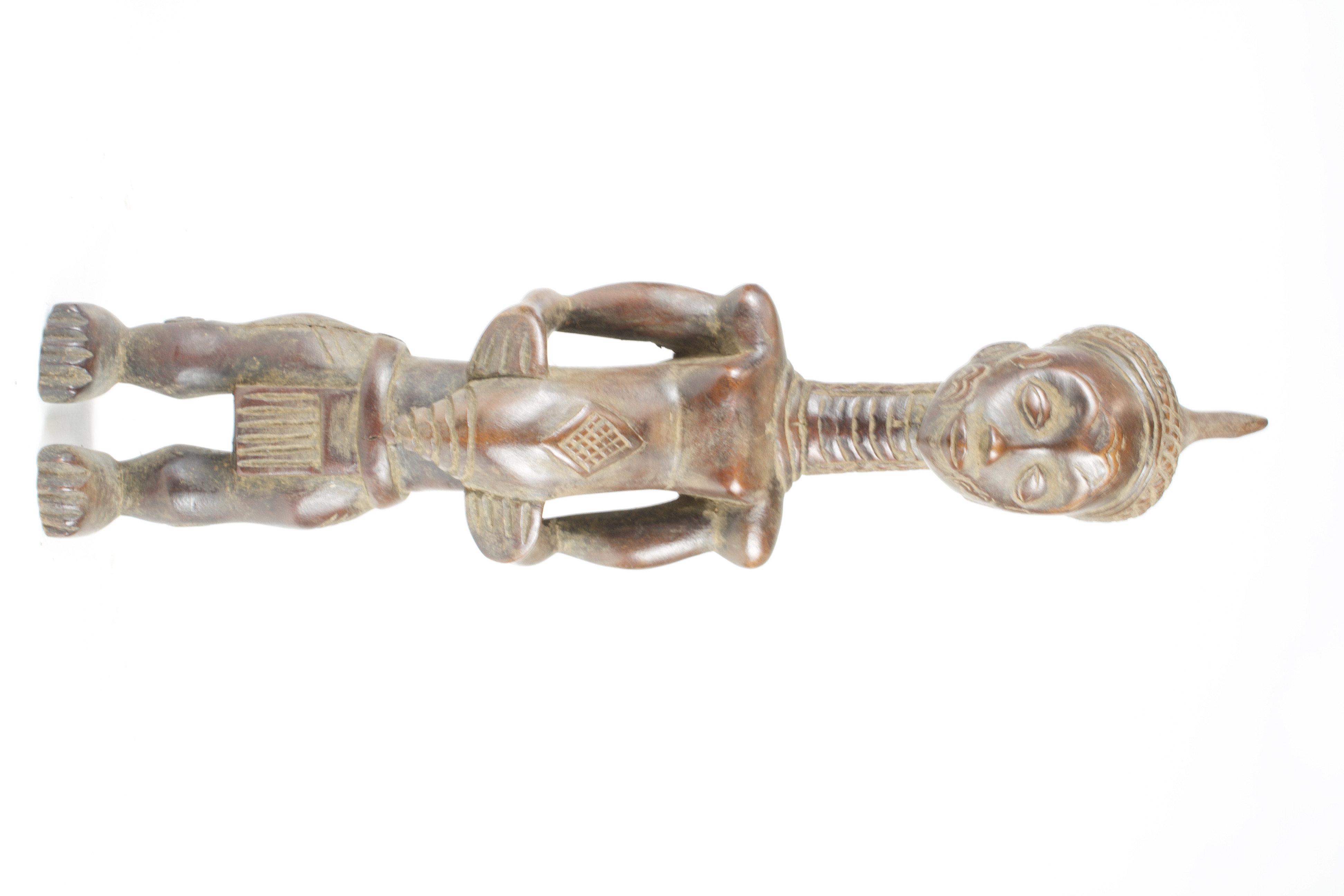 The carved wooden female ancestor or power figure is highly decorated with scarification patterns and incised lines marking the collar necklace and loin cloth. The figure may be a representation of the "Mupaki wa manga" power figure, protecting from and controlling otherworldly forces.