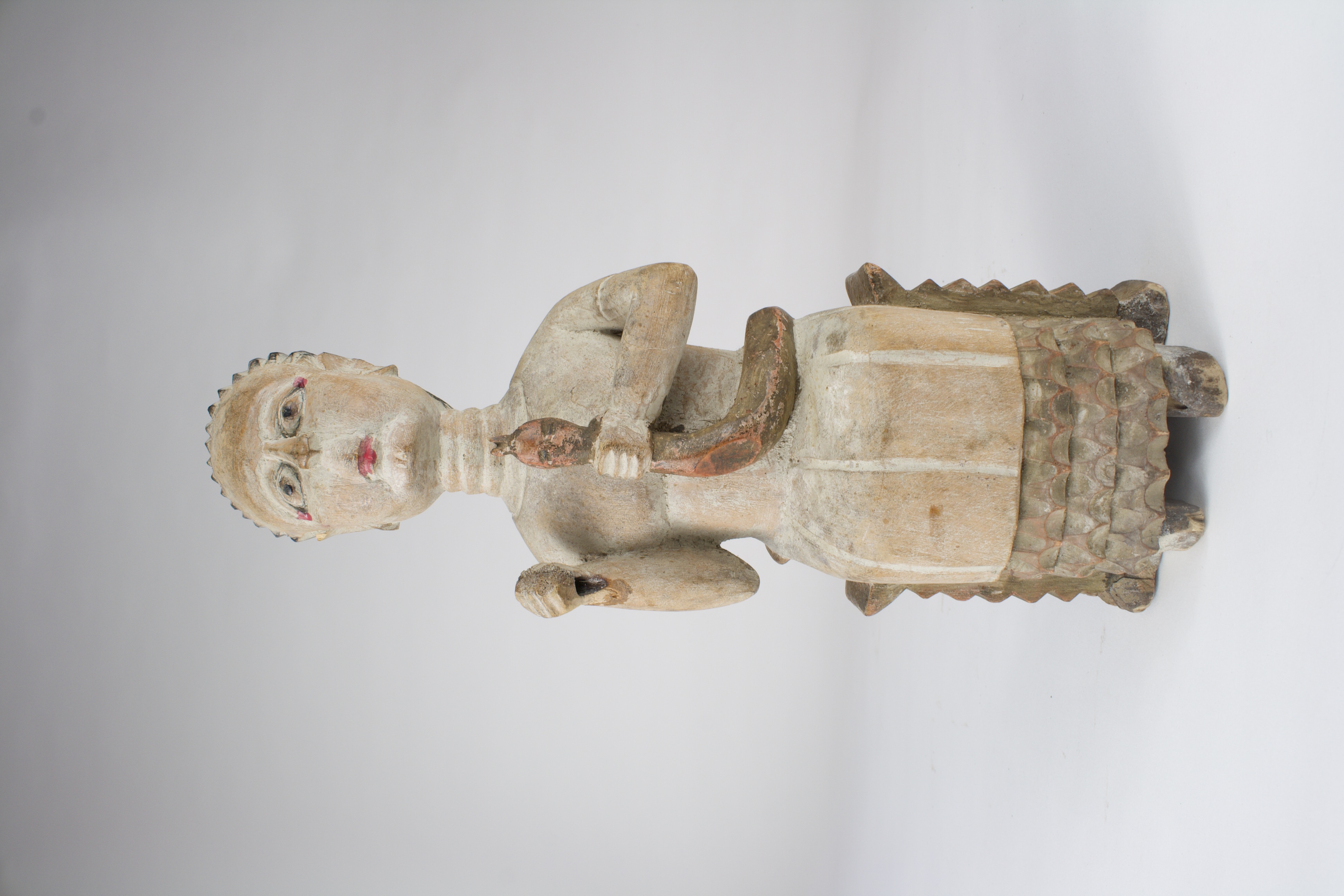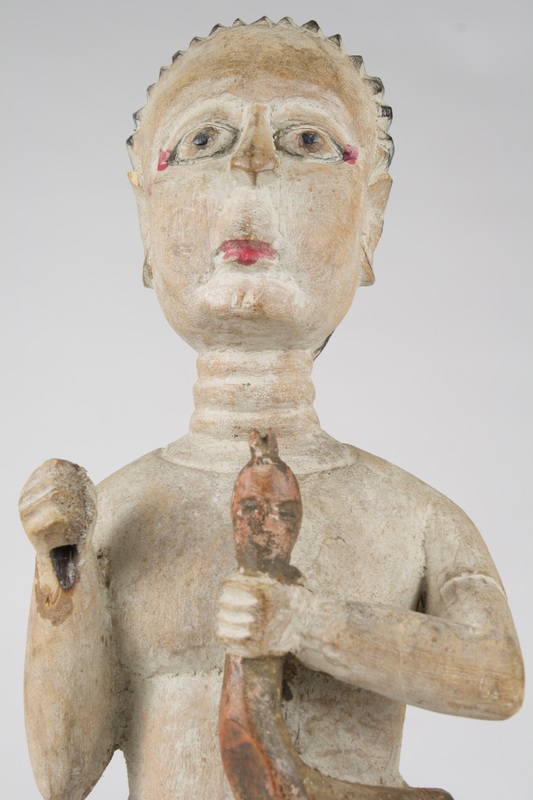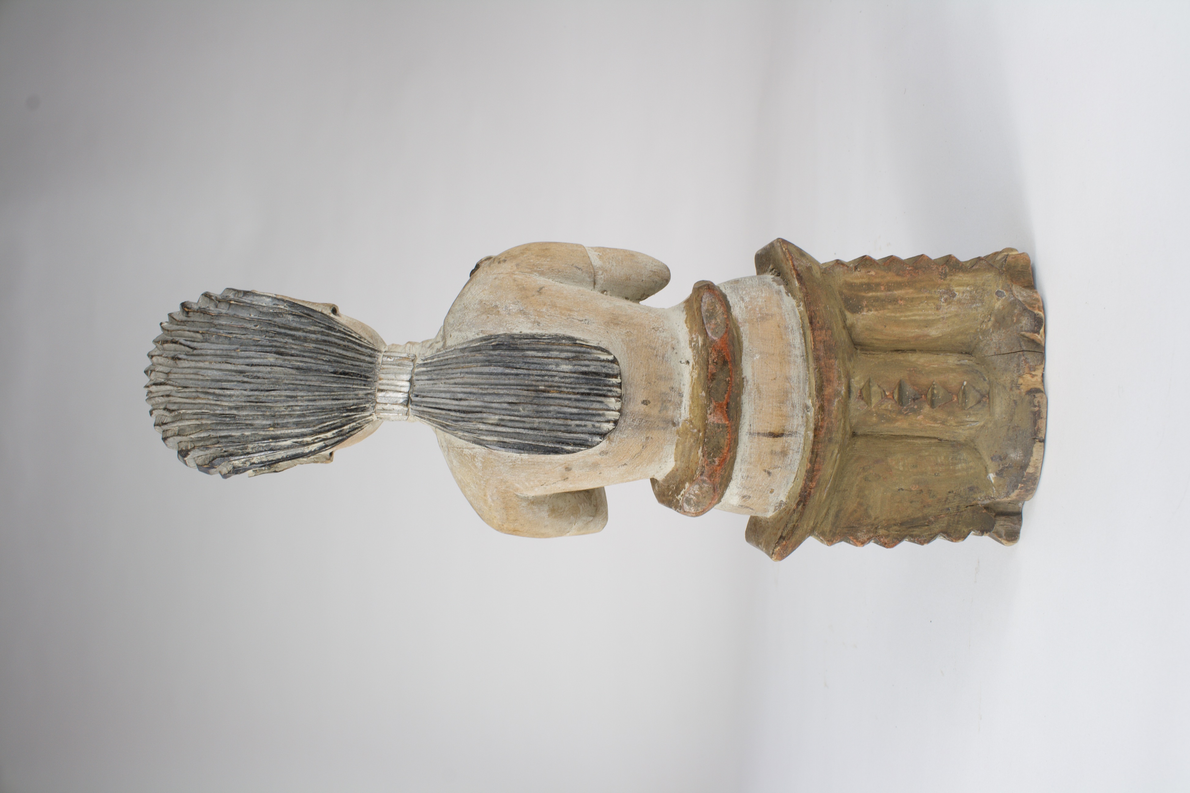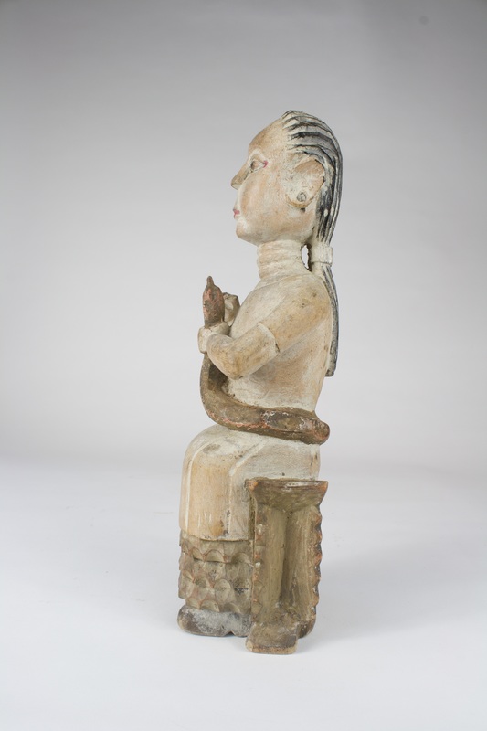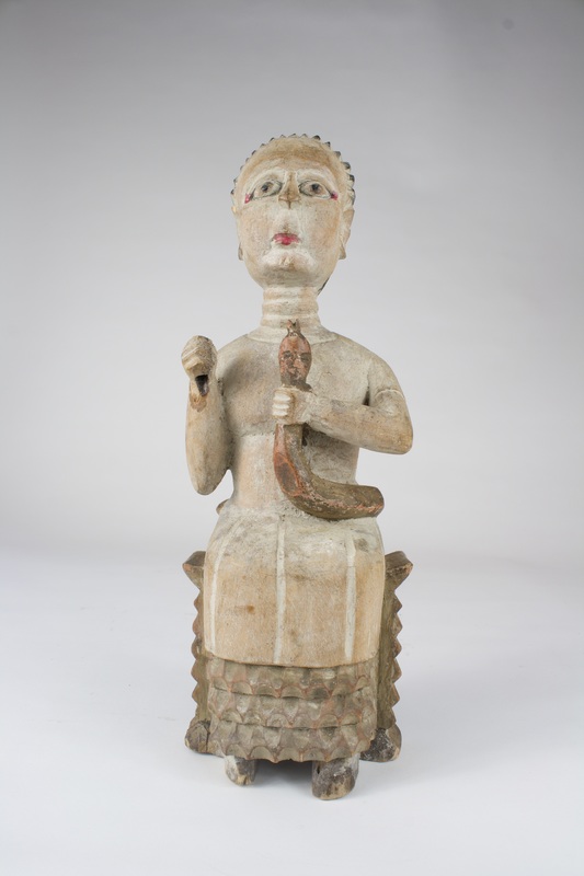 A seated wooden female figure, grasping a snake in one hand, and an open space within the clenched fist of the other. The figure has naturalistic, yet exaggerated features and a stylized coiffure. The figure may represent royalty, potentially depicting a Queen Mother, as it is seated in a highly detailed chair and covered in a chalk-like pigment. On festival days, Akan royalty would cover their skin in white powders to show their reverence and devotion.