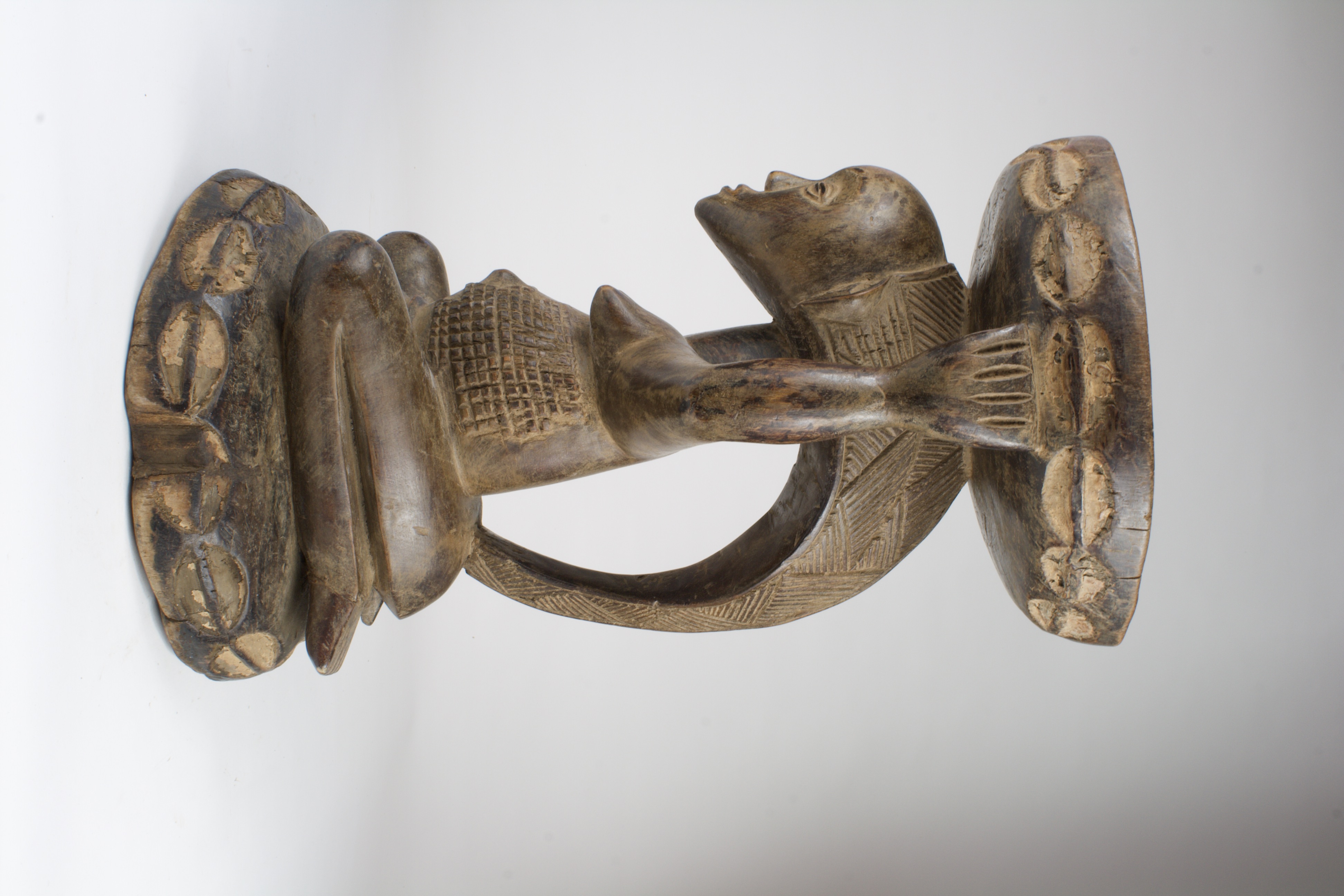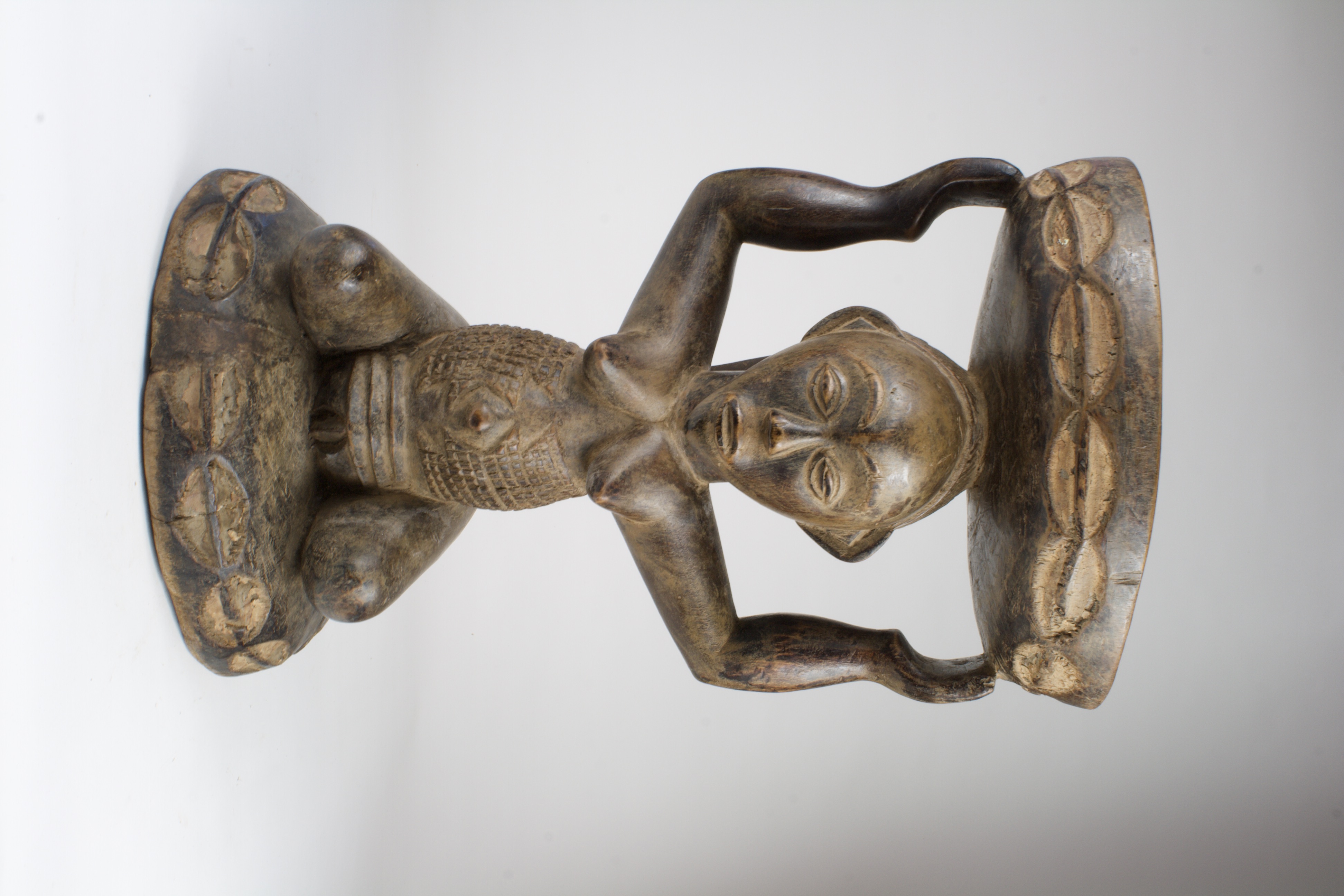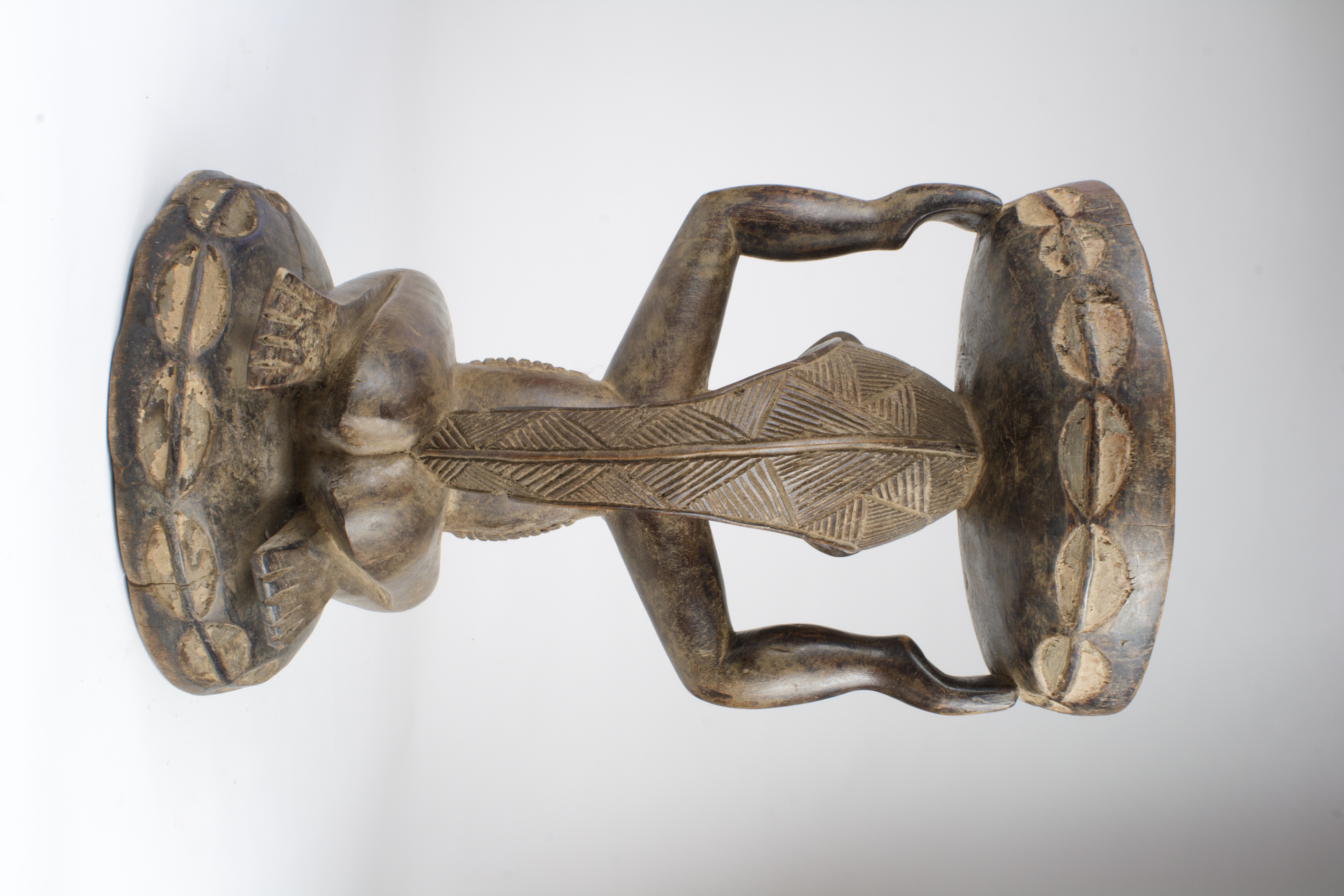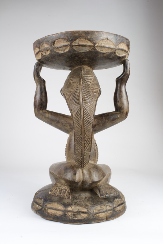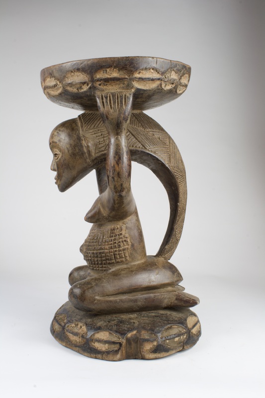 The carved wooden stool has clear characteristics of the Luba style, such as the facial features and seated position. The figure is female with a round abdomen and pronounced navel, decorated with scarification patterns. The base of the stool and round seat supported by the figures arms are decorated with a wrapping pattern depicting cowrie shells. The stool has a functional construction however it was most likely used for decorative reasons, or as a metaphorical seat of kingship for the Luba leadership.