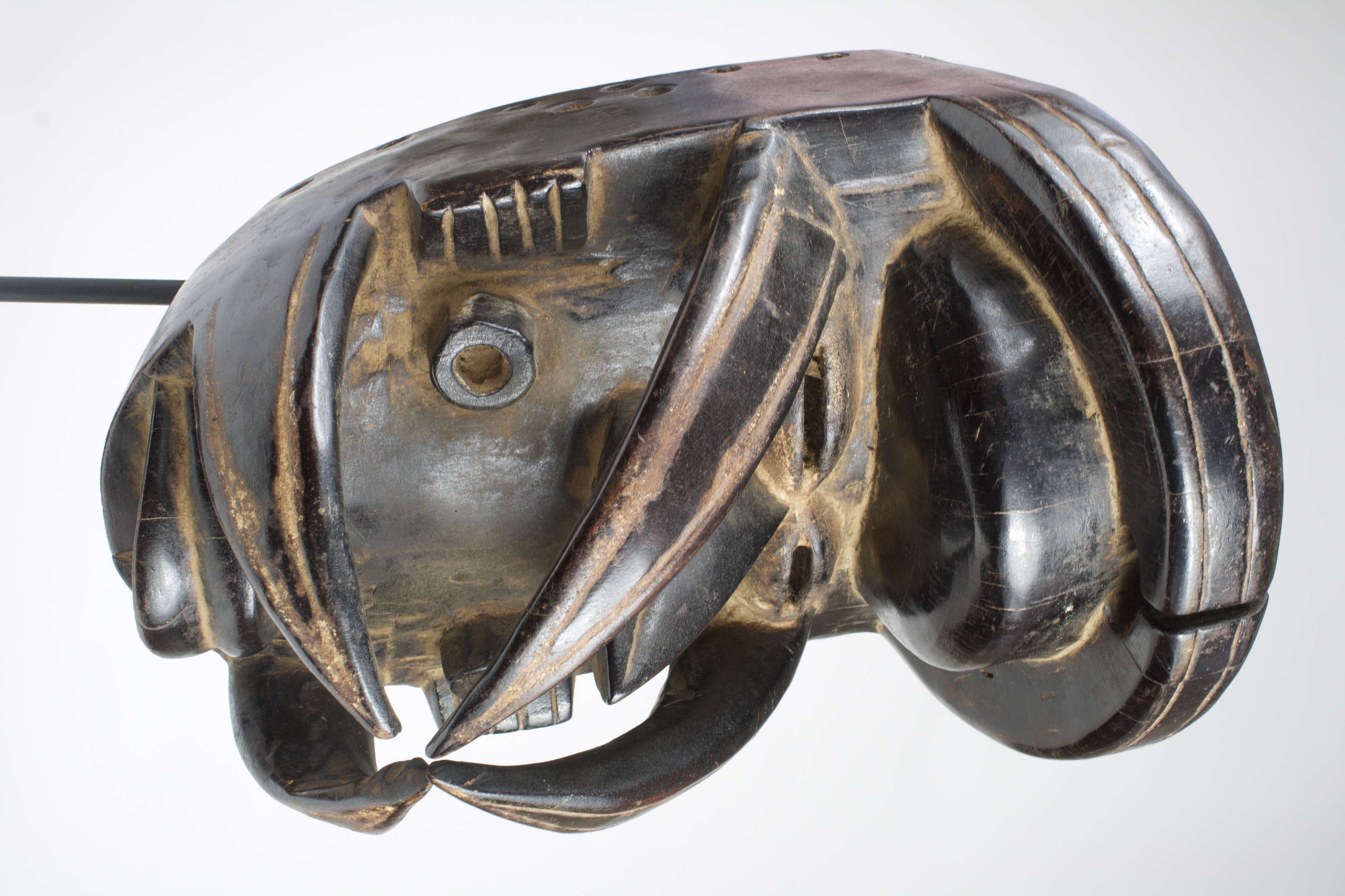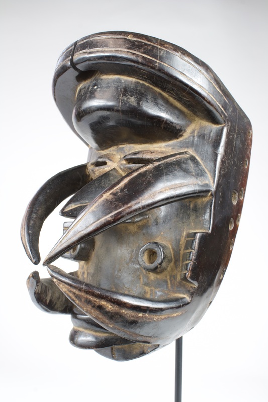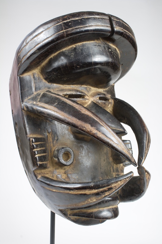 The Gere mask is carved of wood with a thick, dark patina. The forehead bulges forward, with a thin central division. The eyes are formed by narrow horizontal openings under the forehead. The nose and mouth extend forward with sharp angles to compliment the four horns that round inward to the center of the mask. on either side of the face, under the nose, are small holes alongside horizontally incised lines.