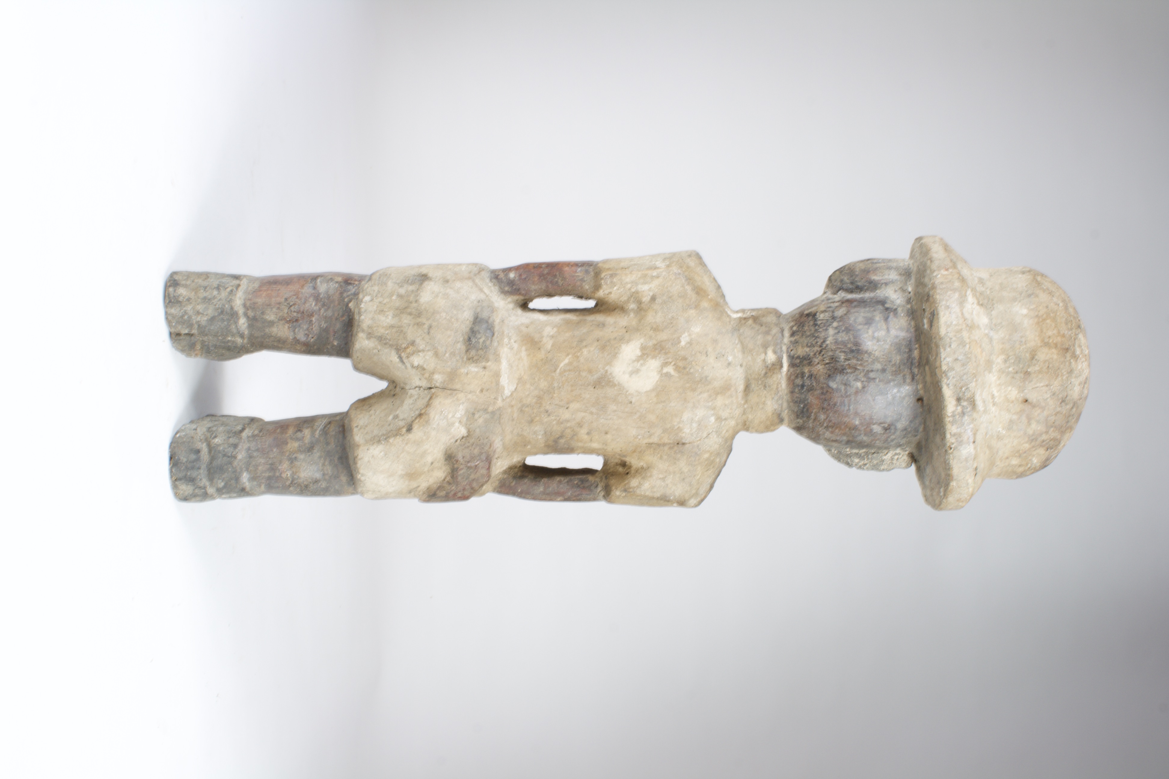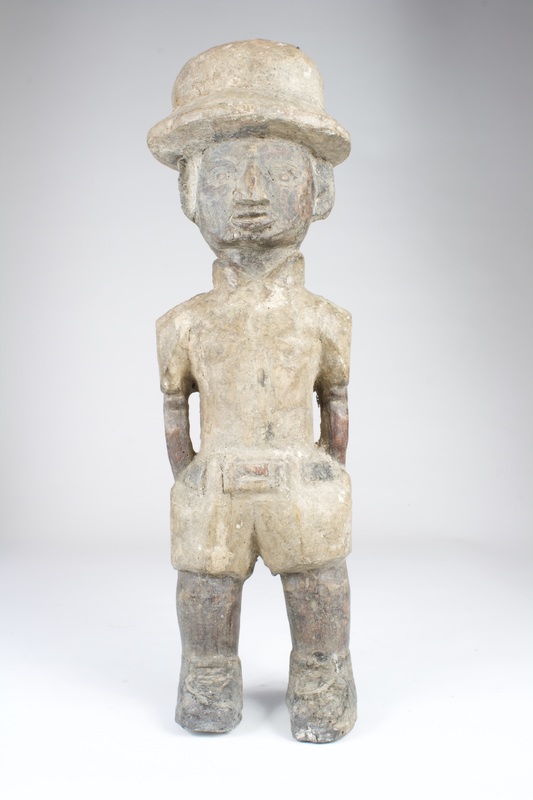 The small, standing colonial figure represents the influence of the European settlers in the Baule area in the early 20th century. The figure is painted to reflect the aesthetics of European attire, such as the large white hat. It was common practice for small standing figures to be made as "spirit lovers", or an ideal vision of a spouse. It is possible that the small colonial figure was created as a spirit lover, that reflected the new societal ideals introduced by the Europeans.