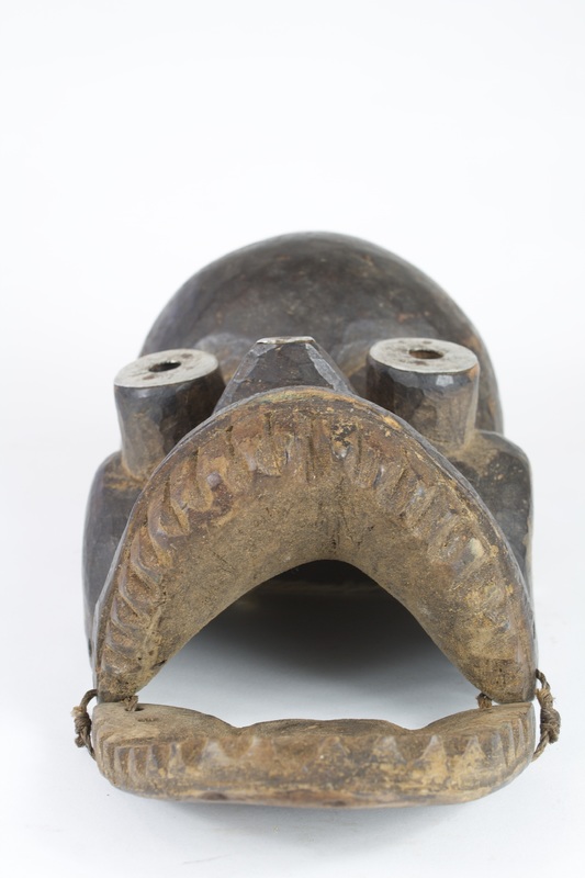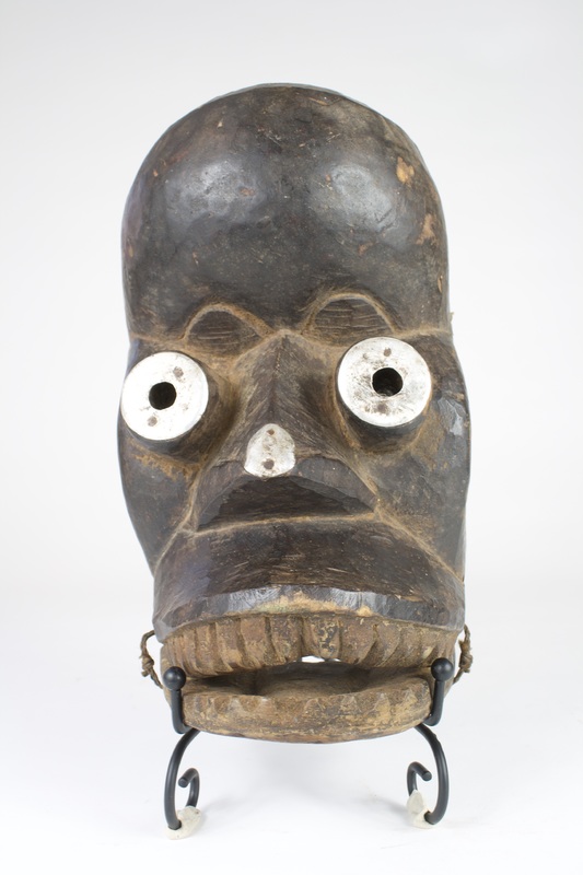 Carved wooden mask, with hinging jaw and round iron forms to represent eyes. The forehead and the upper jaw protrude, to create exaggerated features. The Dan mask may be associated with forest spirits, manifesting their powers. This mask can be grouped into the 11 major types of figures used to represent varying social topics such as education, politics and entertainment.