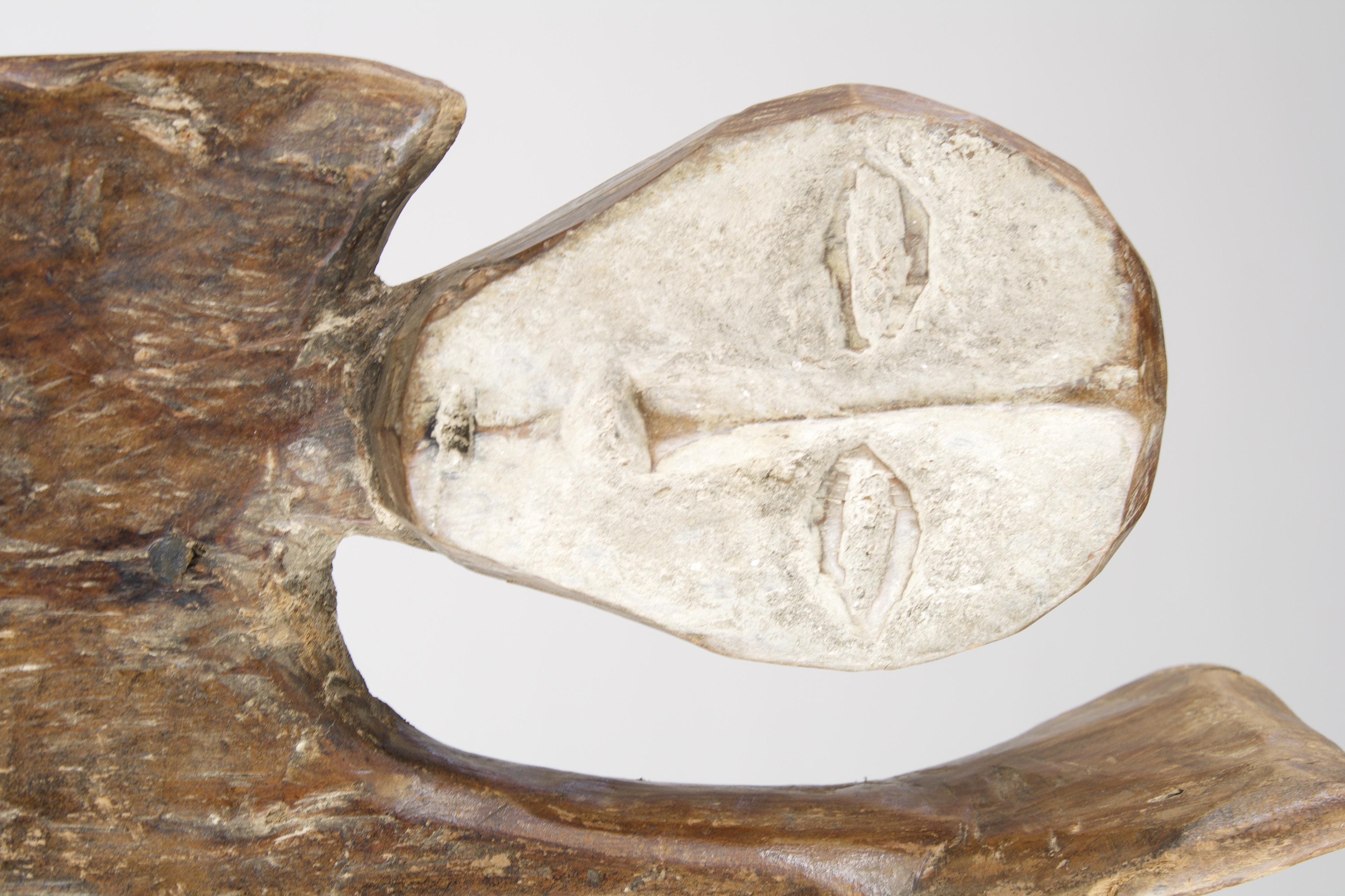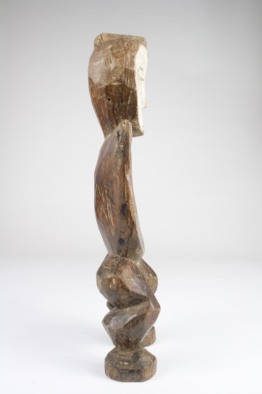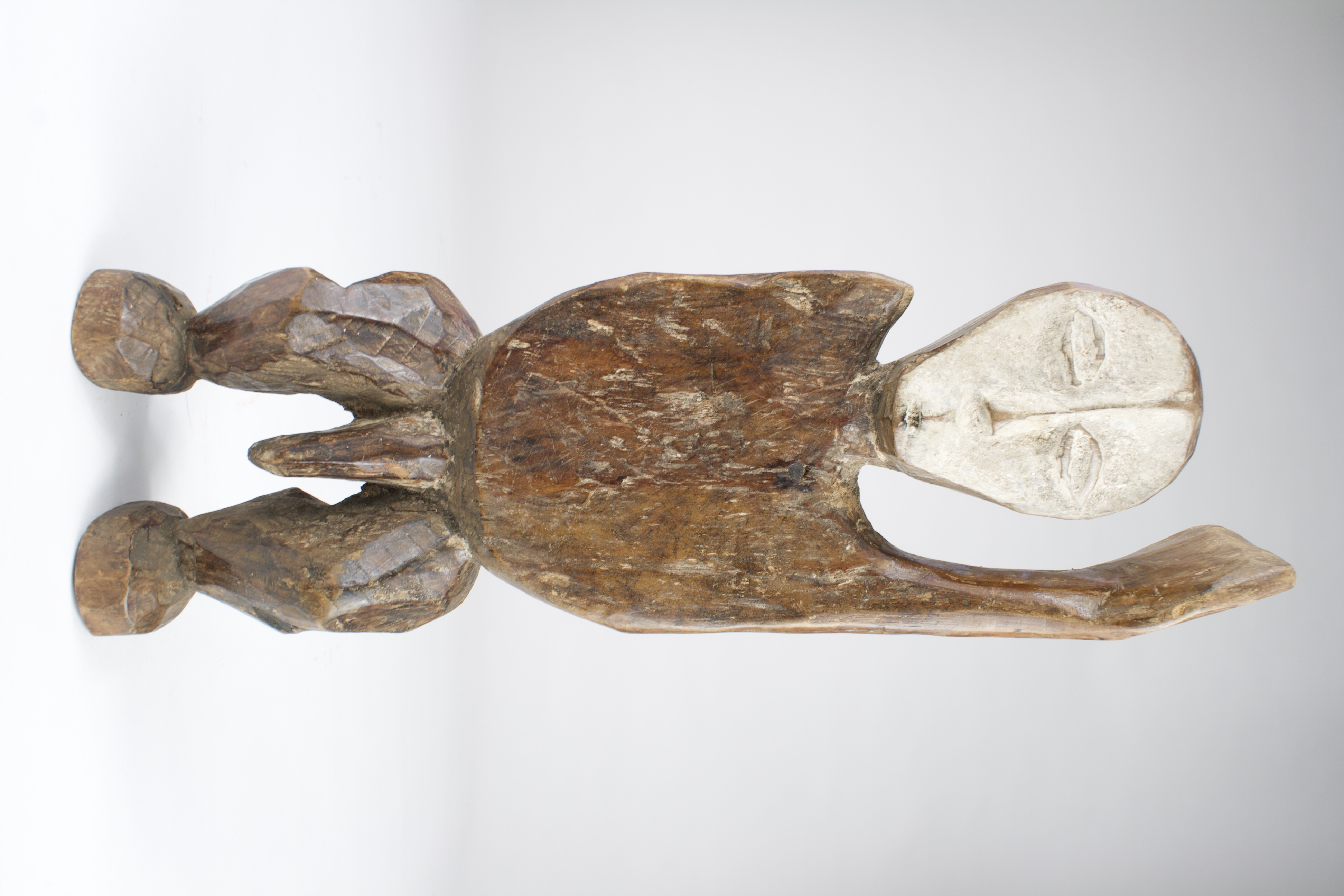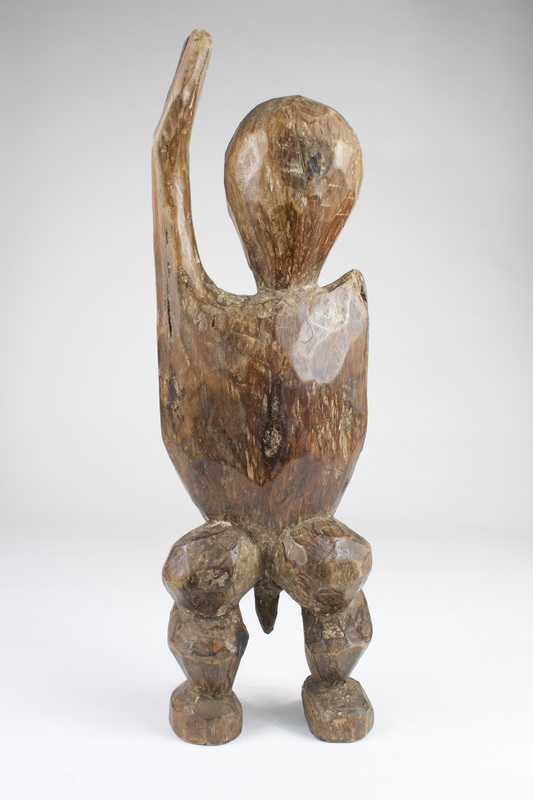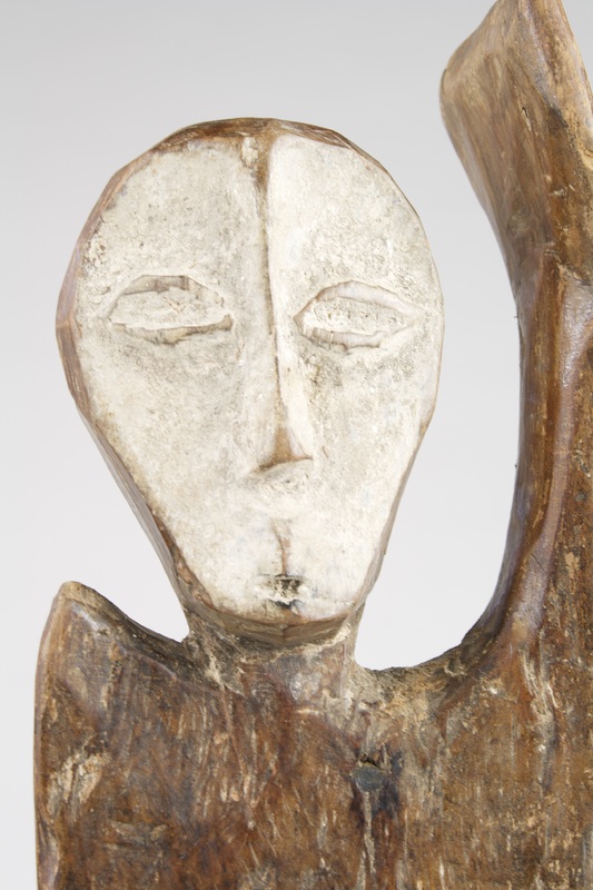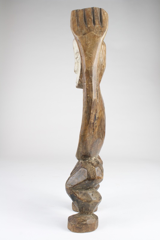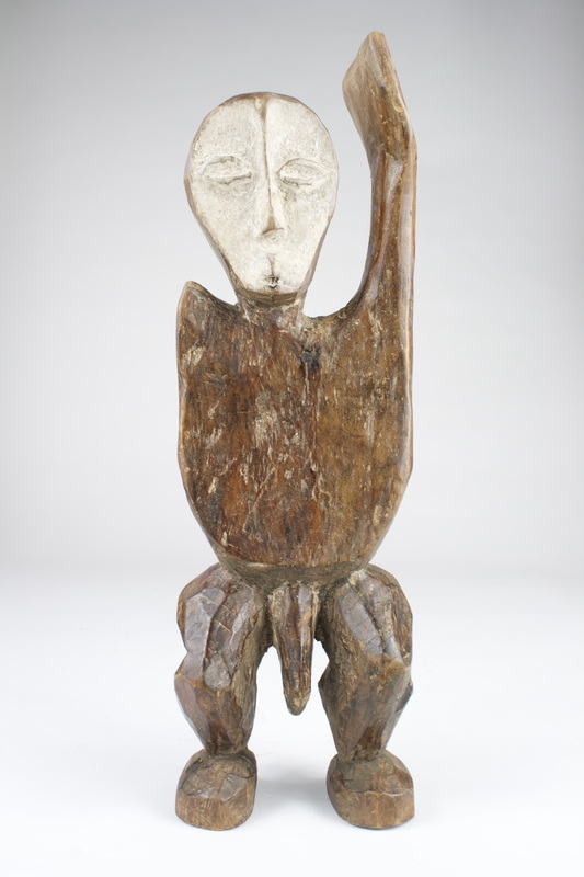 Wooden standing male figure with white kaolin, heart-shaped face. The figure has one arm extended upward and the other appears to have been excluded from the design intentionally.The central abdomen is flat, carved into a board like shape. When used in ceremonies, the figure may have small holes carved into the abdomen. This object would have been within one of two baskets among other wooden figures for initiation ceremonies.
