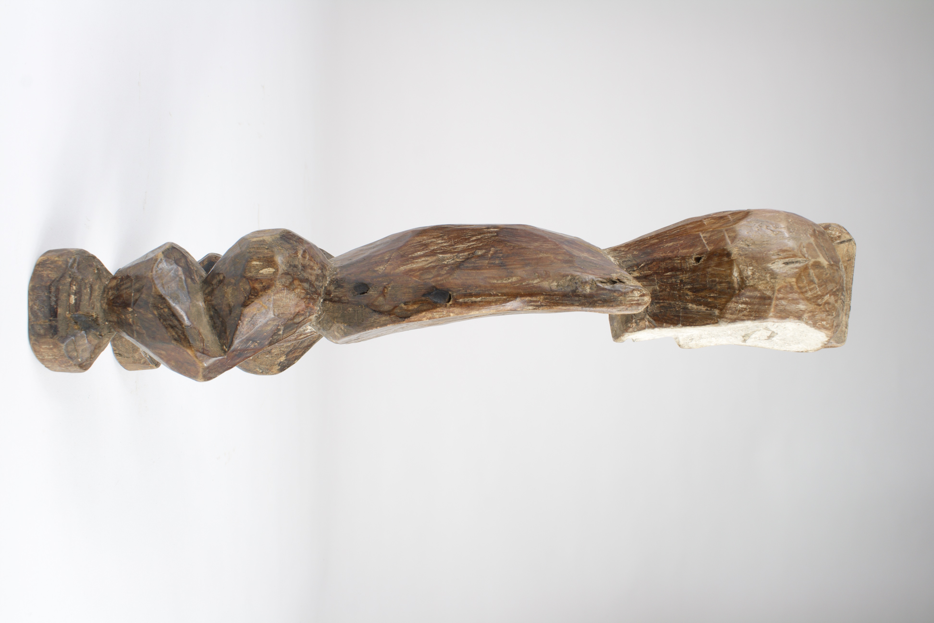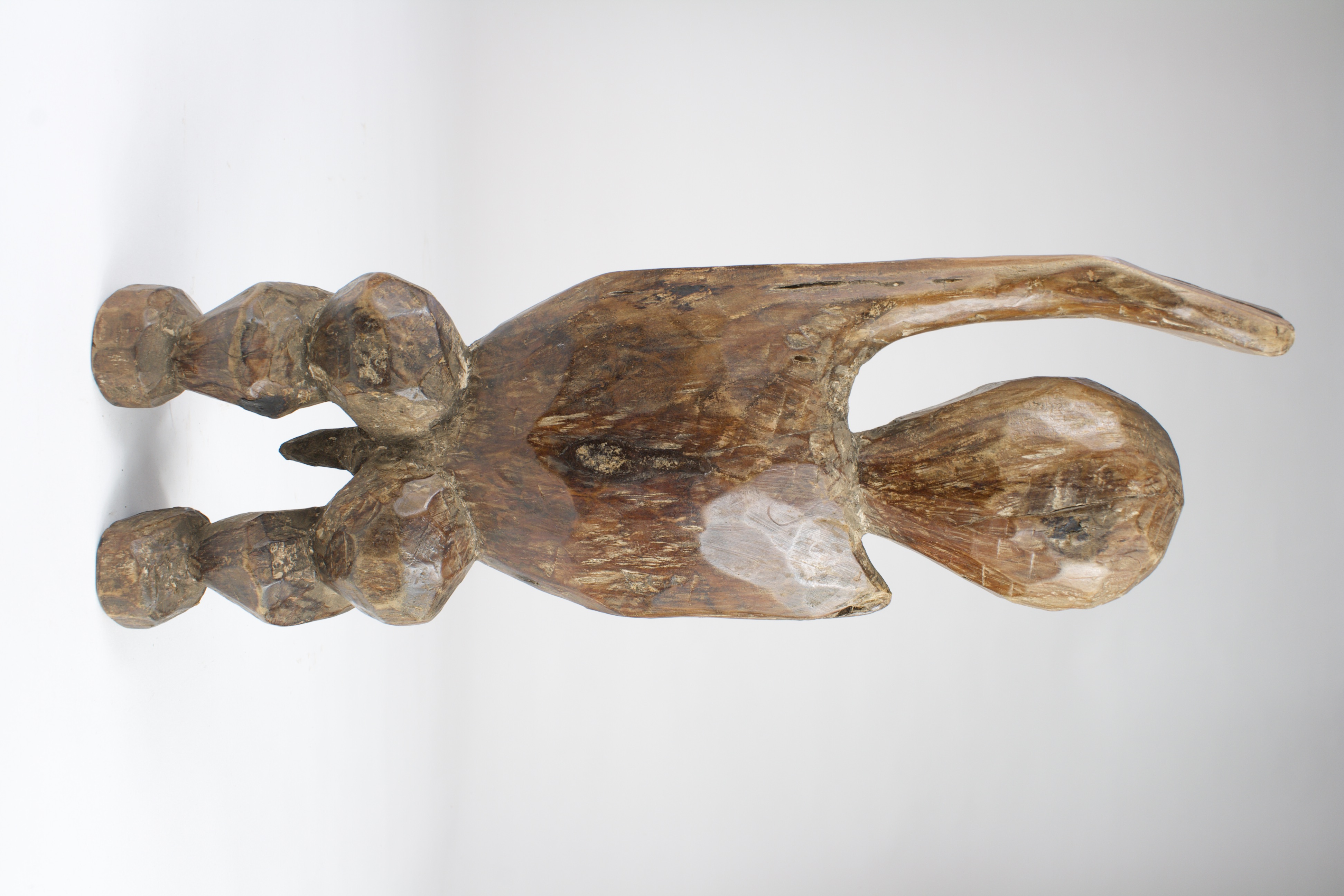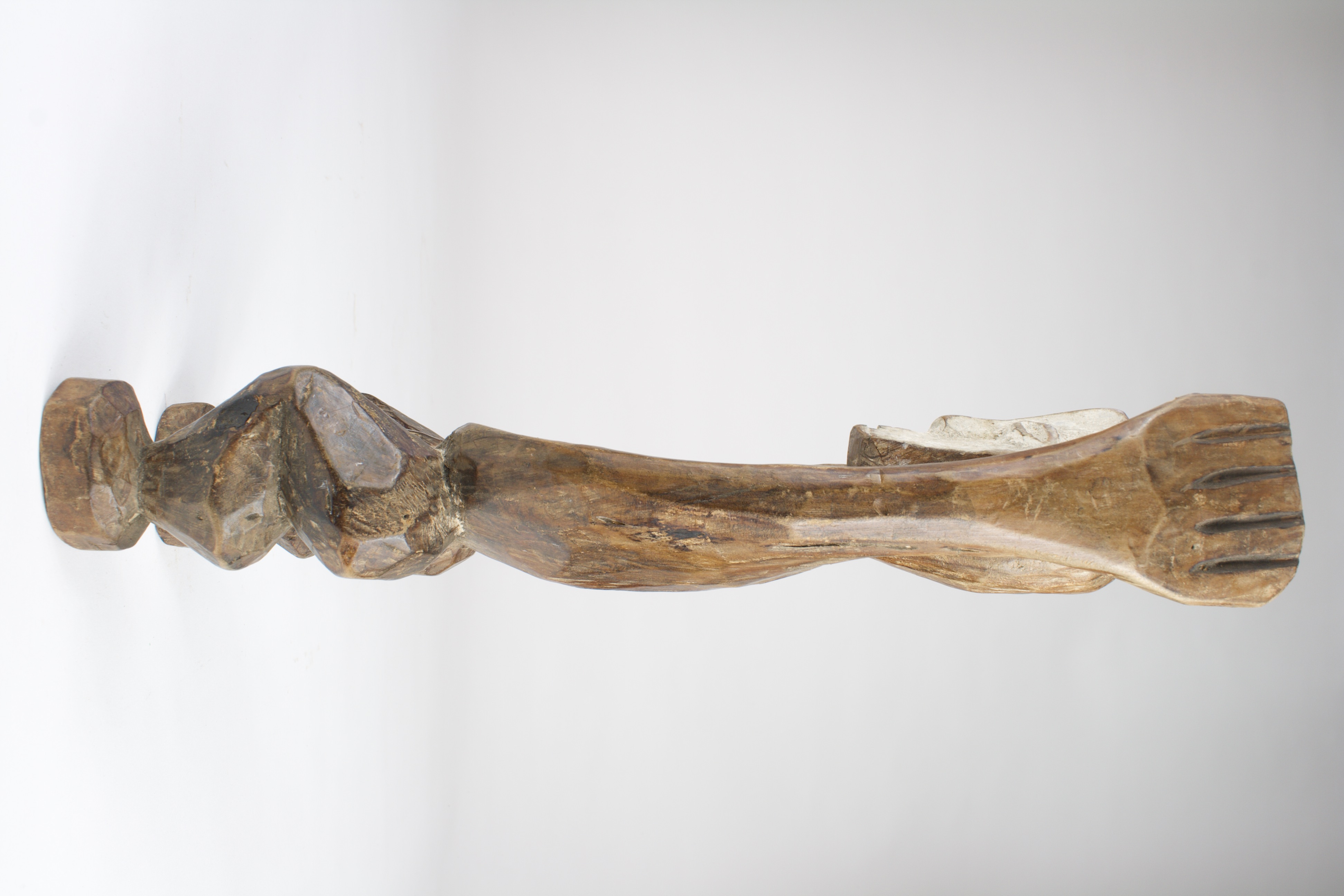 Wooden standing male figure with white kaolin, heart-shaped face. The figure has one arm extended upward and the other appears to have been excluded from the design intentionally.The central abdomen is flat, carved into a board like shape. When used in ceremonies, the figure may have small holes carved into the abdomen. This object would have been within one of two baskets among other wooden figures for initiation ceremonies.