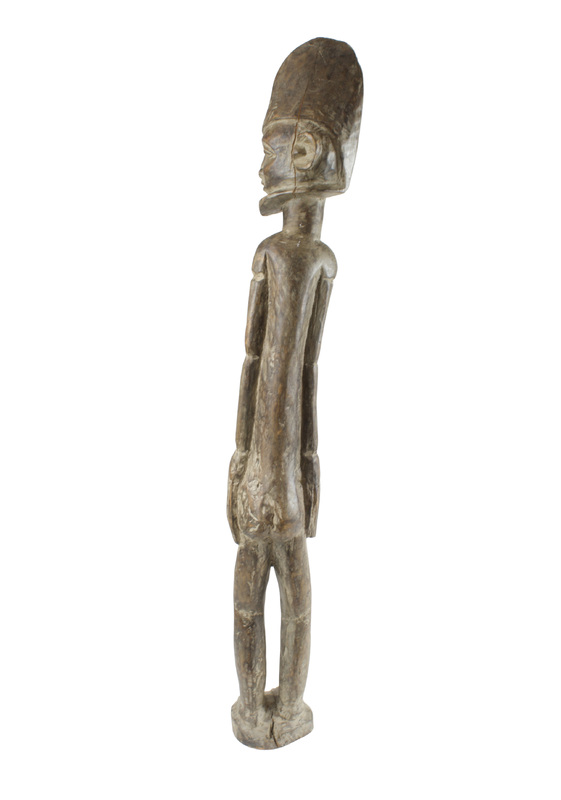 The male figure is carved from one piece of wood, as if stemming from the rounded base beneath its feet. The figure is thin with a vertical emphasis. Common characteristics of Dogon sculpture can be seen through the bend in the knees and the turned head. Carved statues such as the one pictured were often ancestral figures placed on altars.
