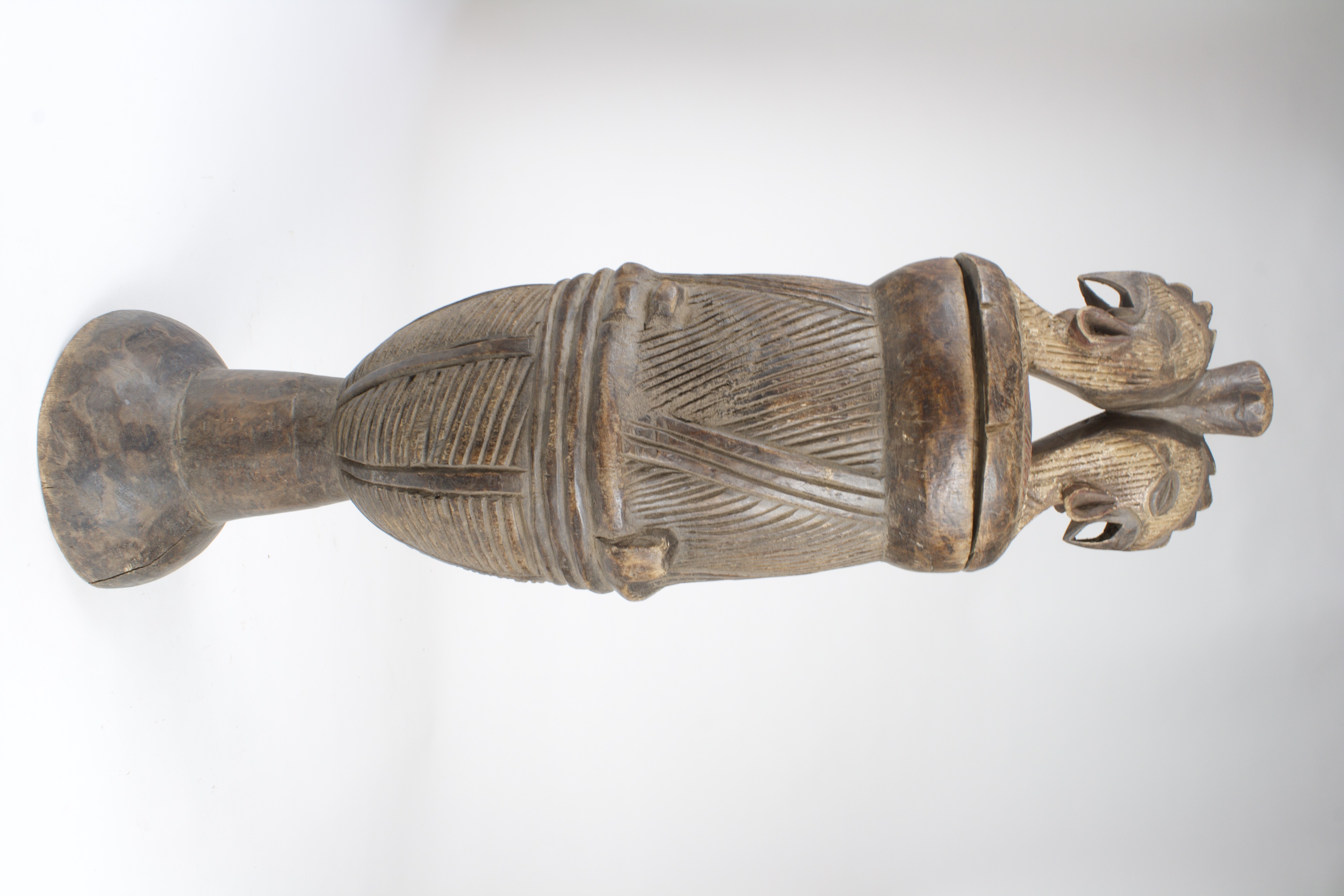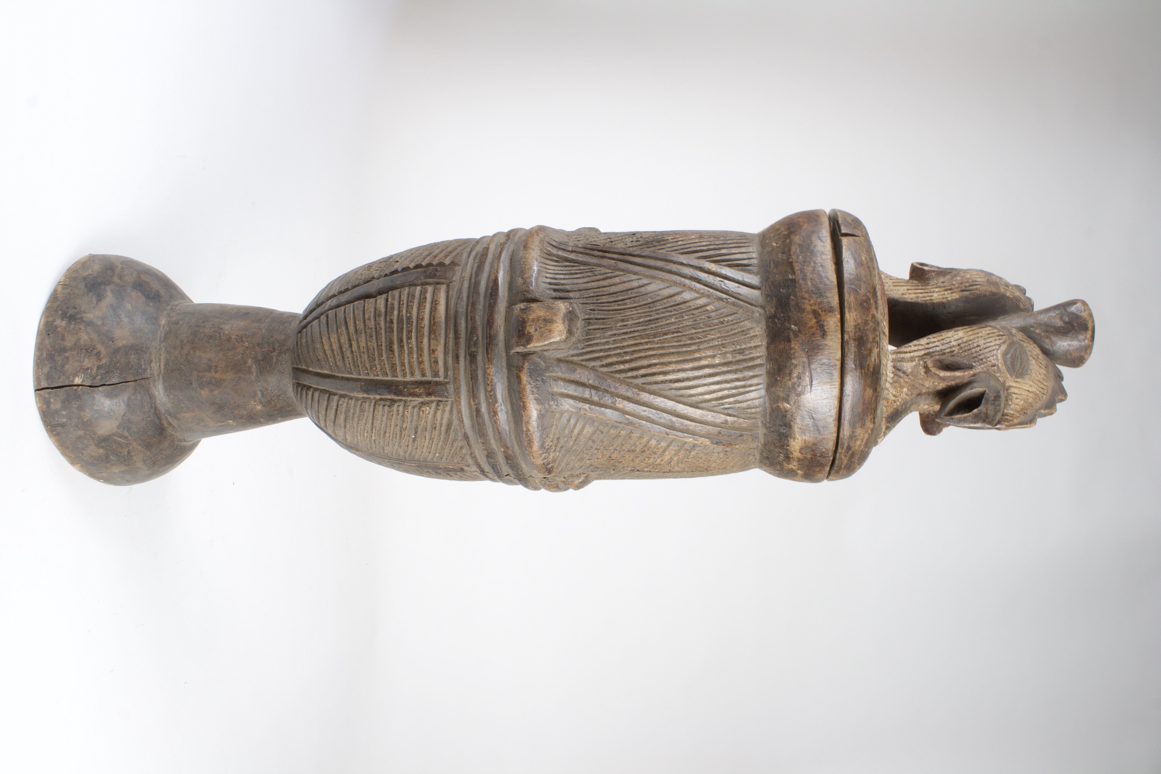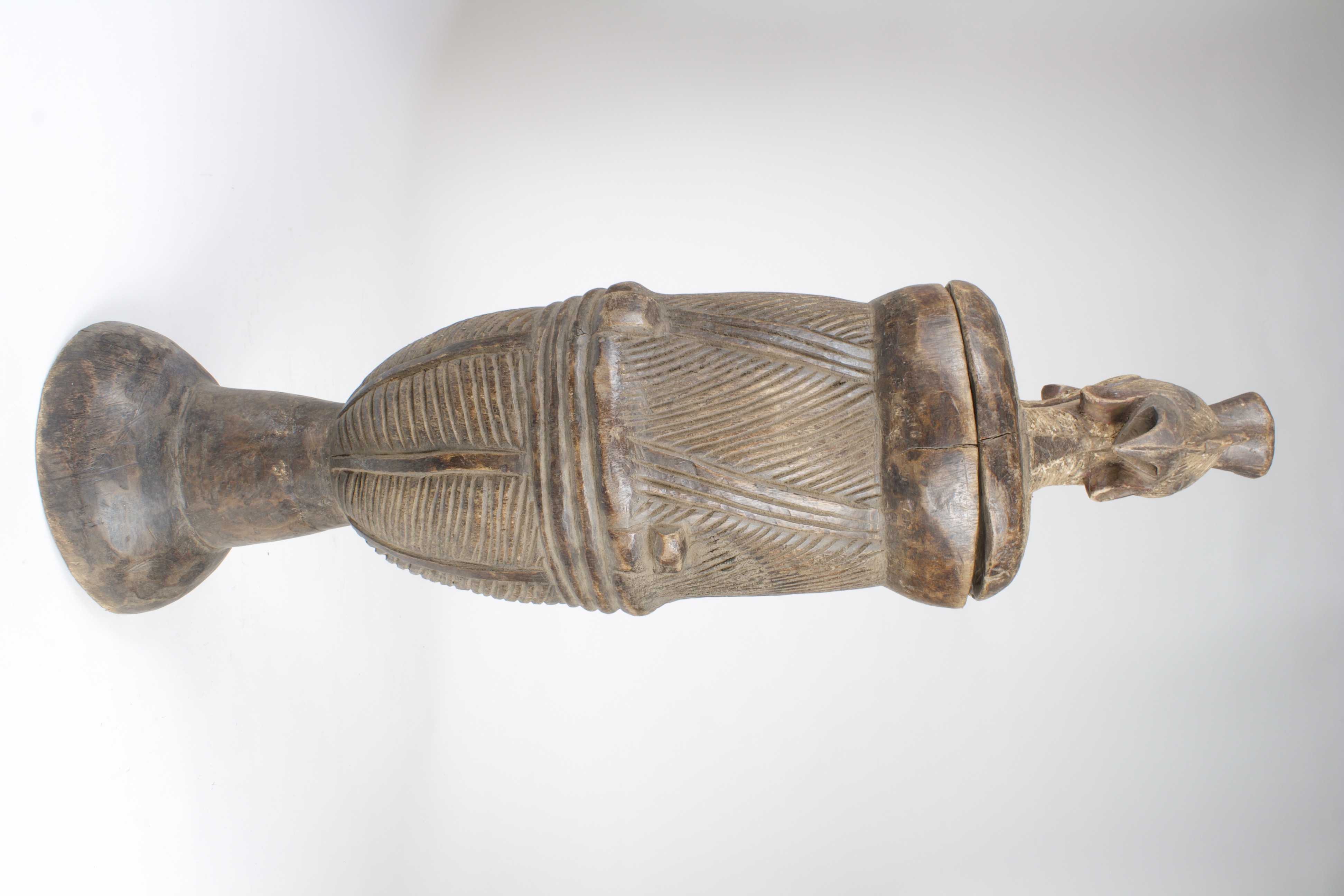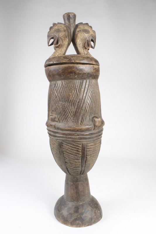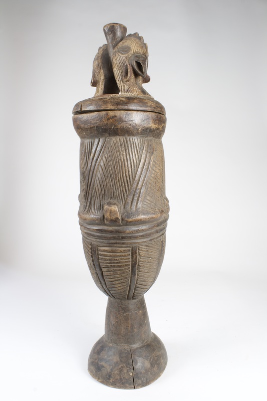 The large vessel is carved of wood with a dark patina, along with red pigment and white kaolin on the surface. Thinly incised lines cover the surface of the vessel creating intricate patterns. The lid has two busts of a chicken on either side of a cylindrical handle. The chicken may be in reference to animal sacrifice, as the killing of the chicken during rituals was commonly understood to protect from illness and other troubles.