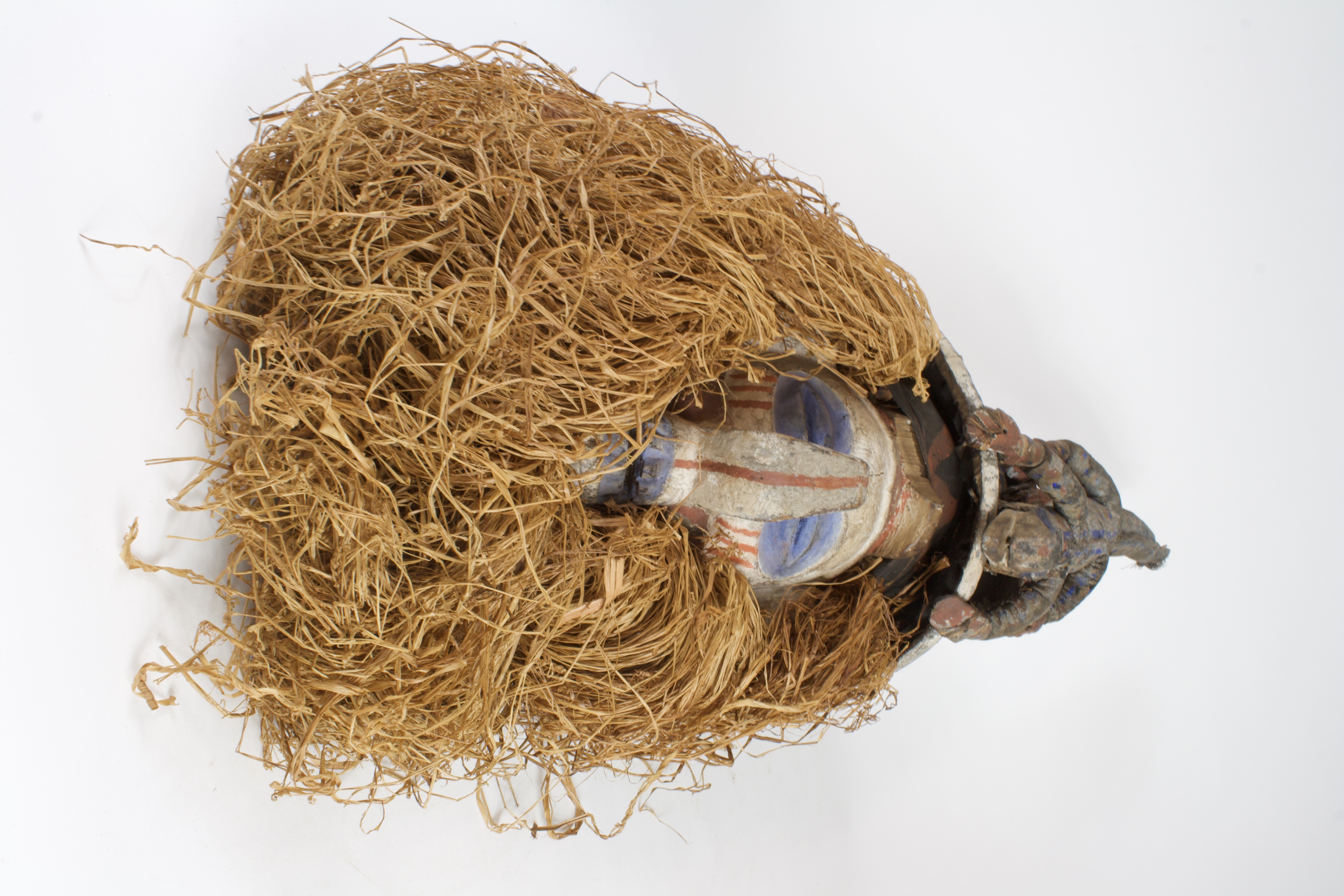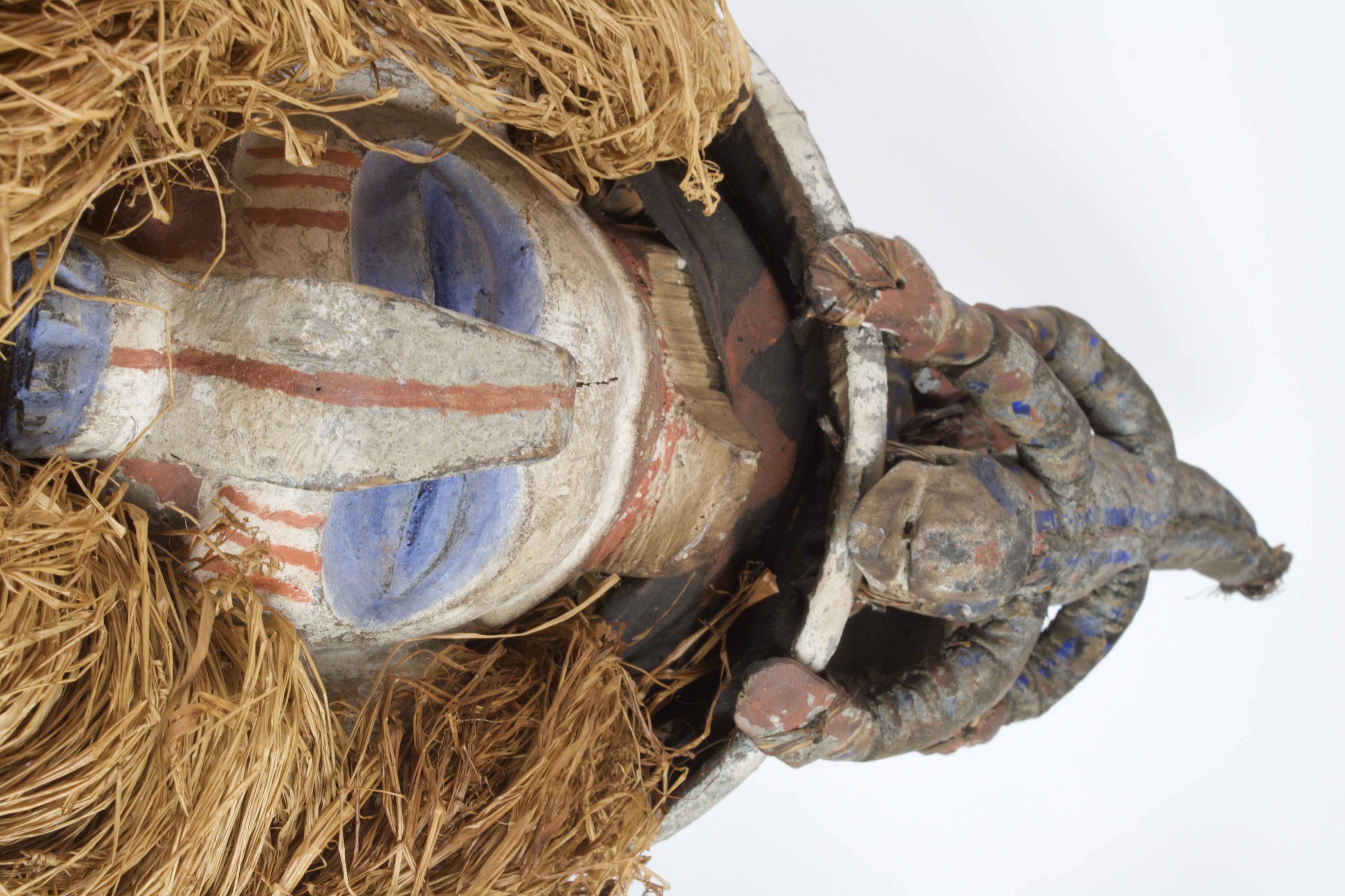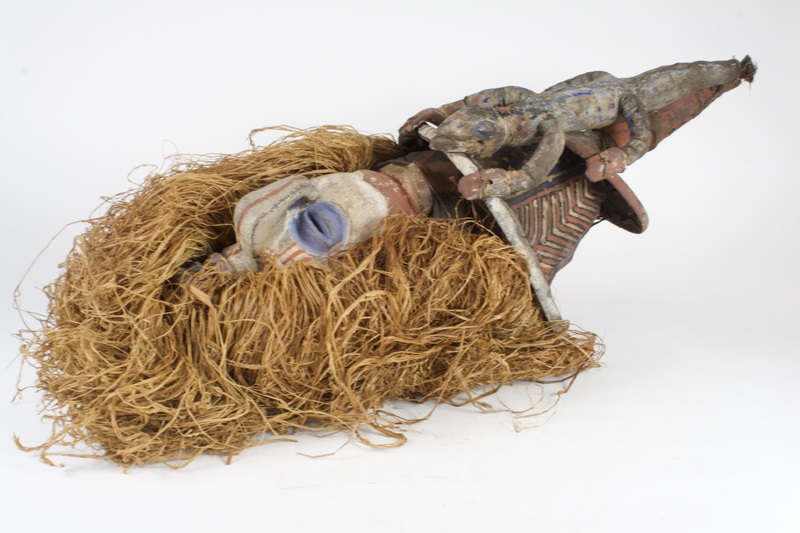 The Yaka "kholuka" mask is carved of wood with raffia surrounding the head. The nose is turned upward, the mouth is open with individually articulated teeth, and the face is brightly painted creating an expressive image. This facial construction is used to depict Yaka sexualtiy and spirituality. Atop the head is lizard constructed of tightly joined fabric pieces, covered in pigment of similar coloration to the face. The mask is representative of those used during initiation rituals like the "n-khanda" ceremony marking the transition from boy to man.