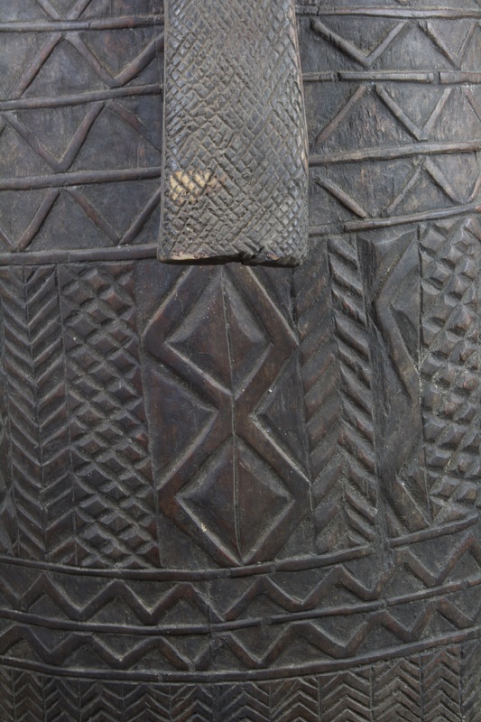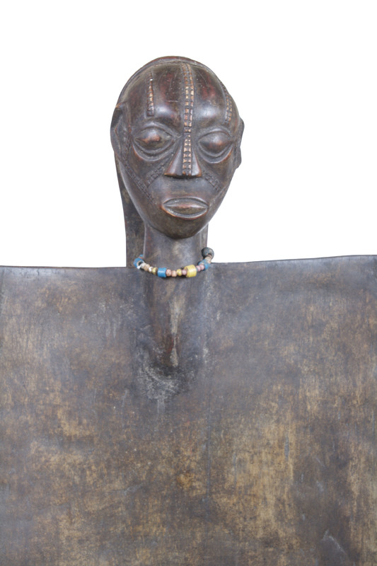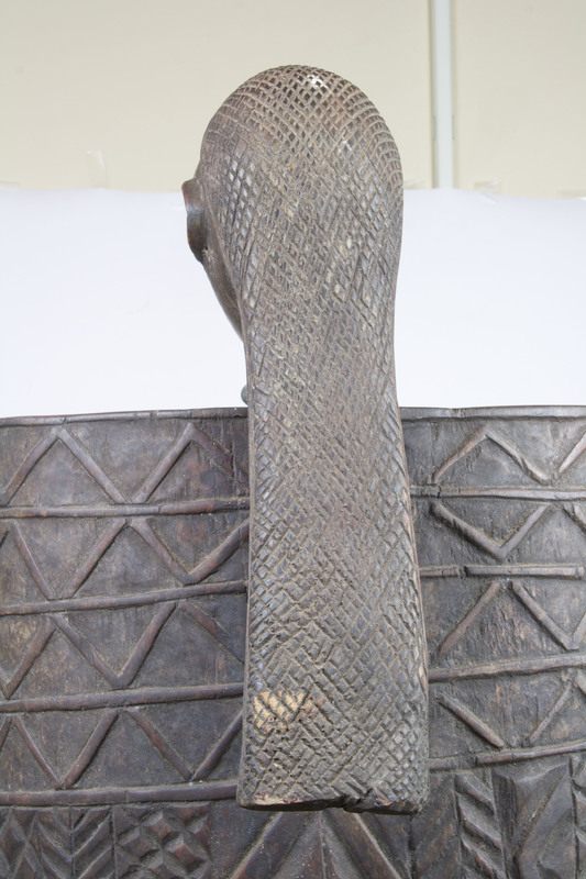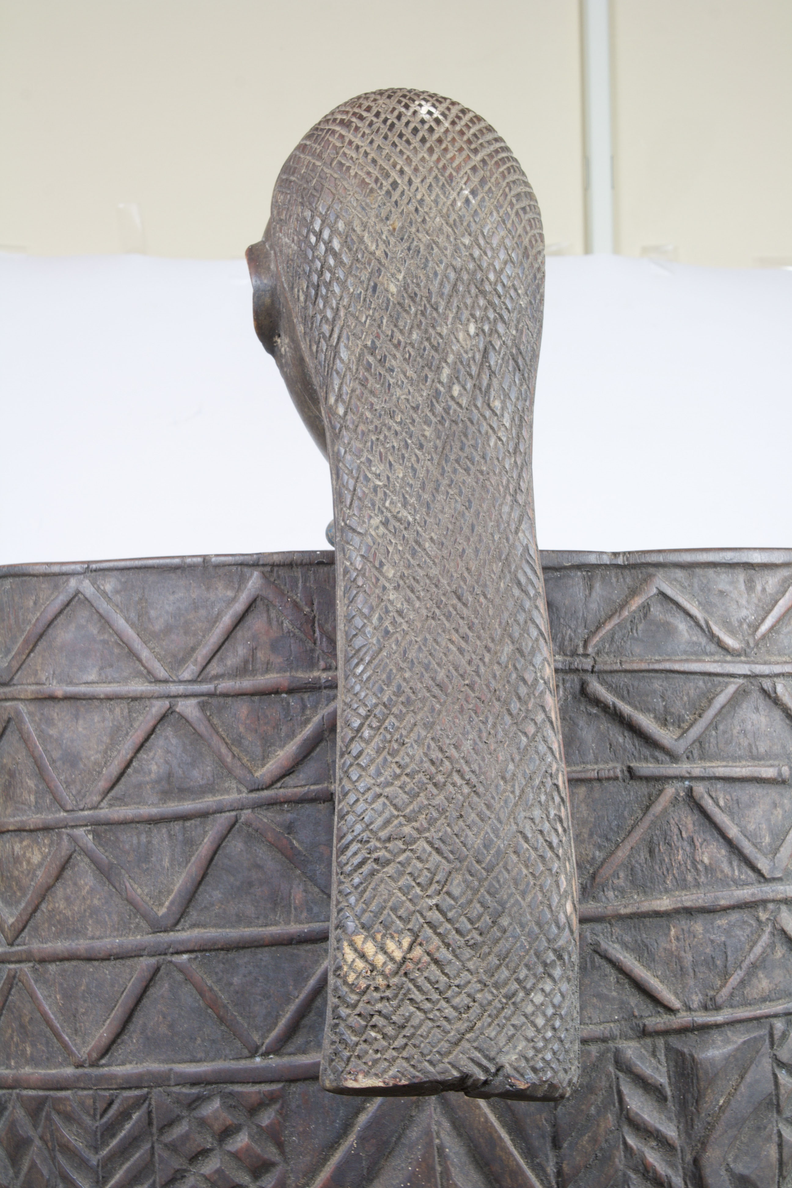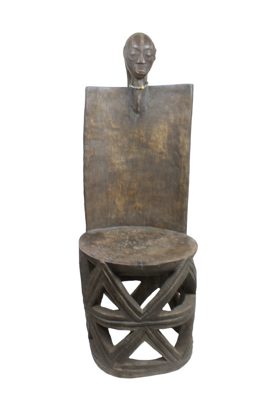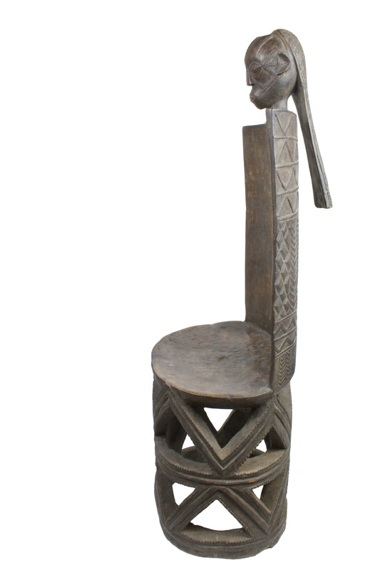 The Tawba ceremonial chair is highly decorated with triangular patterning surround the base of the chair and back side. The bust at the top of the seat has thinly carved scarification patterns and a stylized coiffure. The neck of the bust blends seamlessly into the seat, connecting the two objects as one. The seat has several marks and scratches, showing the chair was most likely functional as well as decorative.