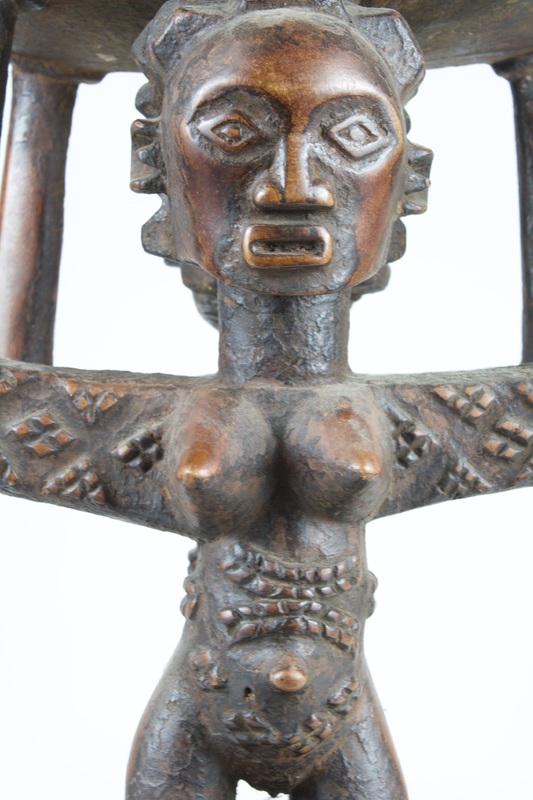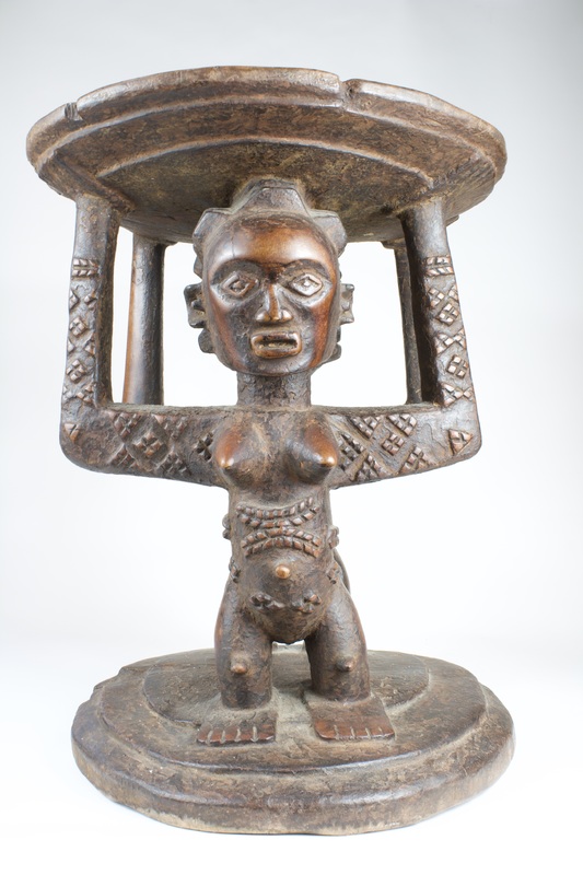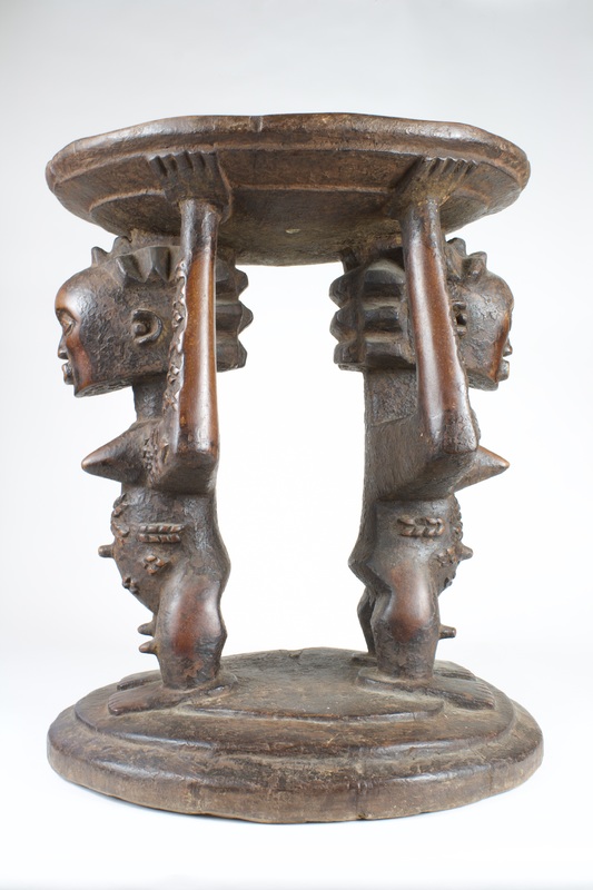 A prestige stool depicts two identical female figures with their arms raised and facing outward. Their prominently stylized breasts and scarification along their extended arms highlight the female body's vital role as a spiritual vessel that embodies divine kinship in Luba society. The artistic refinement of the female form through intricate skin decoration and hairstyle symbolizes the civilization and sophistication that Luba rulers promote within their community. Although it was designed as a stool, it has also been used as a sacred emblem stored in a king's palace.