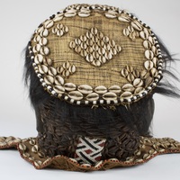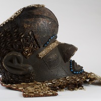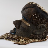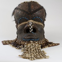 Wooden and metal Bwoom Mask with a bulging forehead and blindfolded eyes. The mask is fitted with large nostrils for the masker to see through at a diagonal angle. A long false beard is attached to the mask, decorated in cowrie shells and beads. The Bwoom mask is worn in rituals detailing the origin myths of the Kuba Kingdom. In these rituals the Bwoom mask is accompanied by masks of the creator of the dynasty, Woot, and his spouse. Bwoom may represent either the younger brother of Woot, or a commoner within the society.