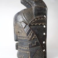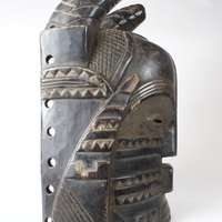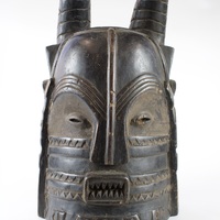 A darkly patinated, wooden Biombo helmet mask with two horns curving forward. The mask is decorated with geometric shapes that resemble scarification patterns. Surrounding the horns are incised lines representing a hairstyle, forming a hatched pattern. The narrow eyes and rounded lines arching over the sockets, along with the shape of the mouth and scarification are common motifs of the Biombo style.