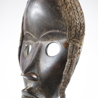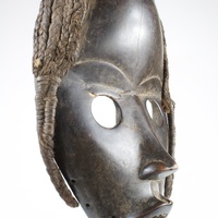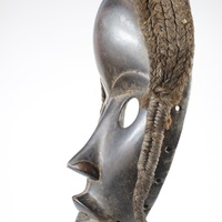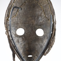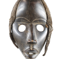 The wooden Dan mask has a large, bulbous forehead that moves downward to a narrow chin. The eyes are formed by large carved circles, which may identify this mask as a Gunye Ge mask used in foot racing competitions to be worn by the champion. Human hair has been braided and threaded through the small holes along the edge at the top of the mask. Similar small holes can be seen on the chin, potentially used to attach other facial hair or adornments.