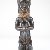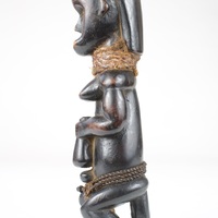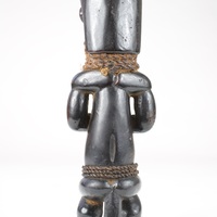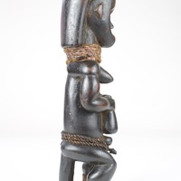 A seated wooden figure holding a small vessel with arms and legs wrapped in rope.The Byeri, or reliquary guardian figure, has supernatural properties that ward off evil spirits and bring good fortune. The figure has a calm expression yet is carved to depict strength through the detail of musculature.
