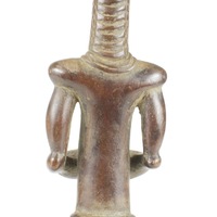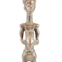 The carved wooden female ancestor or power figure is highly decorated with scarification patterns and incised lines marking the collar necklace and loin cloth. The figure may be a representation of the "Mupaki wa manga" power figure, protecting from and controlling otherworldly forces.