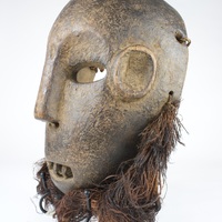The carved mask has a rough surface with remnants of natural materials pressed into the wood. Along the chin, raffia has been woven through hollowed grommets. The facial features are minimalistic, with little detail in the eyes and nose. Lining the upper lip are small teeth, potentially from a small animal. Round ears rest on either side of the mask, creating a symmetrical face.