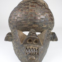 The Salampasu Mukinka mask has various recognizable features such as the bulging forehead, sunken eyes and sharp teeth. The mask is covered in copper plates, forming a hard surface. The mask was to be worn during ceremonies honoring brave warriors.