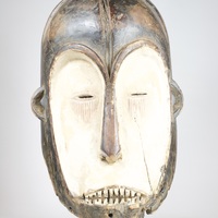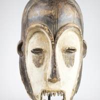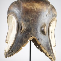 The large helmet mask is a type of Fang Ngil mask, recognizable by the usage of white kaolin to paint the face. The mask has two mirrored sides, both depicting a long heart shaped face. A thin, elongated nose divides the face in half connecting to the rounded brow bones above the eyes. The mouth is wide with rows of teeth protruding. Detailed lines have been carved into the top of the head in the patinated wood to resemble scarification patterns. The ngil masks were most likely worn by a male society during the initiation or reprimanding of members. The white kaoli may be in reference to the power of the ancestors.