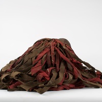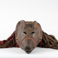 The mask is known as Mwana Ngulu, representing a domesticated pig. There is a coin on top of the head with an inscription, potentially regarding familial connection. The back of the head is full of fabric strands that are covered in other materials that remain from ceremonies. The Mwana Ngulu mask is used in coming of age rituals, or the passage into adulthood in the Chokwe society. The masker aims to portray a domesticated pig through dance; some Mwana Ngulu masks are created to have voice modifying qualities that allow the masker to sound like the animal.