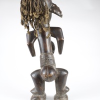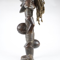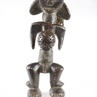 Standing male figure with a round, porous protrusion on the abdomen. The figure is coated in a dark patina, with a stylized coiffure of raffa rope. Iron pins decorate the body and face, along with rope wrapped around the waist and neck covered in the dark patina. The face has a round forehead that reaches beyond the flatter, frontal facial plane.