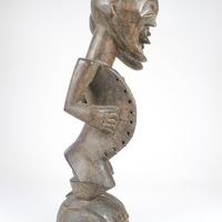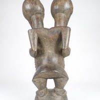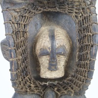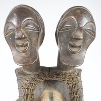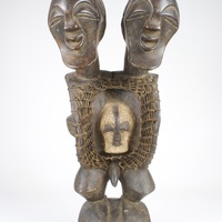 The two headed figure has clear motifs of the Songye style, such as the bulging forehead, narrow eyes, jutting chin and angular posture. The janiform statue is a Nkishi power figure, used to for protection and healing. In the center of the chest, a female kifwebe mask can be seen painted with white and black kaolin. The presence of the kifwebe mask suggests that the power figure may also be used for funerary, initiation or fertility purposes as well.