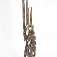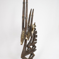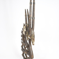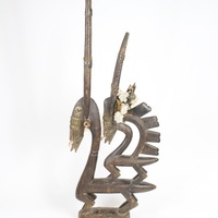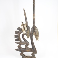 The large headdress resembles the form of an antelope, pangolin, and aardvark referring to the mythic Ci-Wara figure. In the Bambara culture, Ci-Wara was believed to have introduced humans to various aspects of nature and agricultural practices. During ceremonies celebrating the skills of successful farmers, two headdresses, one male and one female, are worn. Both male and female headdresses together signify the importance of unity for maintaining a strong community. The male Ci-Wara headdress has a large, narrow and long face decorated with metal plates and patterning. Cowrie shells have been added to the Fabric and small metal bells are attached towards the base of the tall horns, Rounded forms mimic the curve of the neck, radiating outwards. The body is low, with four short legs. The headdress emphasizes positive and negative space through its silhouette forms.