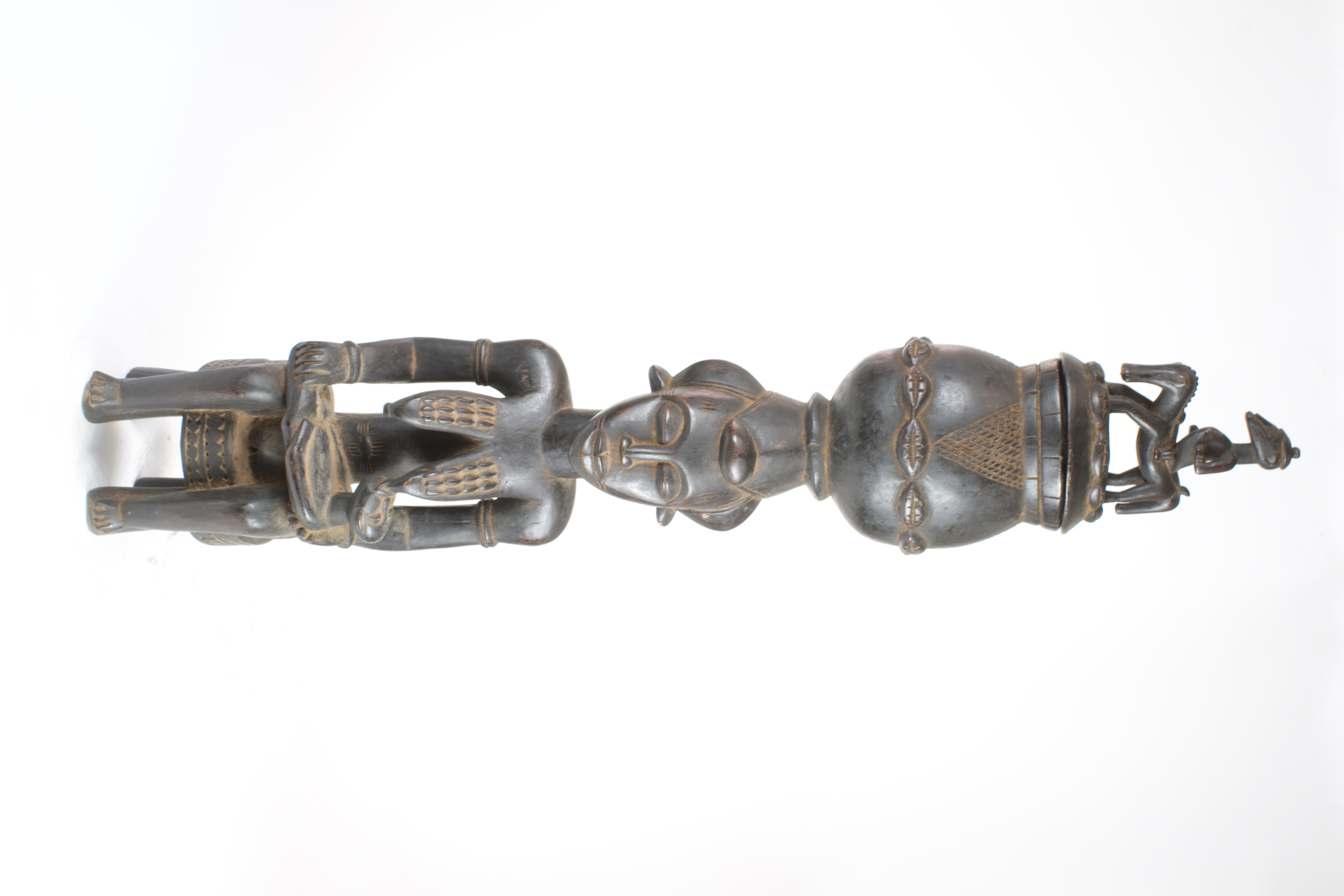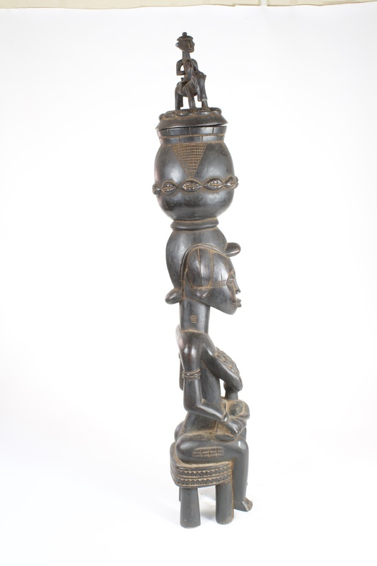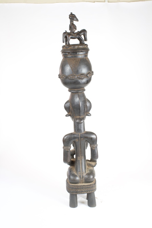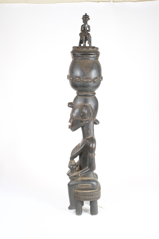 A sculpture depicts a seated maternity receptacle with a lid that features an equestrian figure. A seated female figure shows various scarifications on her breasts, where a baby is suckling to sustain his vitality. A line of a conch shell decorates the surface of a receptacle vessel. All these detailed elements are symbols of fertility. Although Senufo society is patriarchal, inheritance passes through the matrilineal line. The importance of maternity is generally reflected in the sculpture's content.