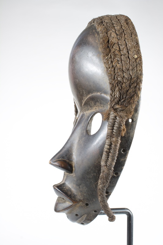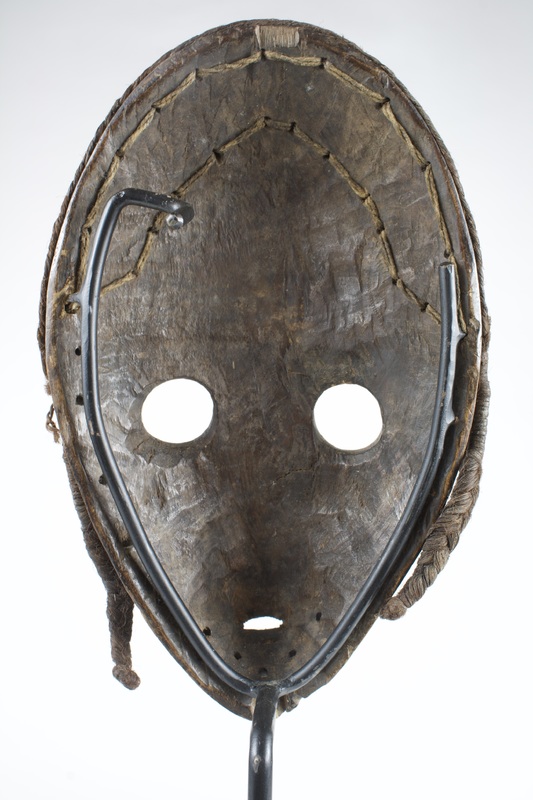 The wooden Dan mask has a large, bulbous forehead that moves downward to a narrow chin. The eyes are formed by large carved circles, which may identify this mask as a Gunye Ge mask used in foot racing competitions to be worn by the champion. Human hair has been braided and threaded through the small holes along the edge at the top of the mask. Similar small holes can be seen on the chin, potentially used to attach other facial hair or adornments.