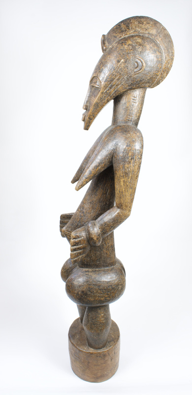 A large female figure with prominent genitals and hands near her belly reaching outward. This pose almost depicts her ability to bear children. Three linear scarifications are carved into her belly, roughly resembling the four cardinal directions. The same three-line scarifications are also engraved on her breasts and cheeks. This type of sculpture is used as a tool to secure ancestral blessings and was commissioned by Senufo diviners as intermediaries between the spirit world and the living.