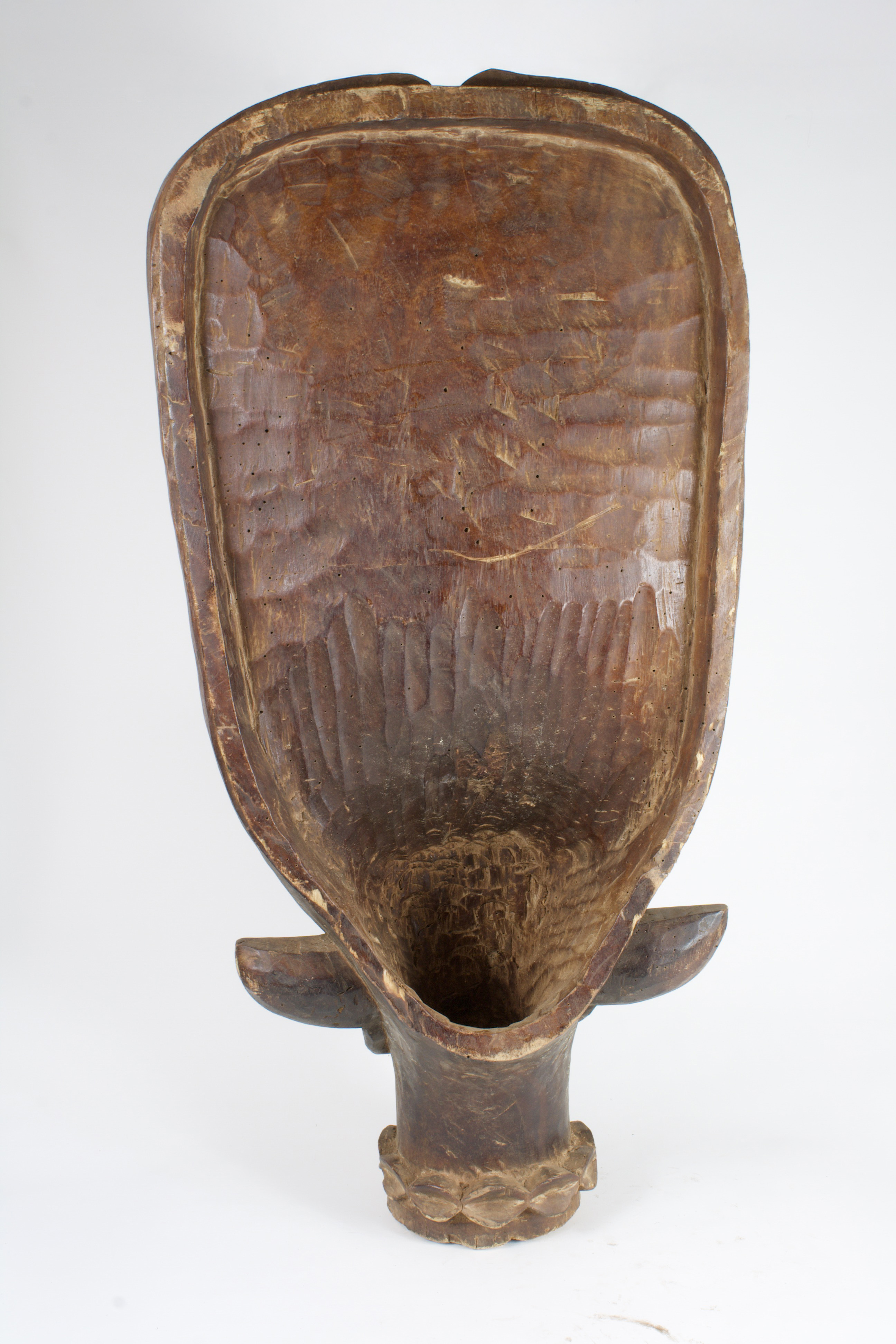 The large batcham mask is carved of wood with incised lines detailing patterns along the vertical panel on the crest. Eyes bulge forward on either side of a wide, long nose with flared nostrils. The mouth is large and rounded with thin vertical lines. Seen from the back of the mask is a hollow round cavity. The mask was to be displayed during funerary ceremonies or the appointment of a new chief.