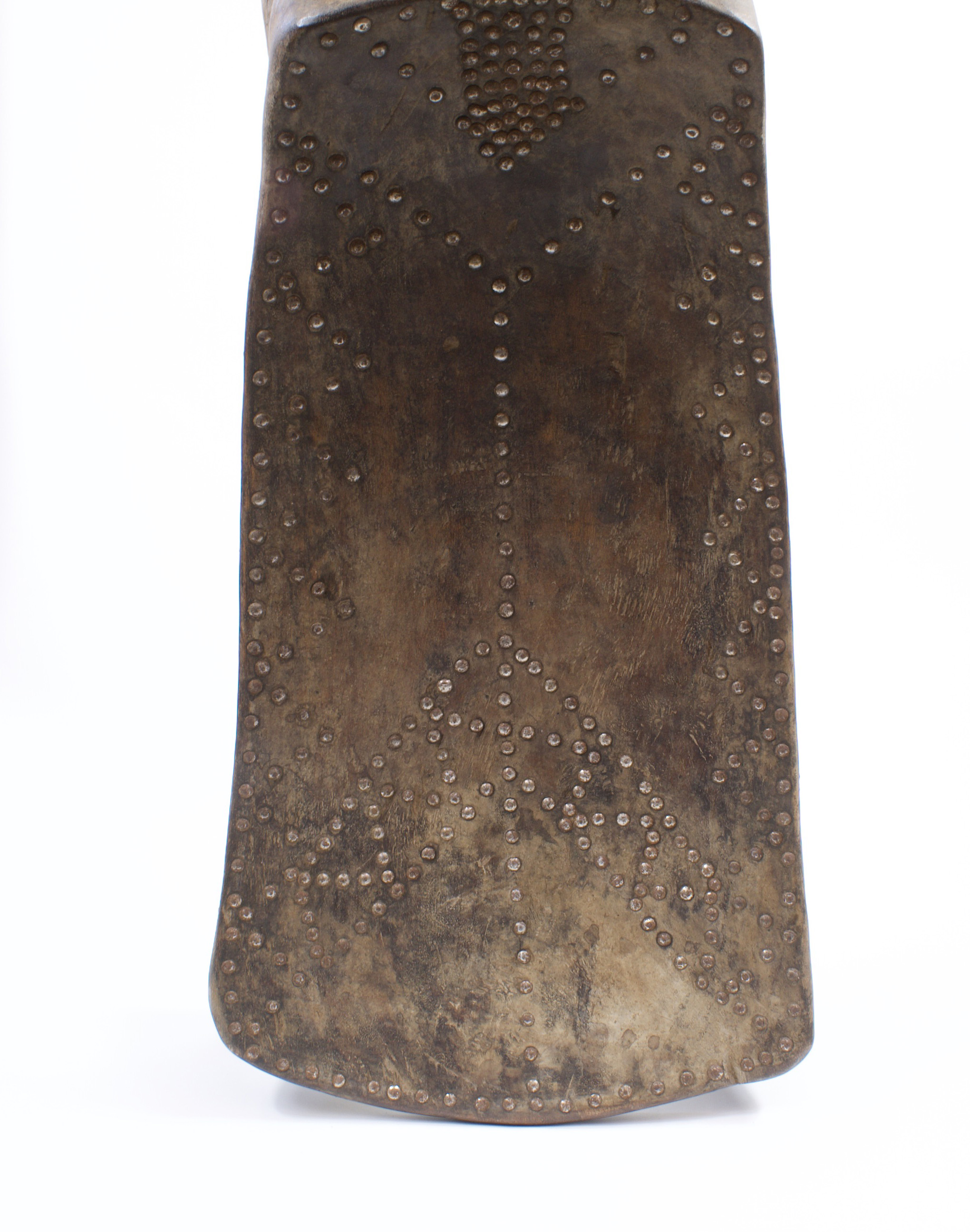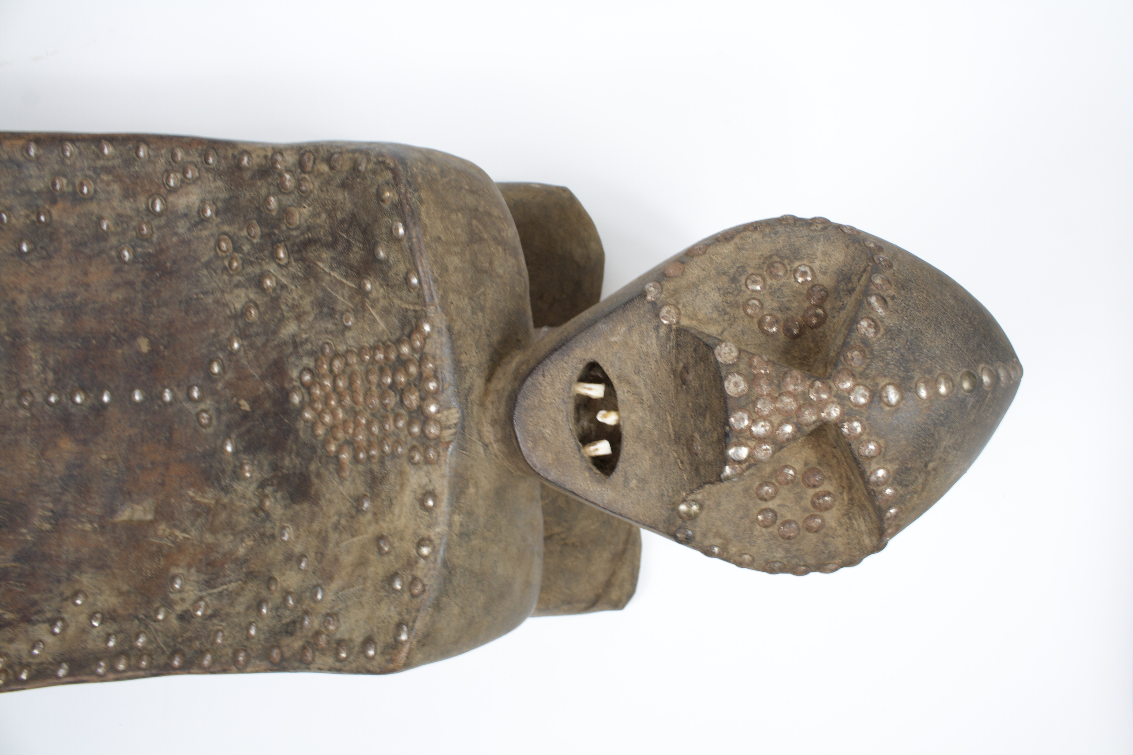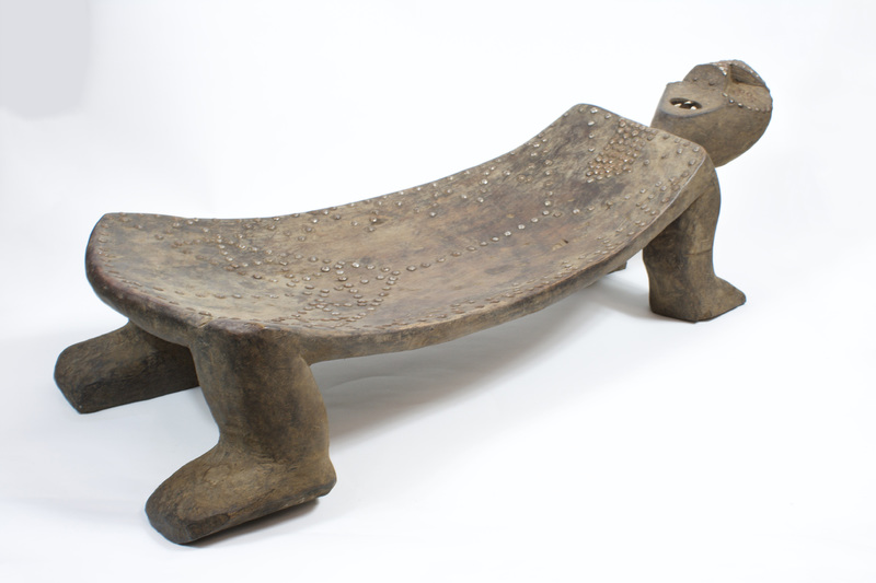 The wooden bed depicts an elongated human figure, standing on all fours with its chest facing upwards. Metal pins across the face and abdomen detail both facial features and scarification patterns. Animal teeth have been inlaid into the mouth. The bed was most likely used for decorative purposes, not for much physical use as there is a lack of scratching or markings made on the surface.