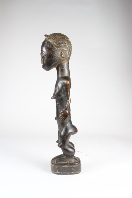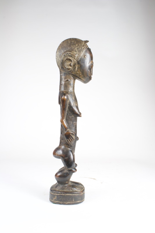 The carved female figure is thickly patinated, the dark coloring being a common characteristic of Baule sculptures. The figure has an elongated torso, with arms resting on the abdomen around a pronounced navel. Scarification patterns are present on the face and chest. The face presents a relaxed expression, with an undulating brow line above the large eyes. The figure is most likely of a fertility context due to the posture and expression.