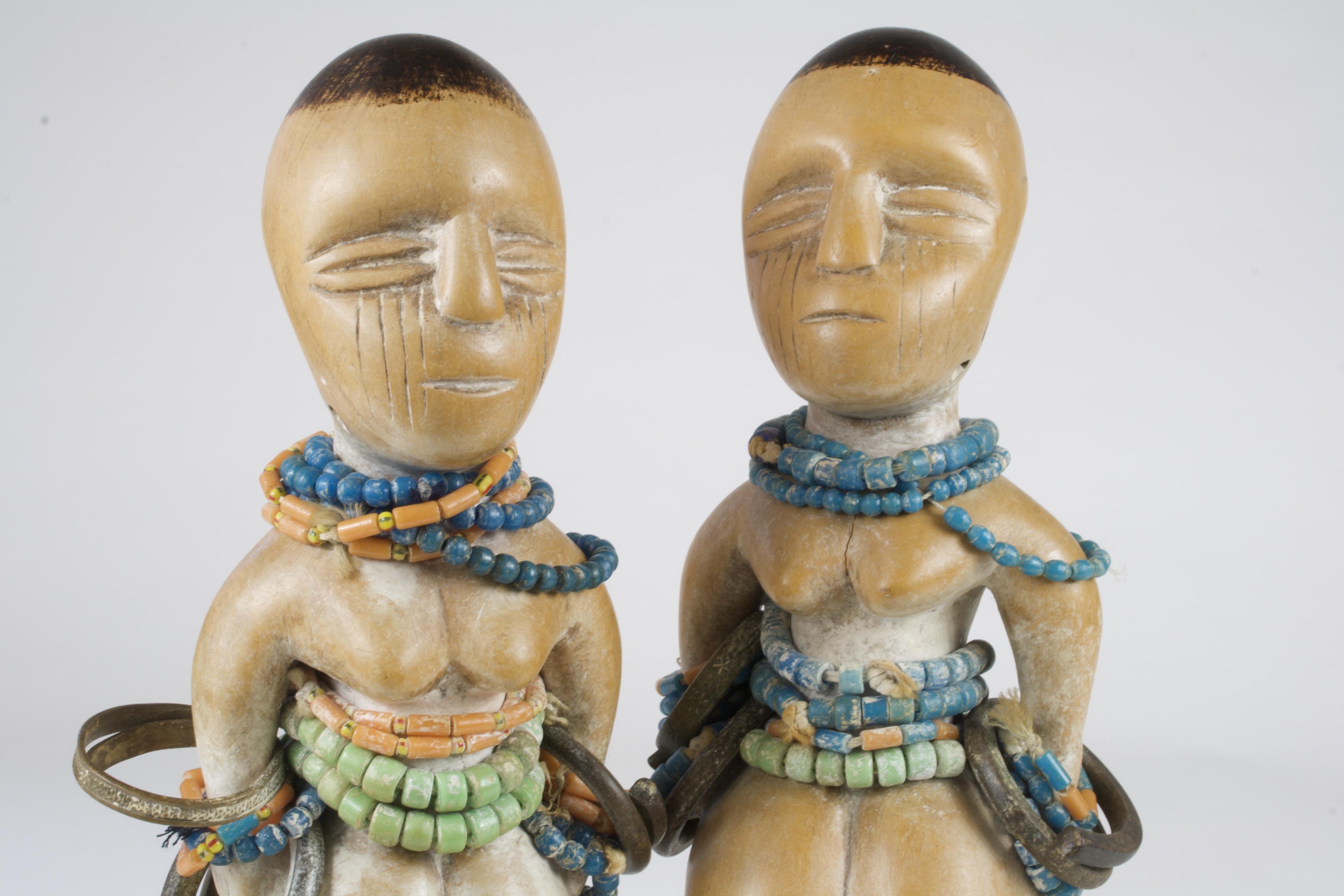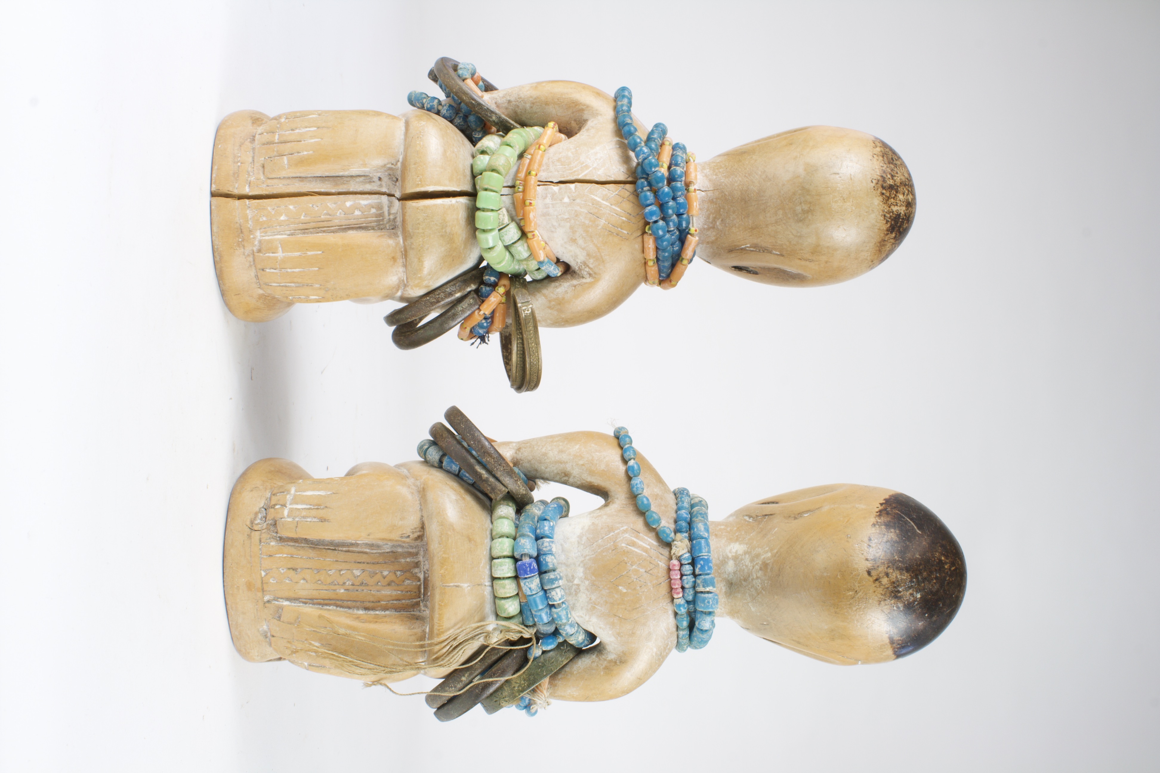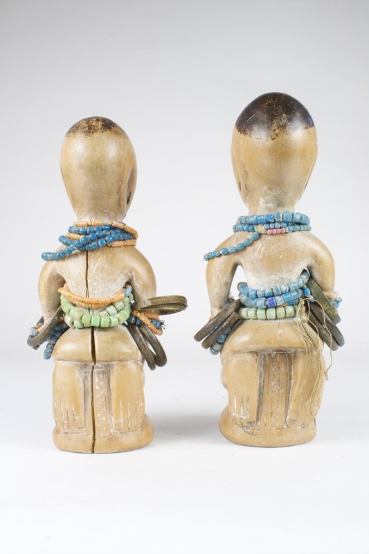 The wooden carved female twin figures are highly decorated with dark pigments, glass beads and metal jewelry. The bodies are rounded, kneeling with their arms at their sides. The eyes are closed with thinly incised lines marking the eyelids. Scarification patterns run vertically up and down the cheeks. Twin figures were created to commemorate either one child or the set of twins after death. Twins are believed to have spiritual powers in communities of Nigeria like Yoruba, thus memorial figures were often created.