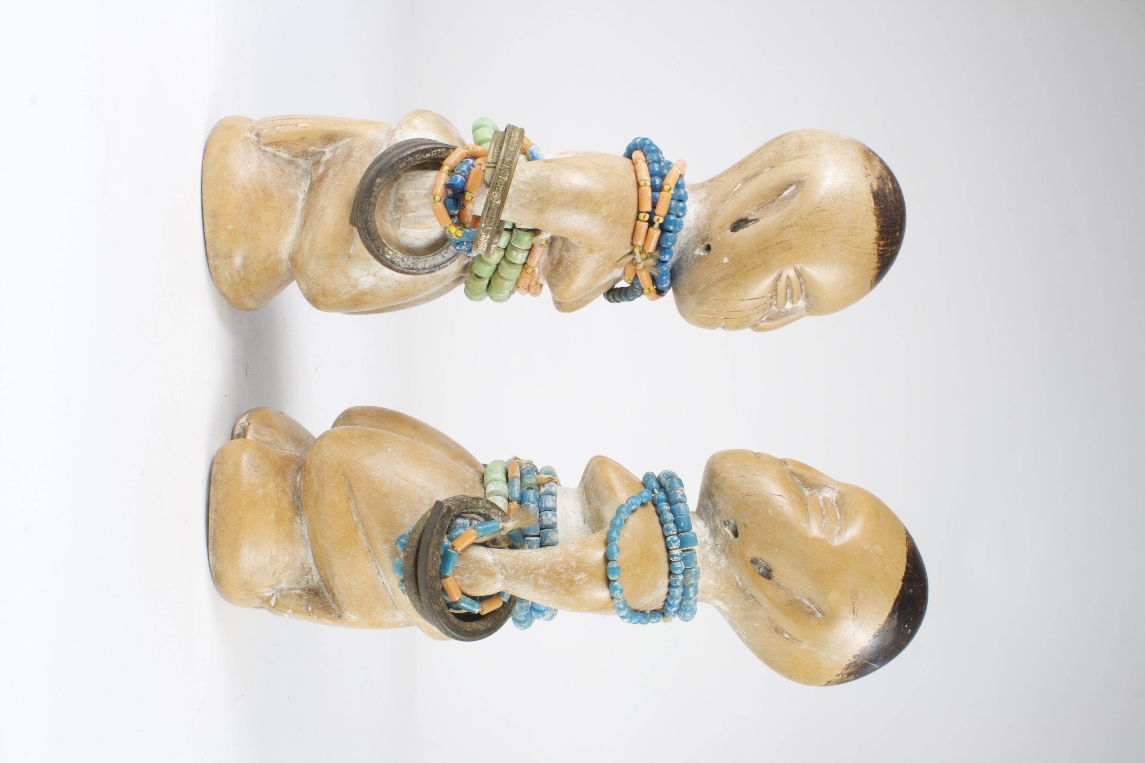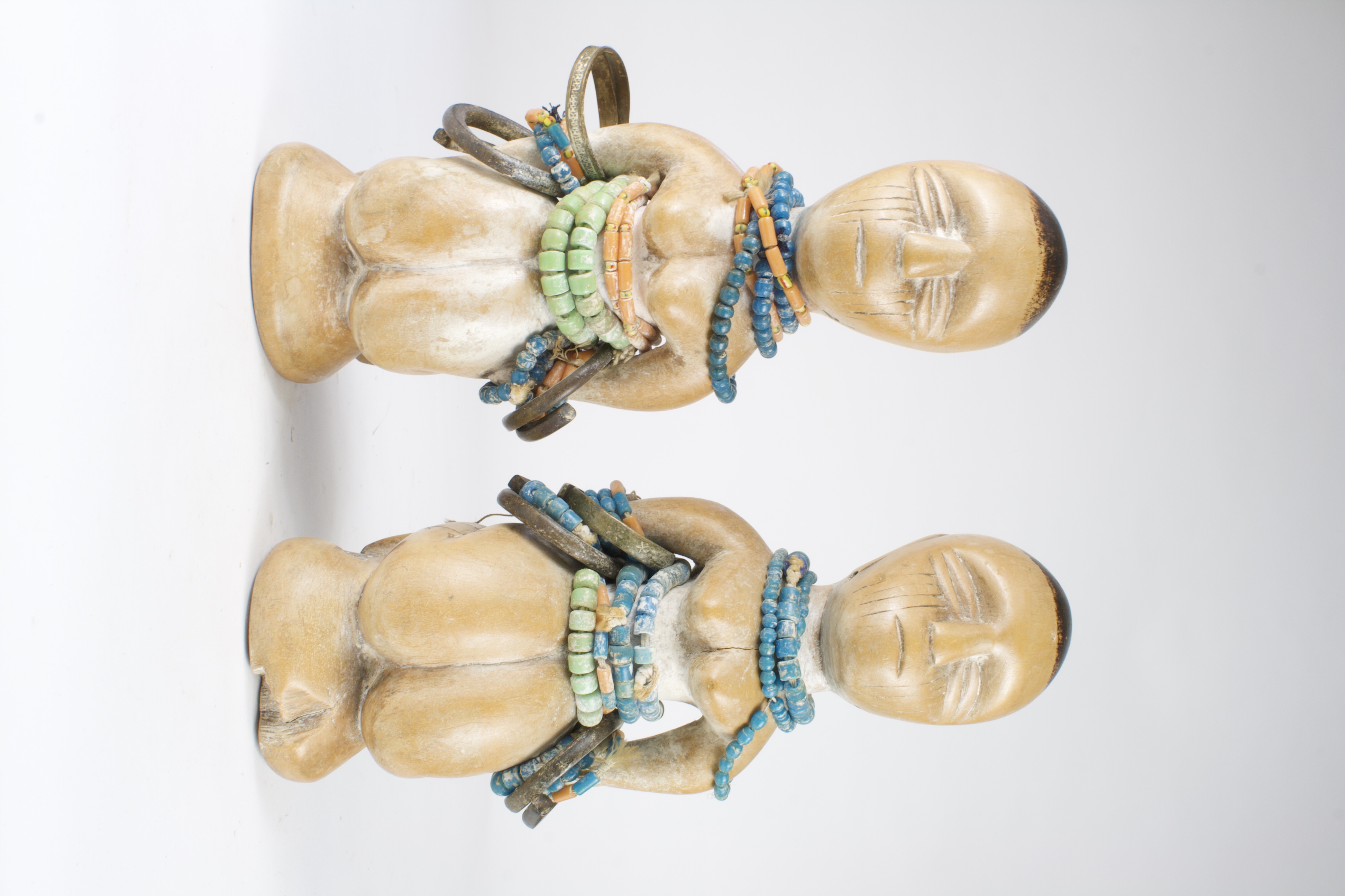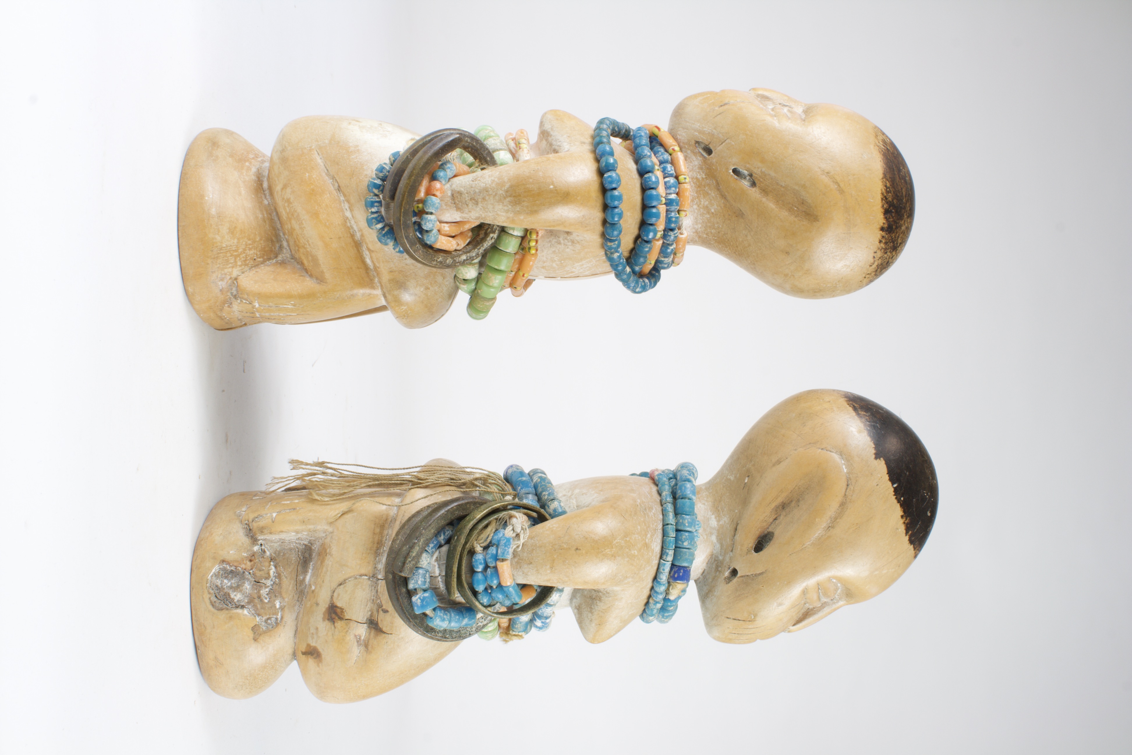 The wooden carved female twin figures are highly decorated with dark pigments, glass beads and metal jewelry. The bodies are rounded, kneeling with their arms at their sides. The eyes are closed with thinly incised lines marking the eyelids. Scarification patterns run vertically up and down the cheeks. Twin figures were created to commemorate either one child or the set of twins after death. Twins are believed to have spiritual powers in communities of Nigeria like Yoruba, thus memorial figures were often created.