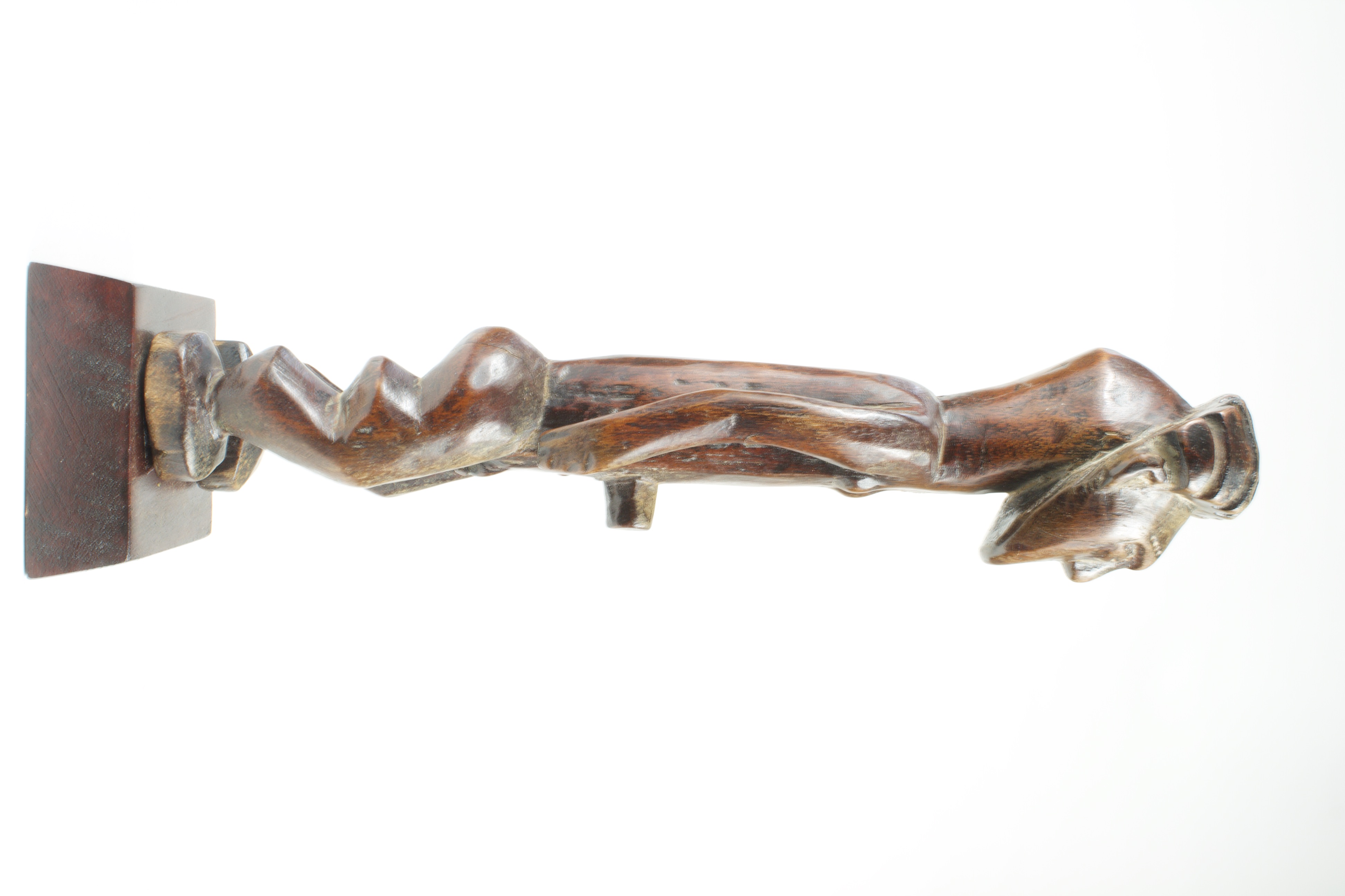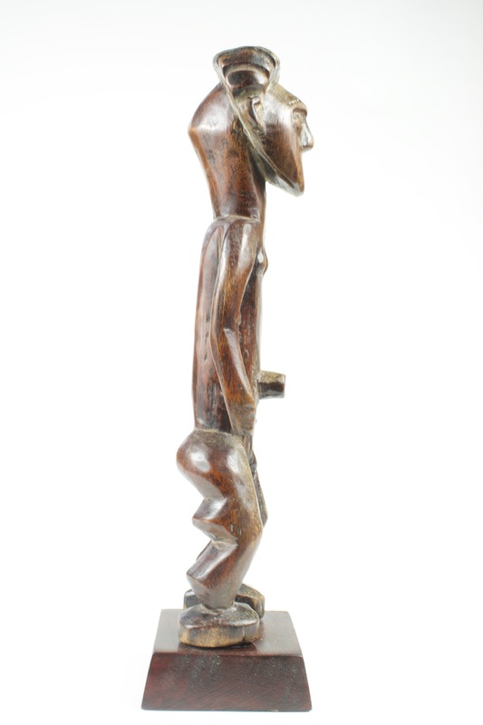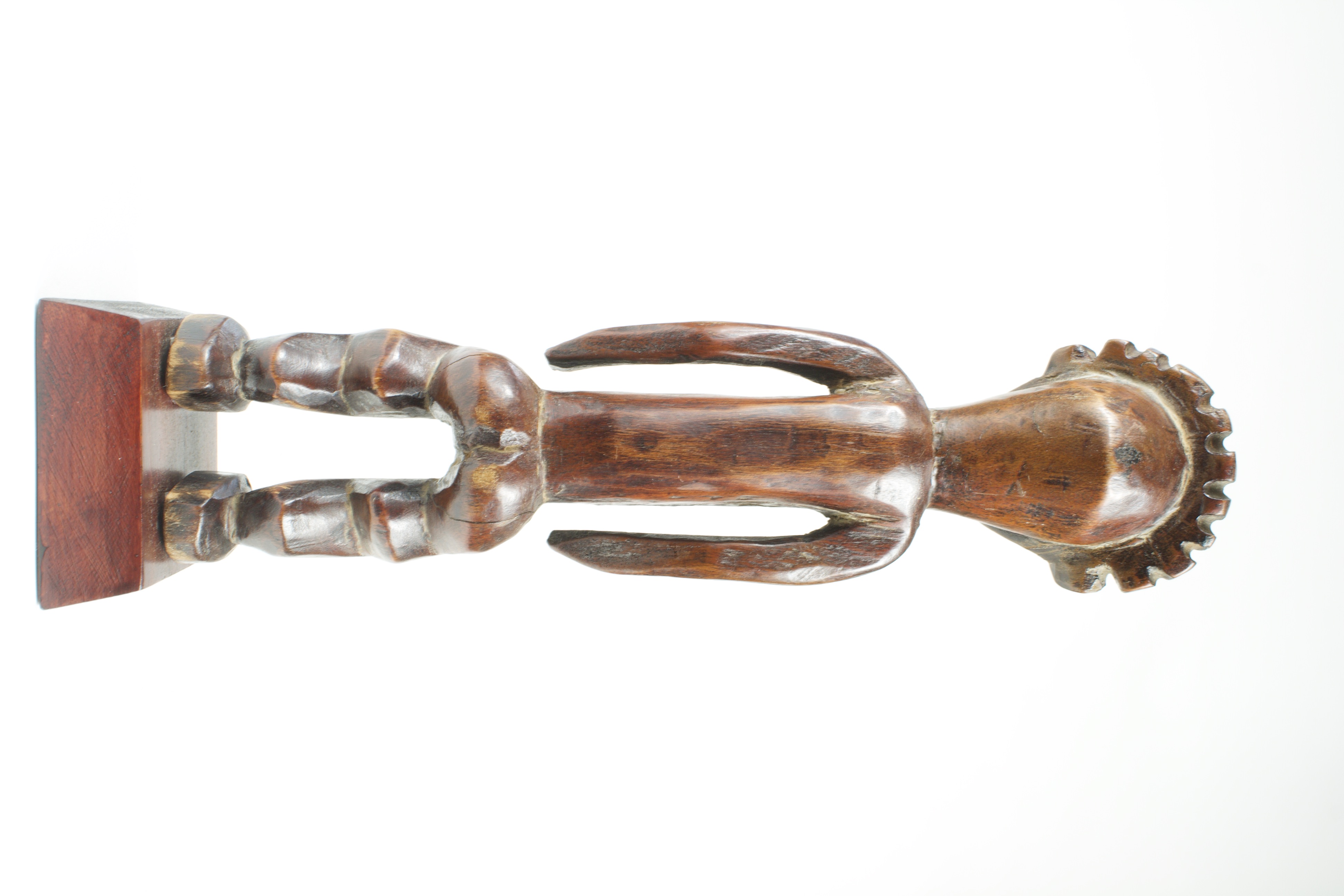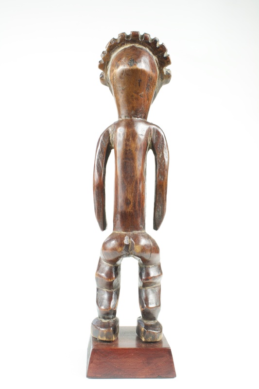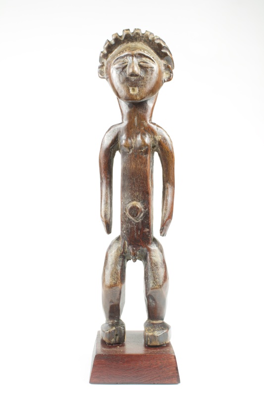 The standing male figure is carved of wood with a dark patina. The head is proportionately larger than the body and topped with a stylized coiffure. Ears have been carved on either side of the head in line with bulging eyes and a centered nose. The mouth is square in juxtaposition with the rounded forms of the other features. Above the eyes on the brow ridge are small holes indicating scarification patterns. Arms reach downward towards thicker, short legs. The abdomen is long and narrow, with carved breasts and male genitalia, along with a protruding navel.