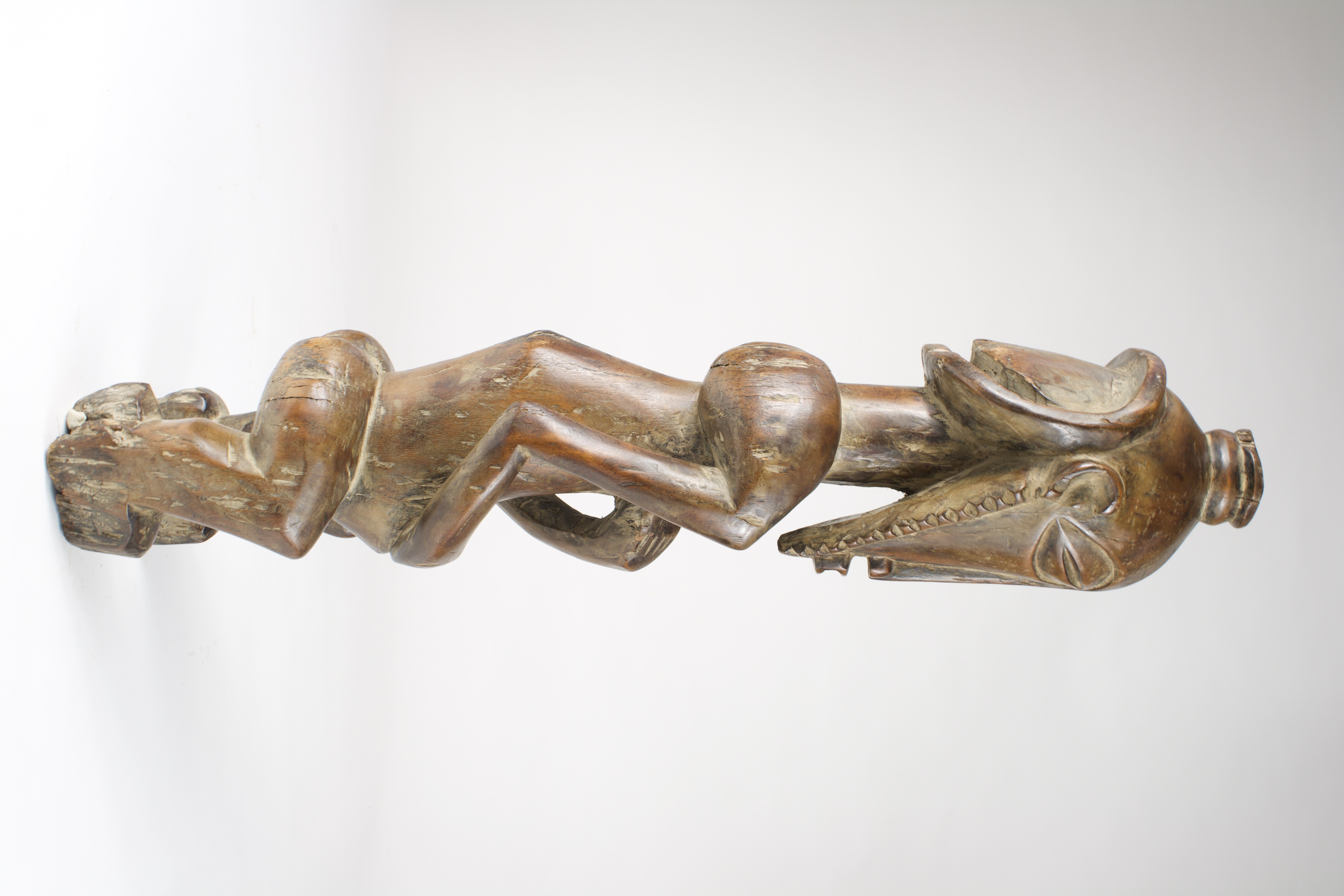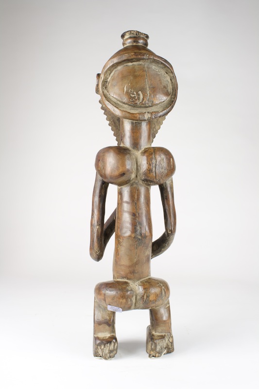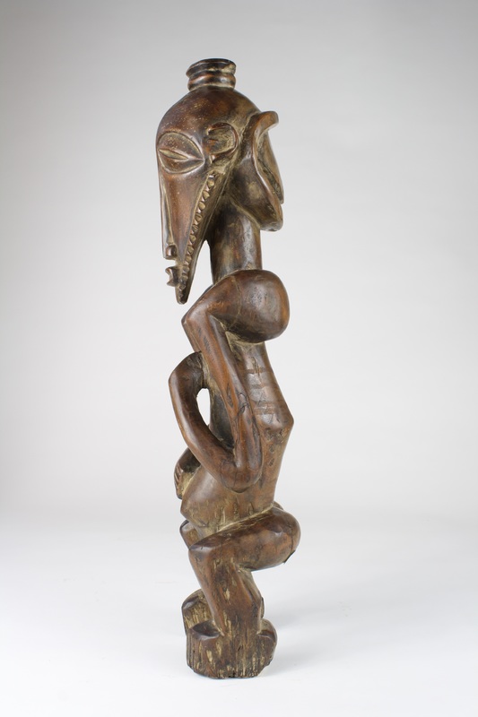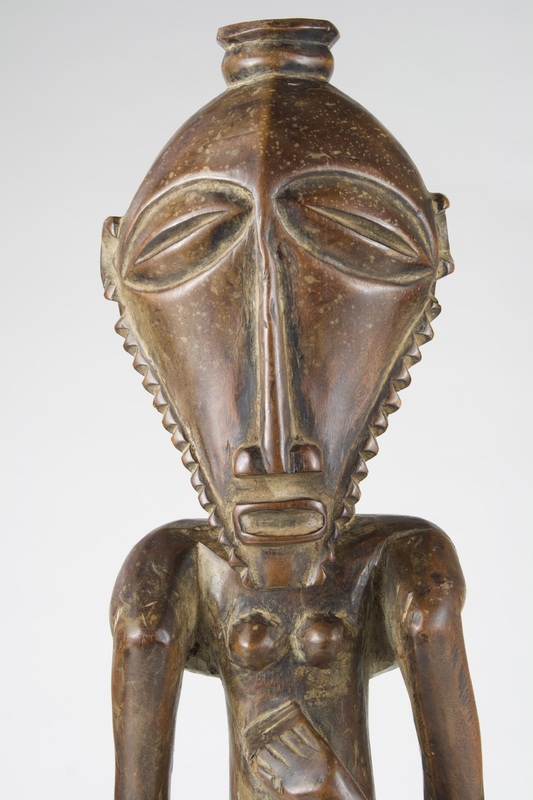 Standing female figure, carved of wood with identifiable characteristics of the Hemba style such as the head shape, coiffure, ovular eyes and beard like detail around the face. One hand rests on the pronounced navel, with the other angles upwards towards the chest. The female genitalia has been exaggerated, possibly expressing a maternal function or image of fertility.