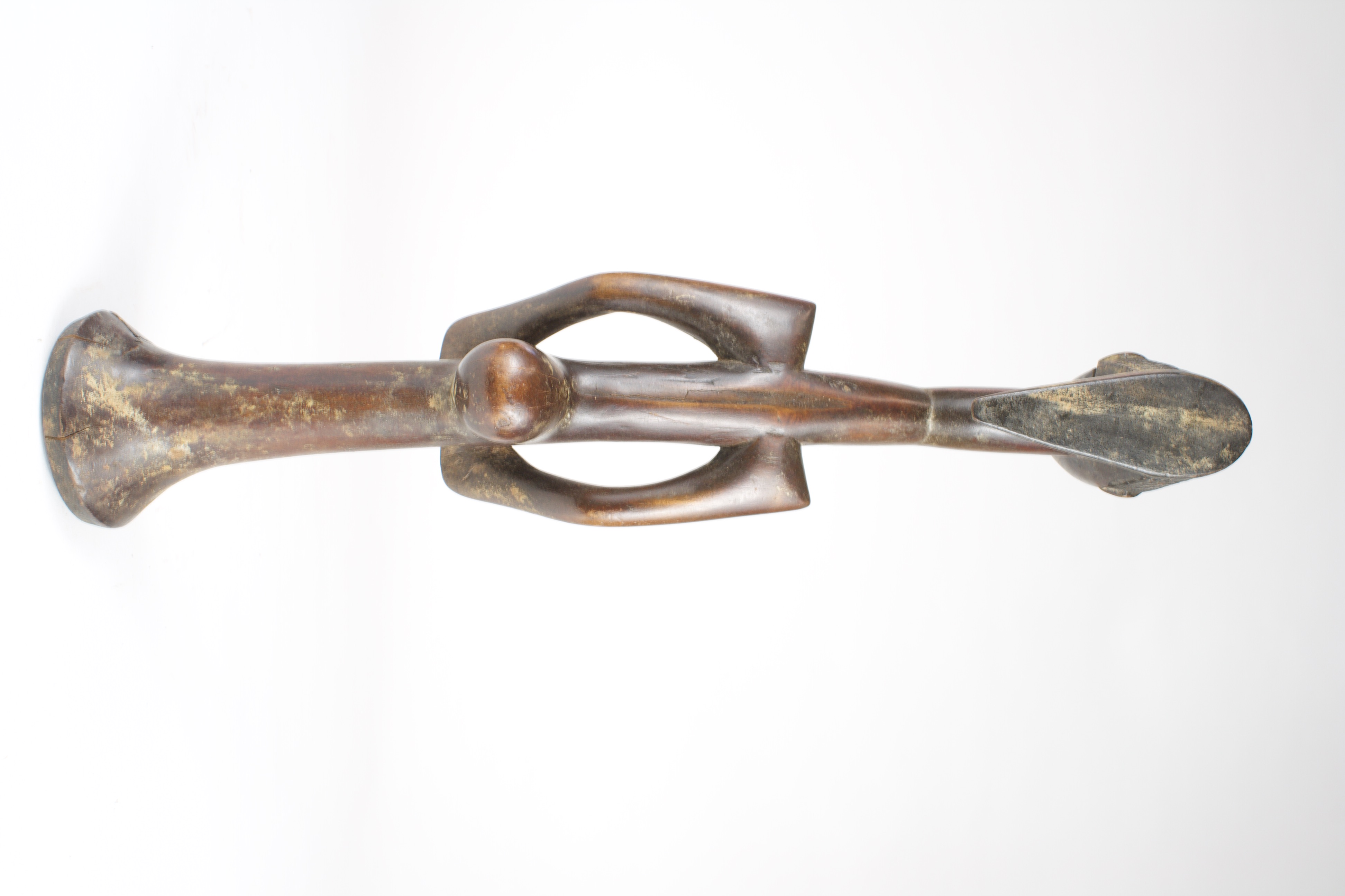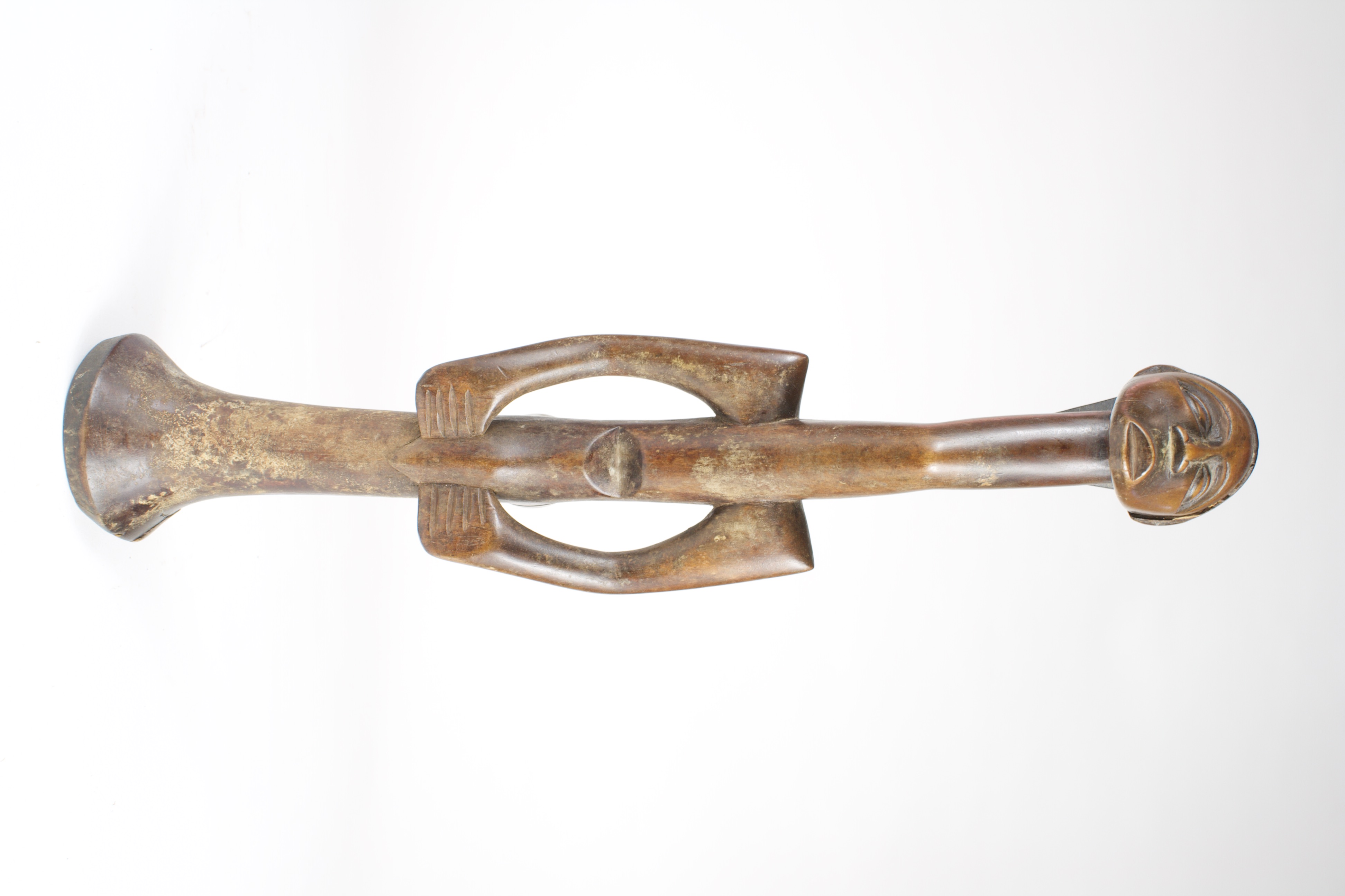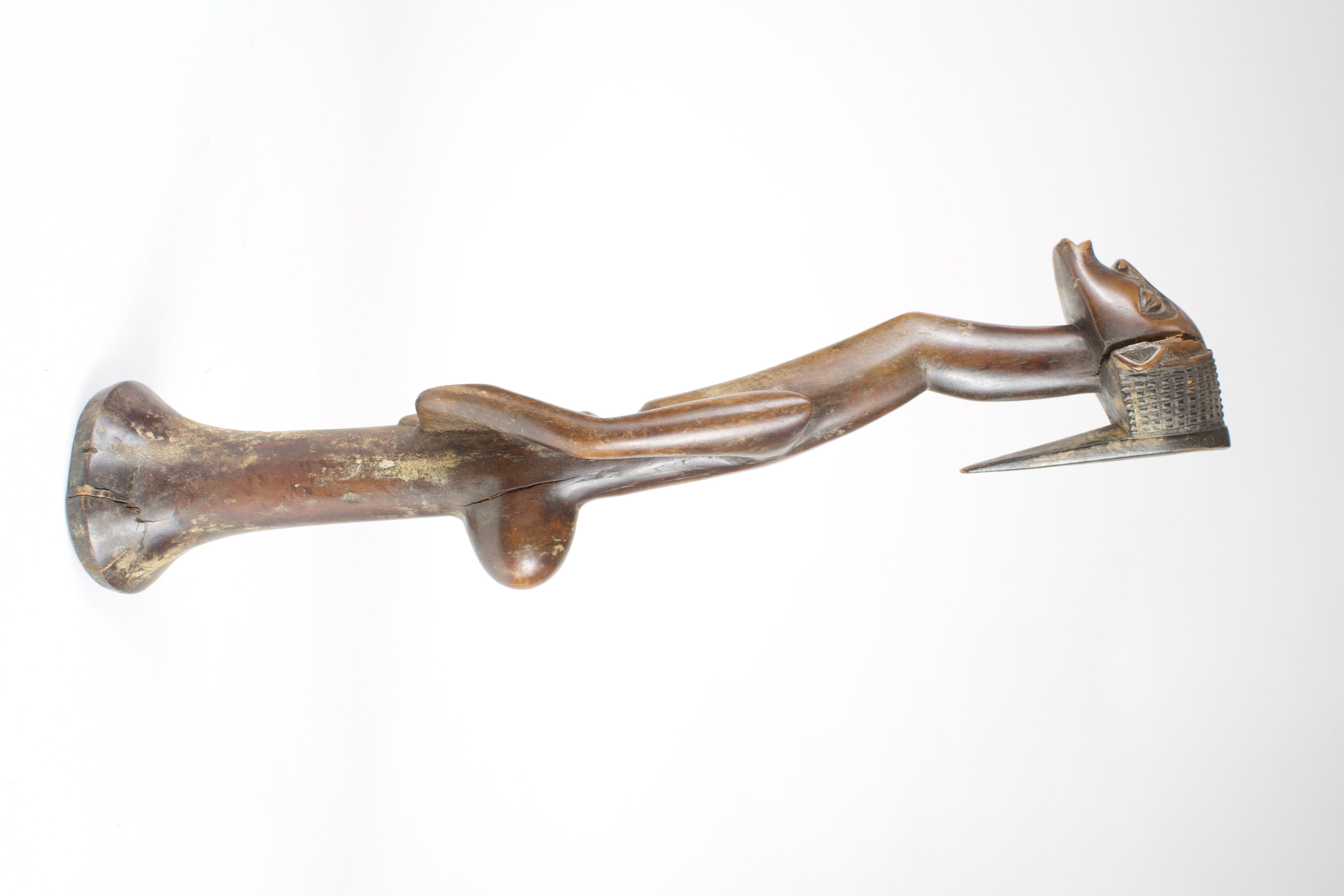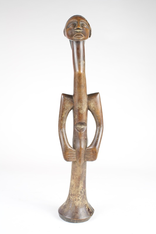 The elongated figure features a slender, curved neck leading to a rounded head adorned with an intricately carved headdress, protruding buttocks, and pointed shoulders with a rod-like lower half, possibly for support. This figure could represent an ancestor or symbolize authority.