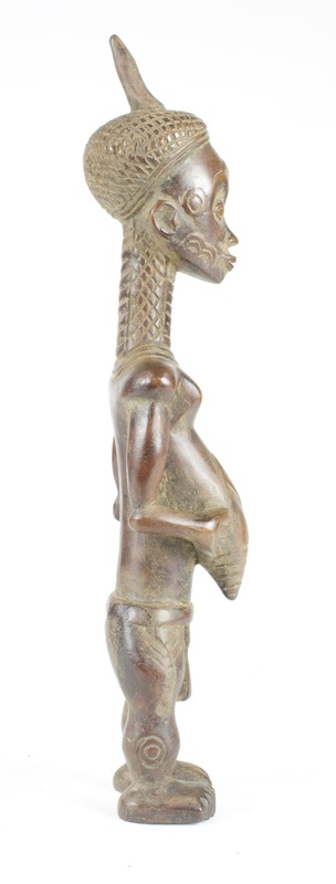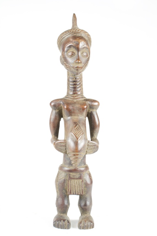 The carved wooden female ancestor or power figure is highly decorated with scarification patterns and incised lines marking the collar necklace and loin cloth. The figure may be a representation of the "Mupaki wa manga" power figure, protecting from and controlling otherworldly forces.