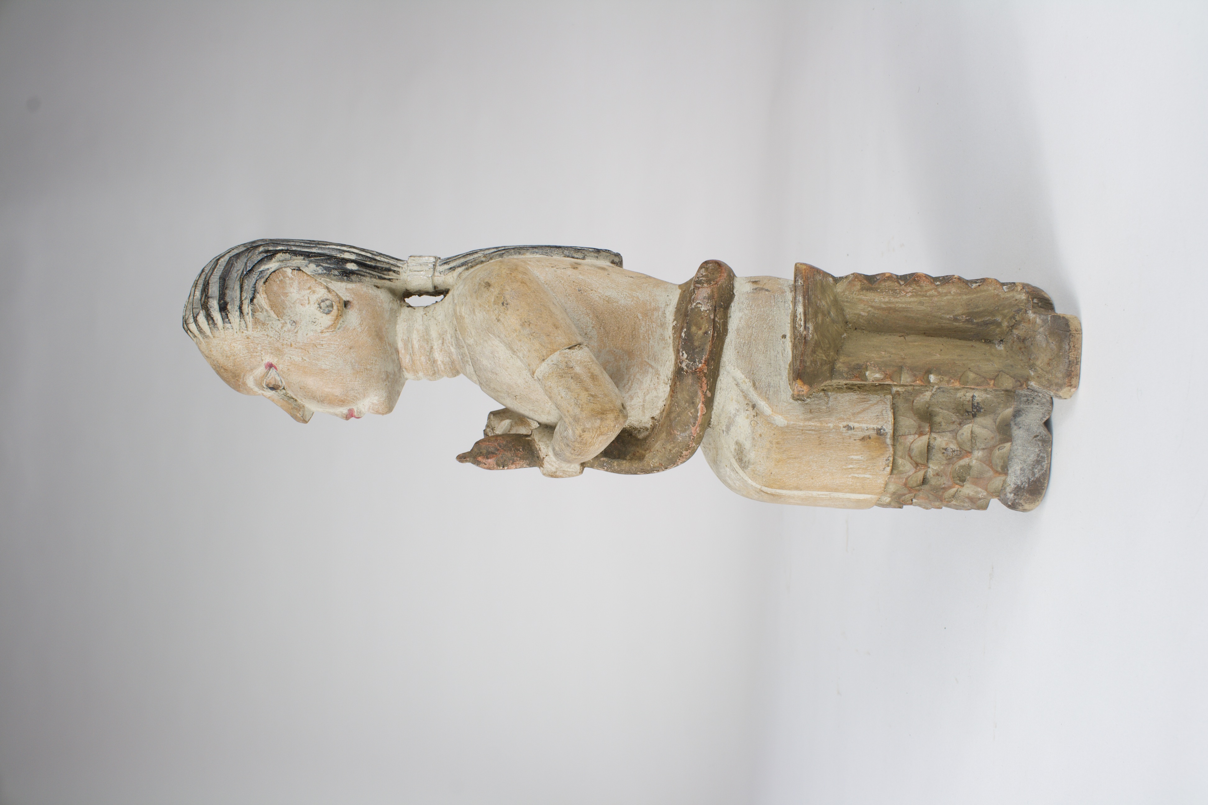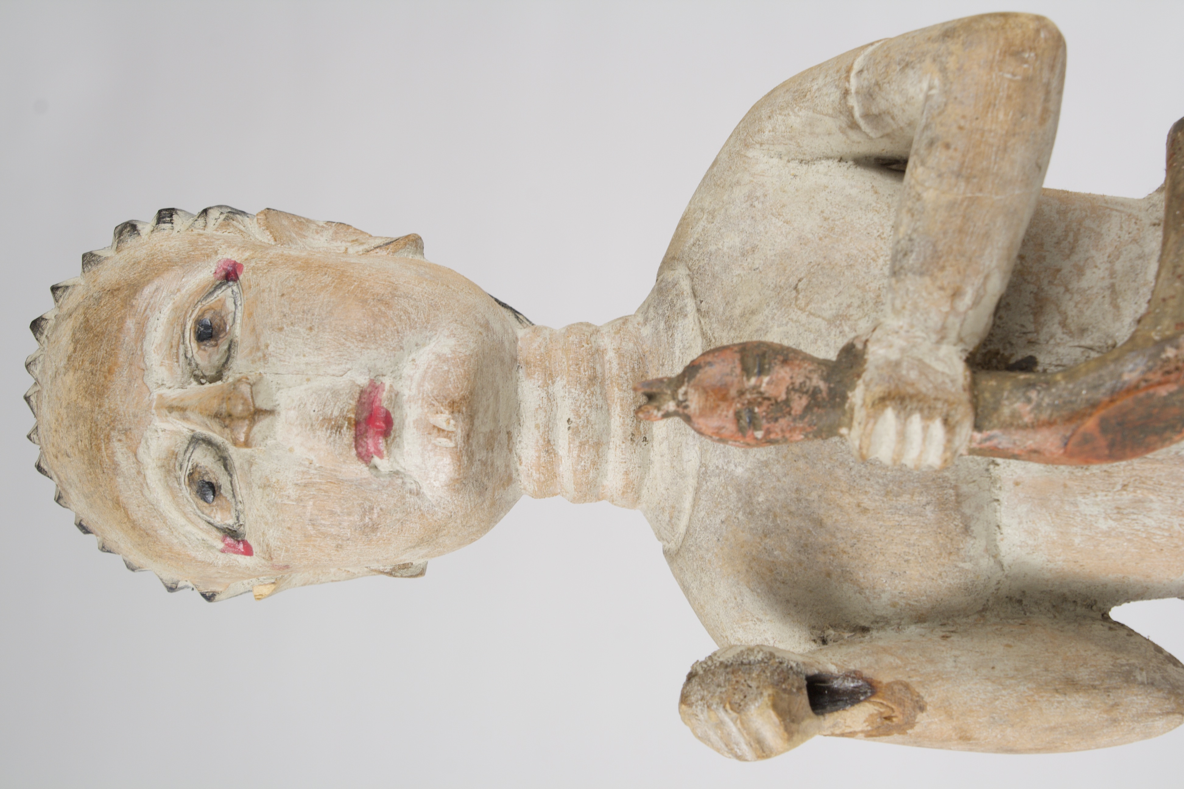 A seated wooden female figure, grasping a snake in one hand, and an open space within the clenched fist of the other. The figure has naturalistic, yet exaggerated features and a stylized coiffure. The figure may represent royalty, potentially depicting a Queen Mother, as it is seated in a highly detailed chair and covered in a chalk-like pigment. On festival days, Akan royalty would cover their skin in white powders to show their reverence and devotion.