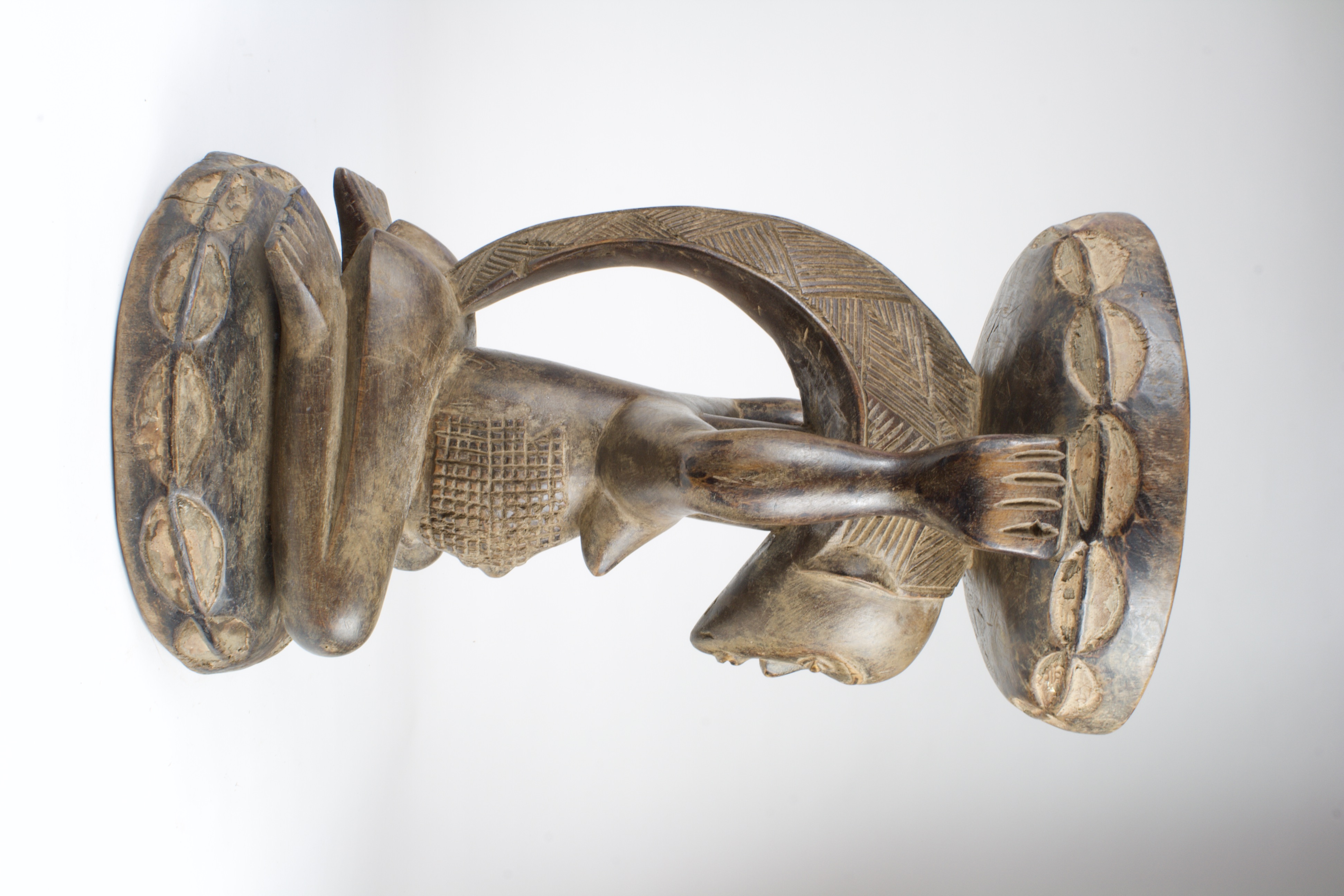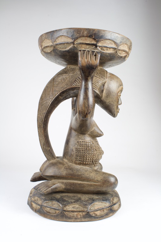 The carved wooden stool has clear characteristics of the Luba style, such as the facial features and seated position. The figure is female with a round abdomen and pronounced navel, decorated with scarification patterns. The base of the stool and round seat supported by the figures arms are decorated with a wrapping pattern depicting cowrie shells. The stool has a functional construction however it was most likely used for decorative reasons, or as a metaphorical seat of kingship for the Luba leadership.