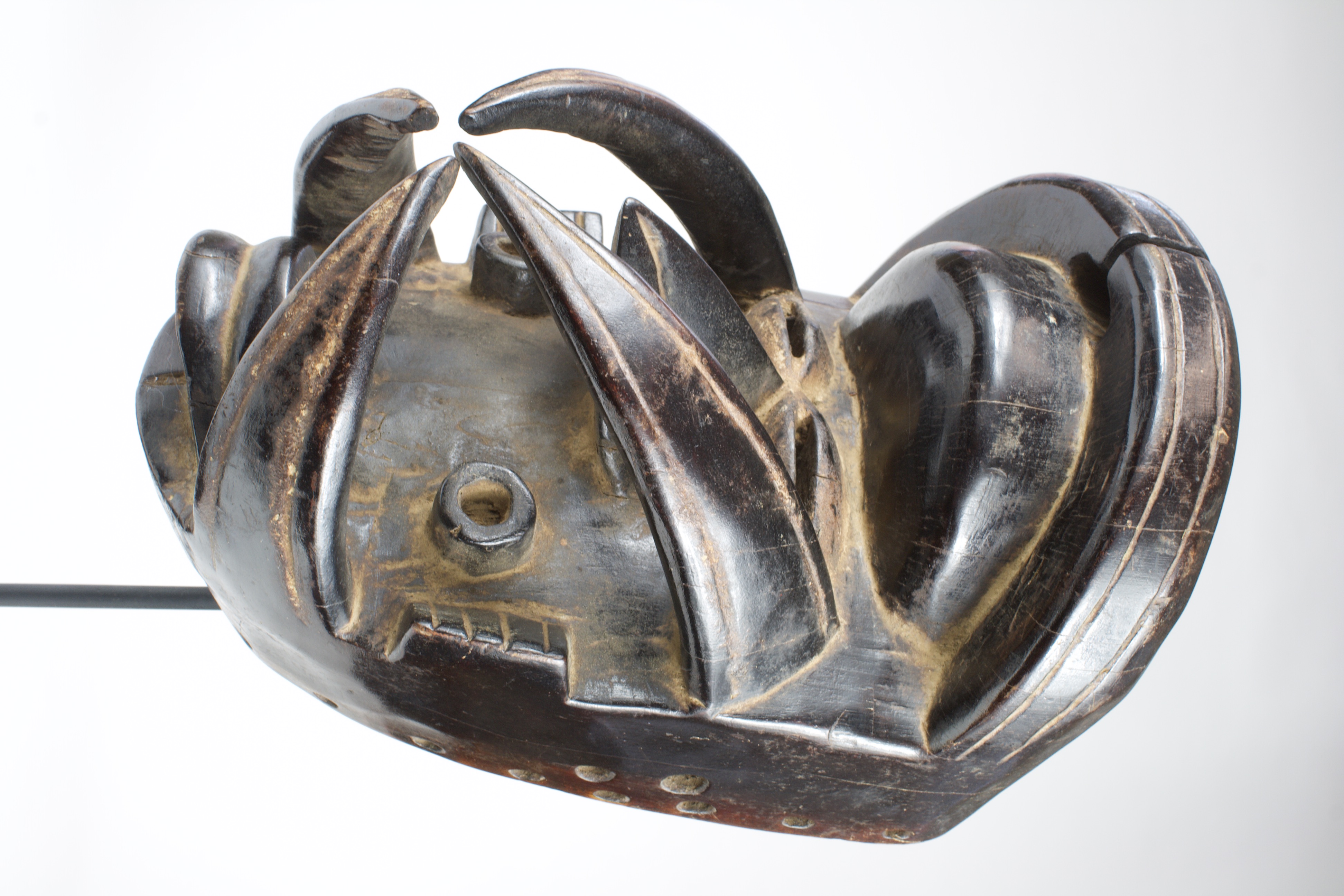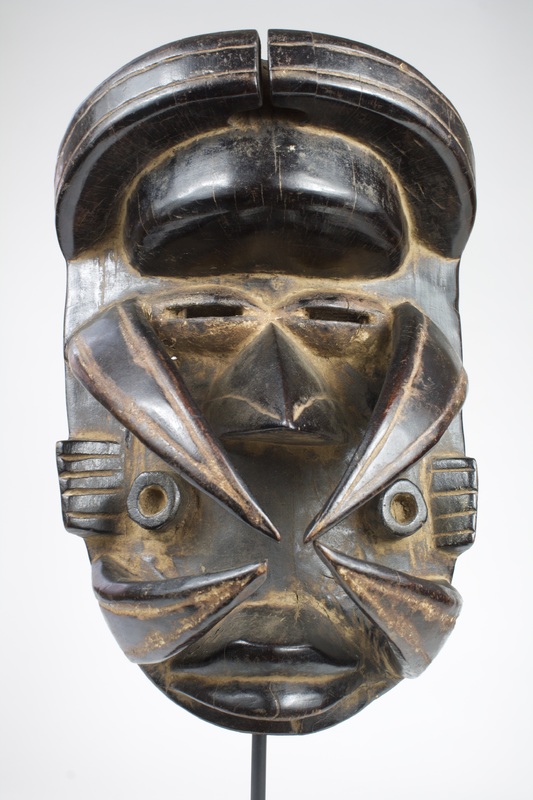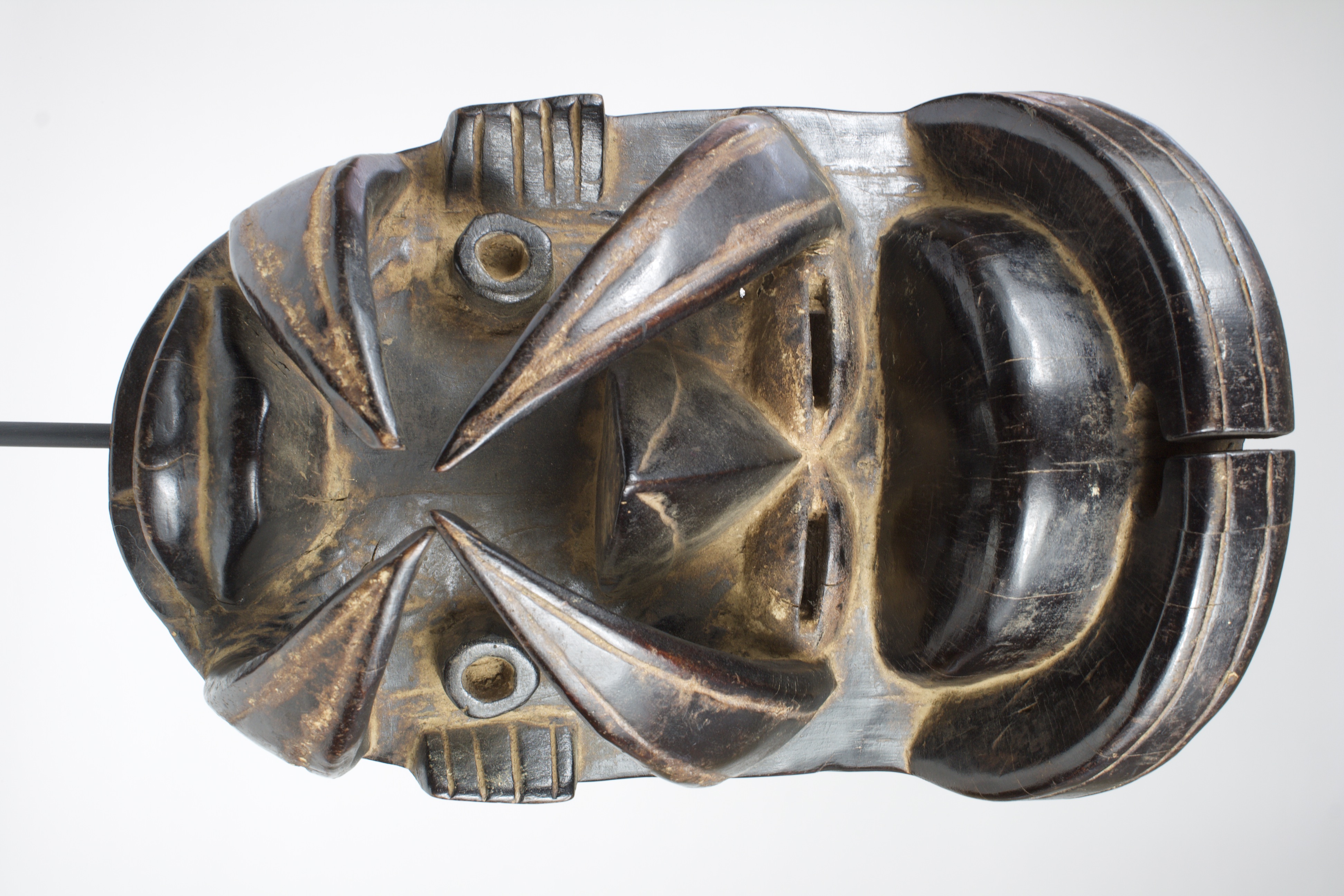 The Gere mask is carved of wood with a thick, dark patina. The forehead bulges forward, with a thin central division. The eyes are formed by narrow horizontal openings under the forehead. The nose and mouth extend forward with sharp angles to compliment the four horns that round inward to the center of the mask. on either side of the face, under the nose, are small holes alongside horizontally incised lines.