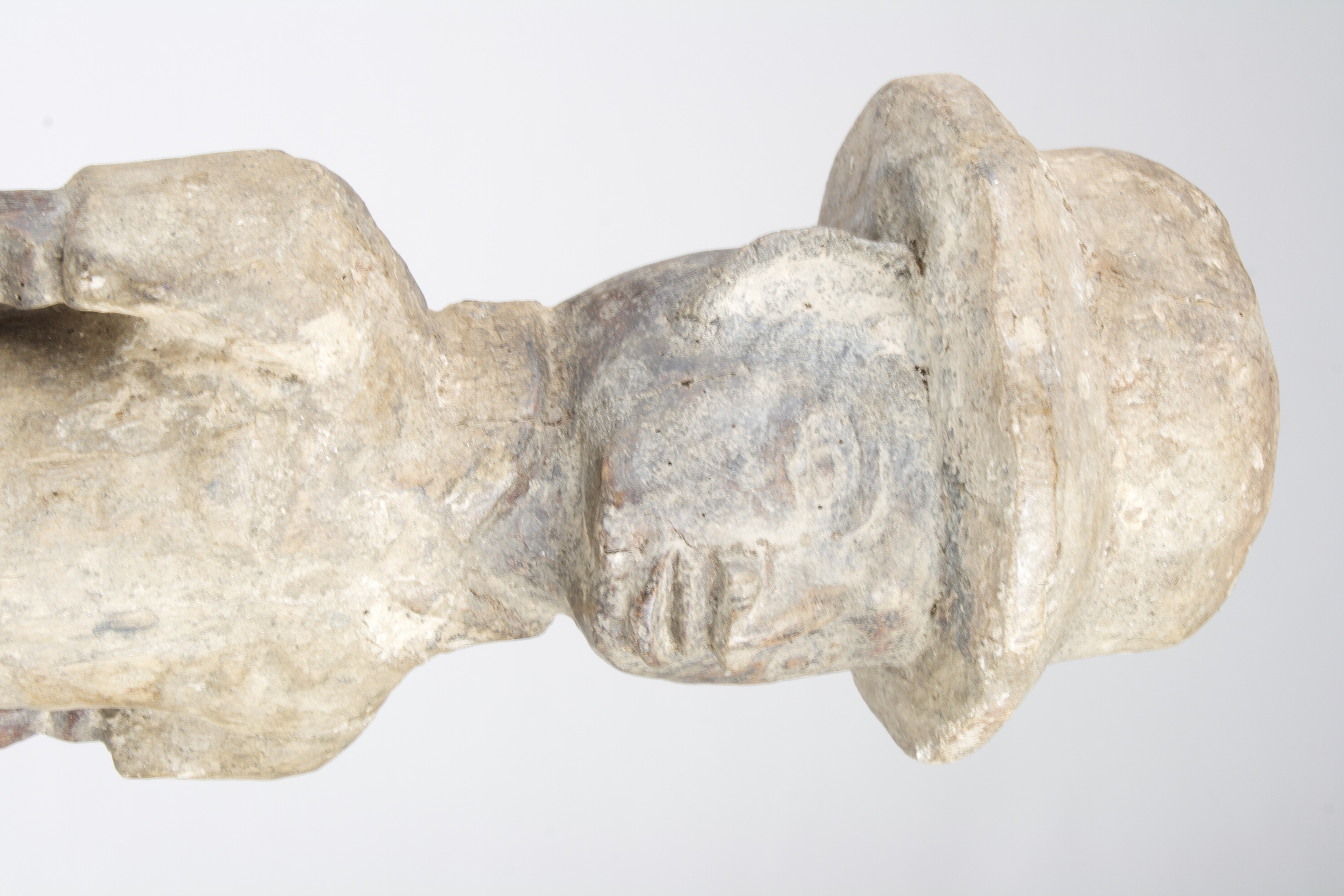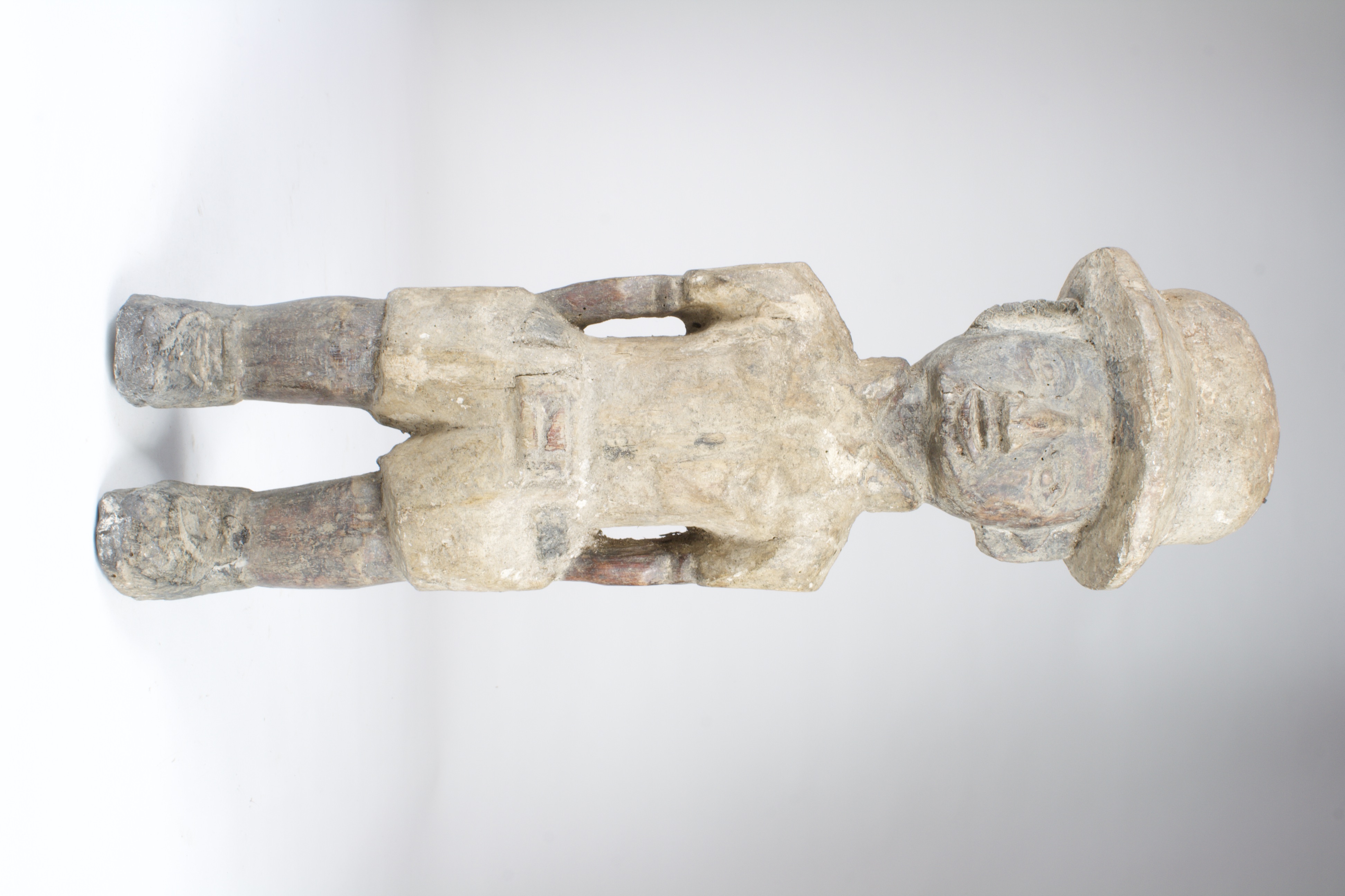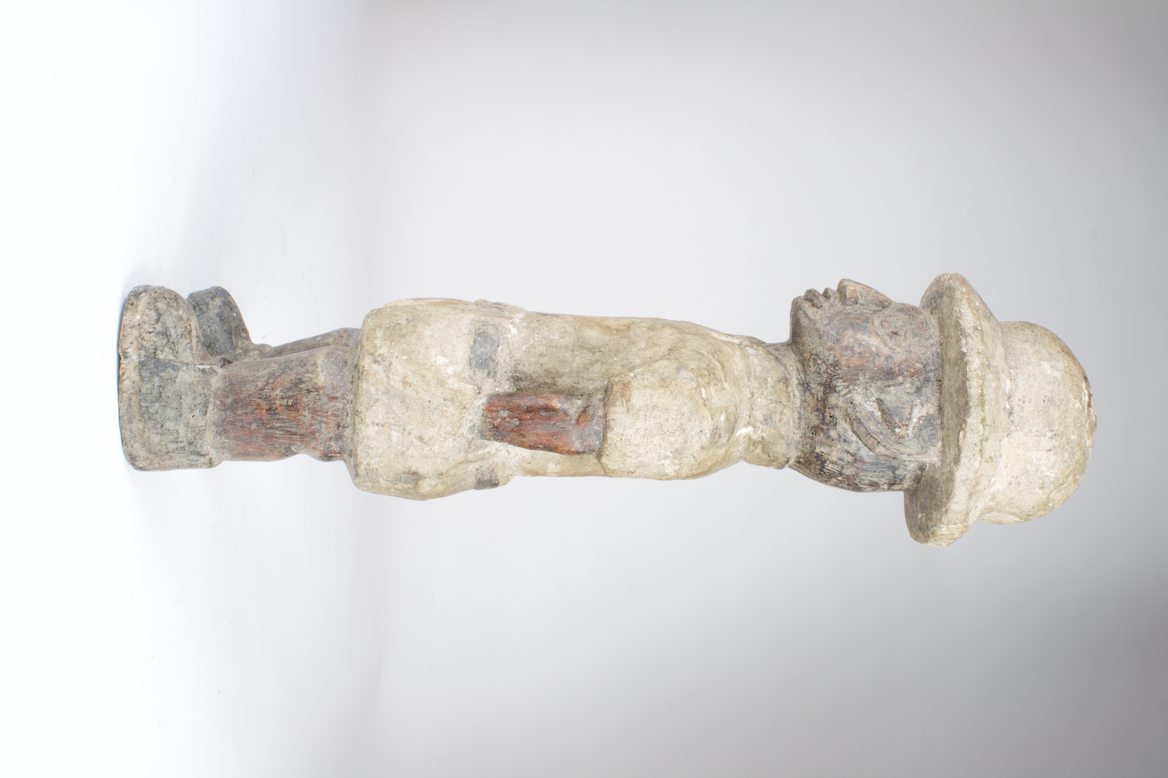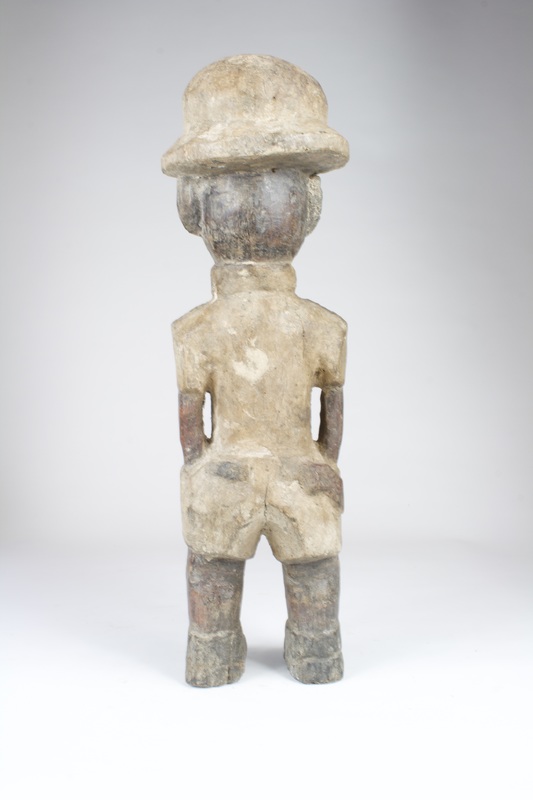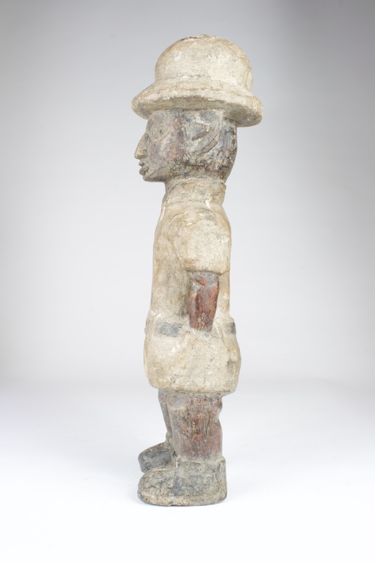The small, standing colonial figure represents the influence of the European settlers in the Baule area in the early 20th century. The figure is painted to reflect the aesthetics of European attire, such as the large white hat. It was common practice for small standing figures to be made as "spirit lovers", or an ideal vision of a spouse. It is possible that the small colonial figure was created as a spirit lover, that reflected the new societal ideals introduced by the Europeans.