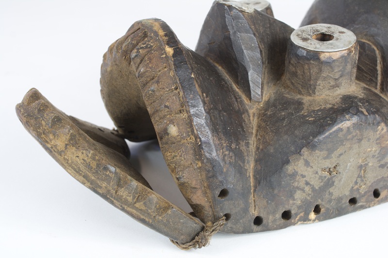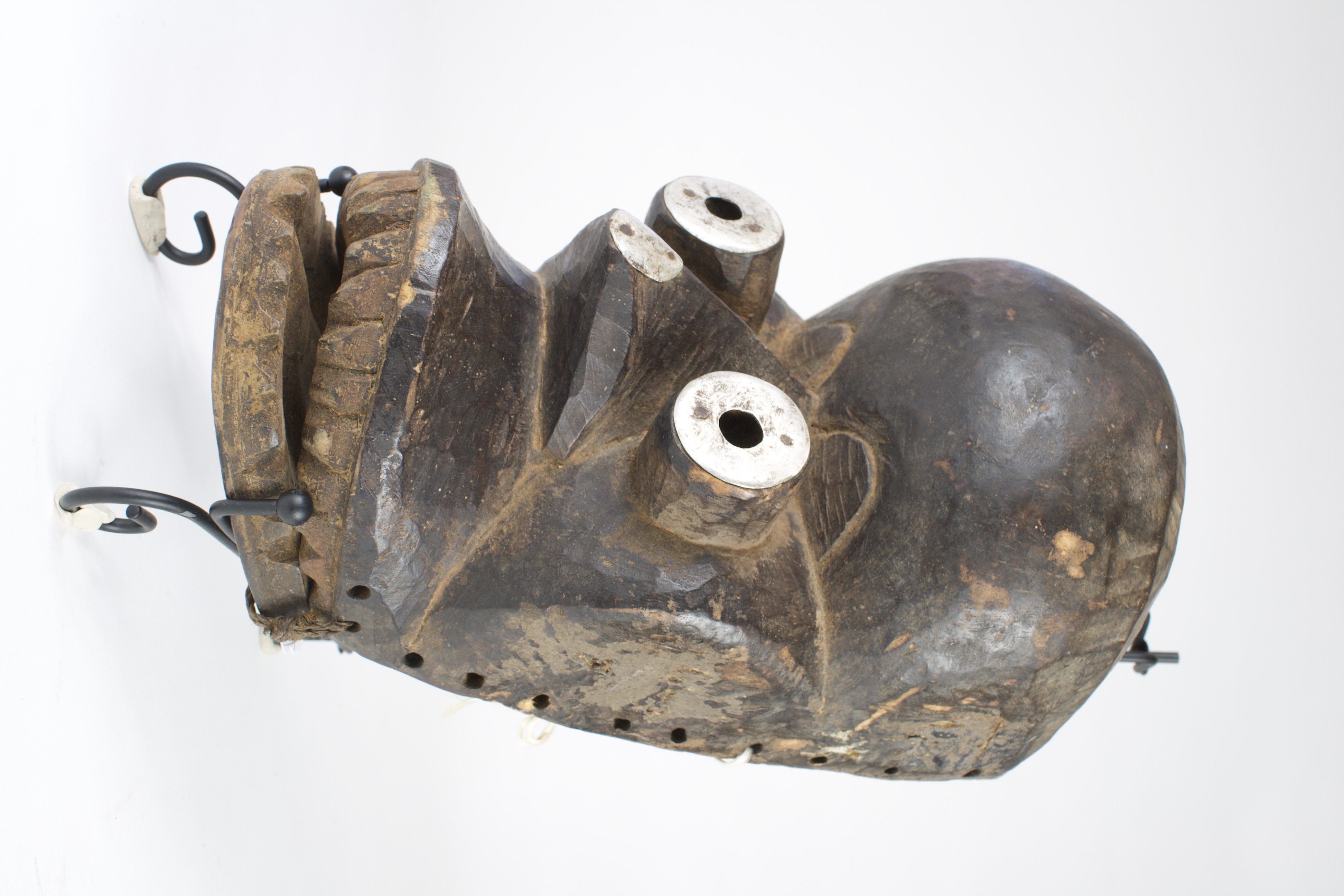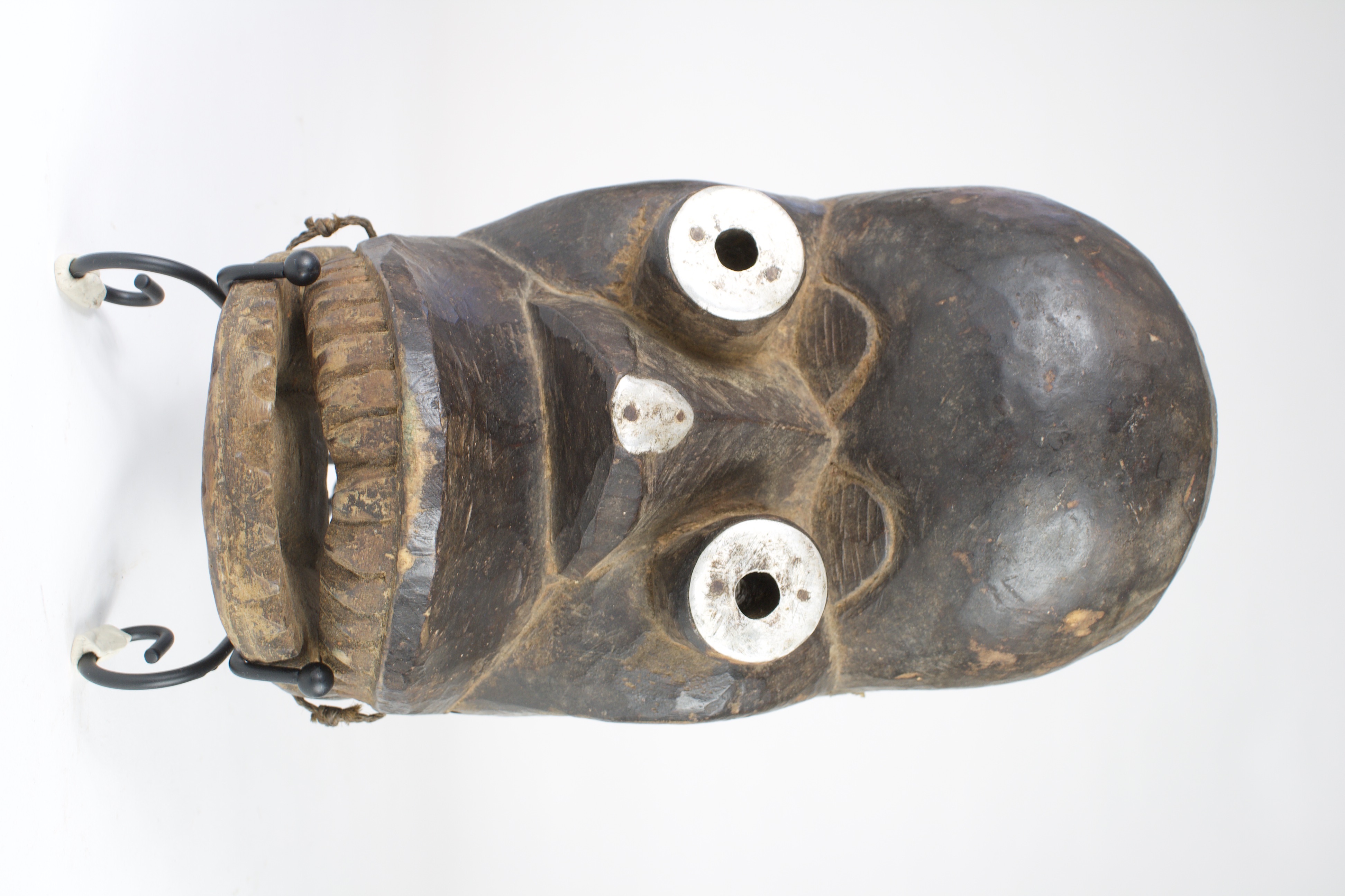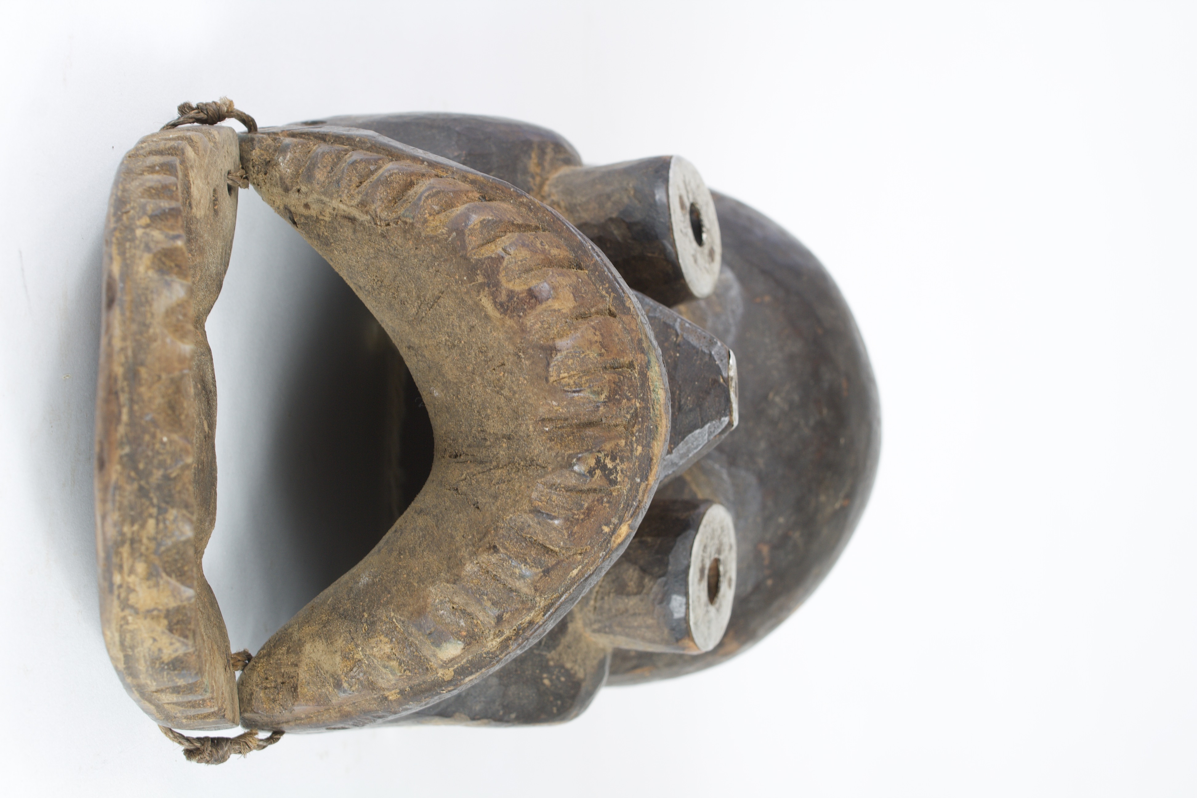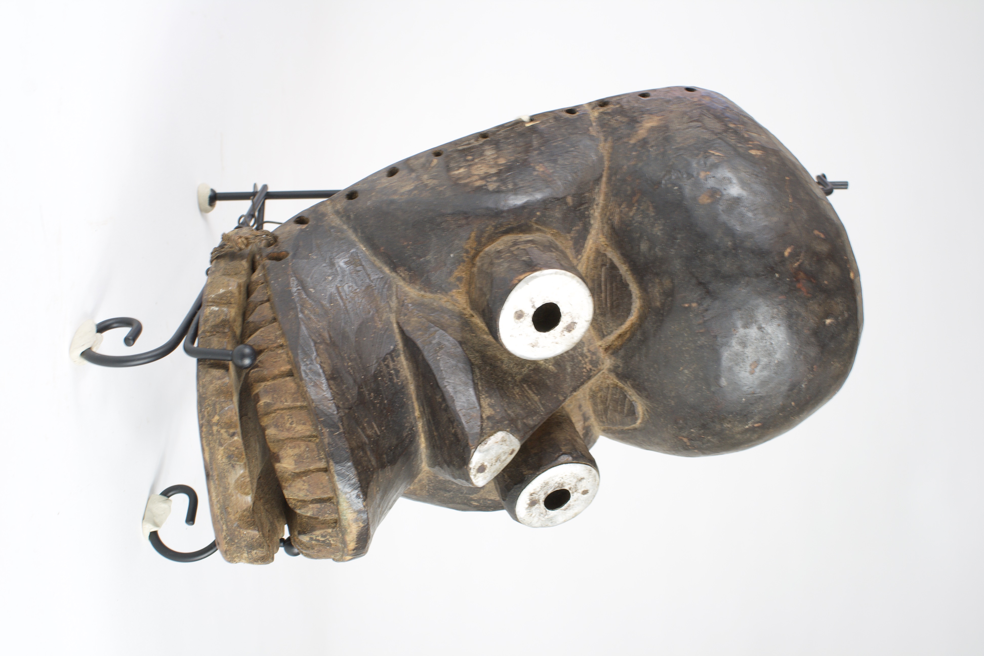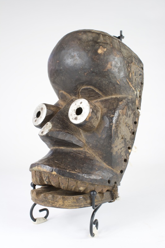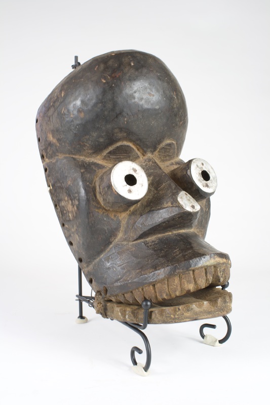 Carved wooden mask, with hinging jaw and round iron forms to represent eyes. The forehead and the upper jaw protrude, to create exaggerated features. The Dan mask may be associated with forest spirits, manifesting their powers. This mask can be grouped into the 11 major types of figures used to represent varying social topics such as education, politics and entertainment.