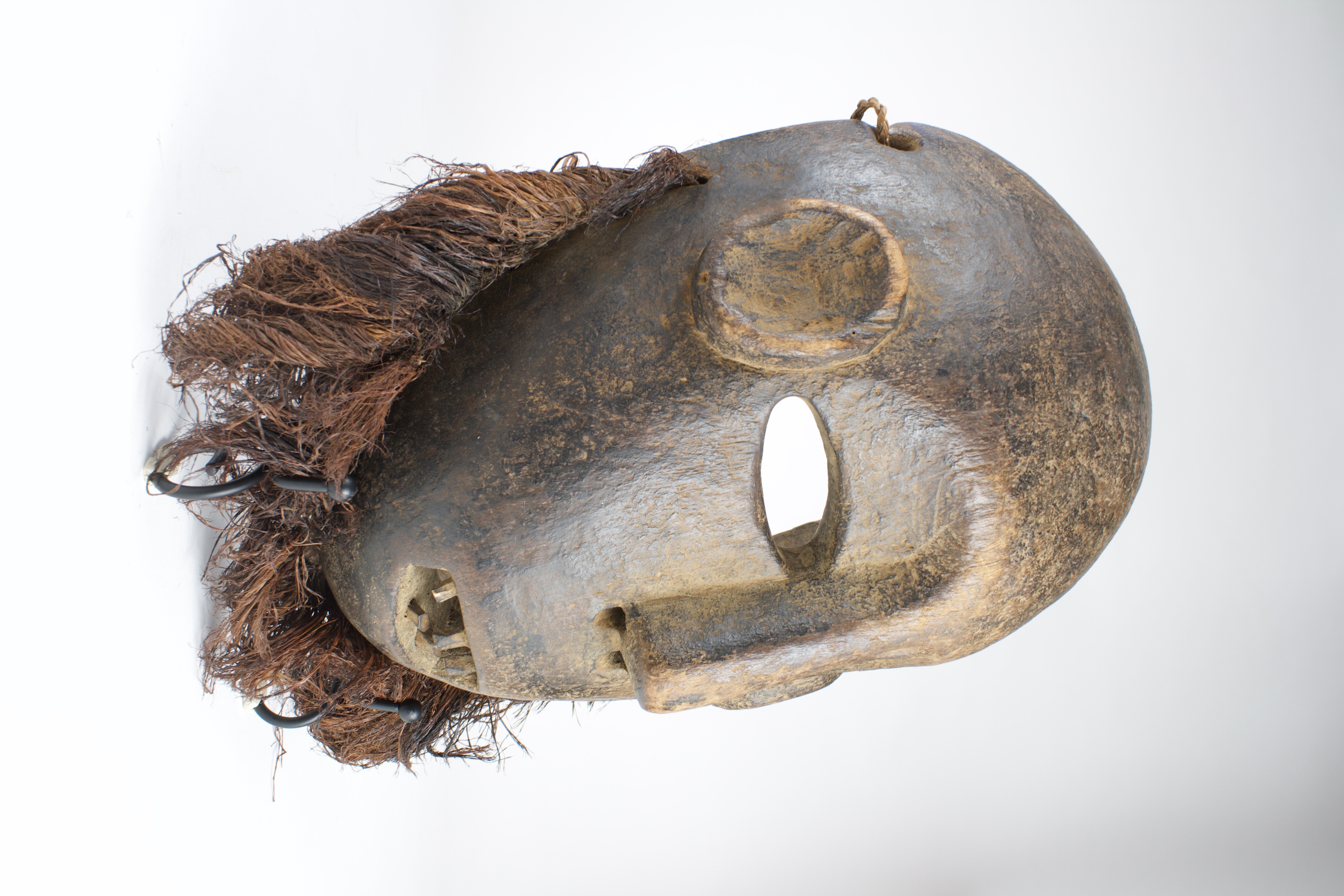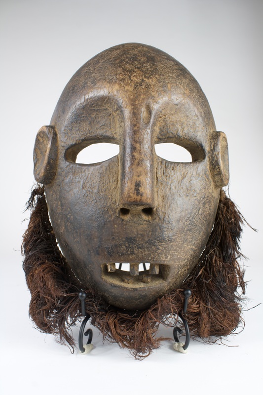 The carved mask has a rough surface with remnants of natural materials pressed into the wood. Along the chin, raffia has been woven through hollowed grommets. The facial features are minimalistic, with little detail in the eyes and nose. Lining the upper lip are small teeth, potentially from a small animal. Round ears rest on either side of the mask, creating a symmetrical face.