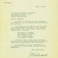 This letter informed the President of the Massachusetts School of Art of four former students working in the Chemical Warfare Service Development Laboratory drafting room.