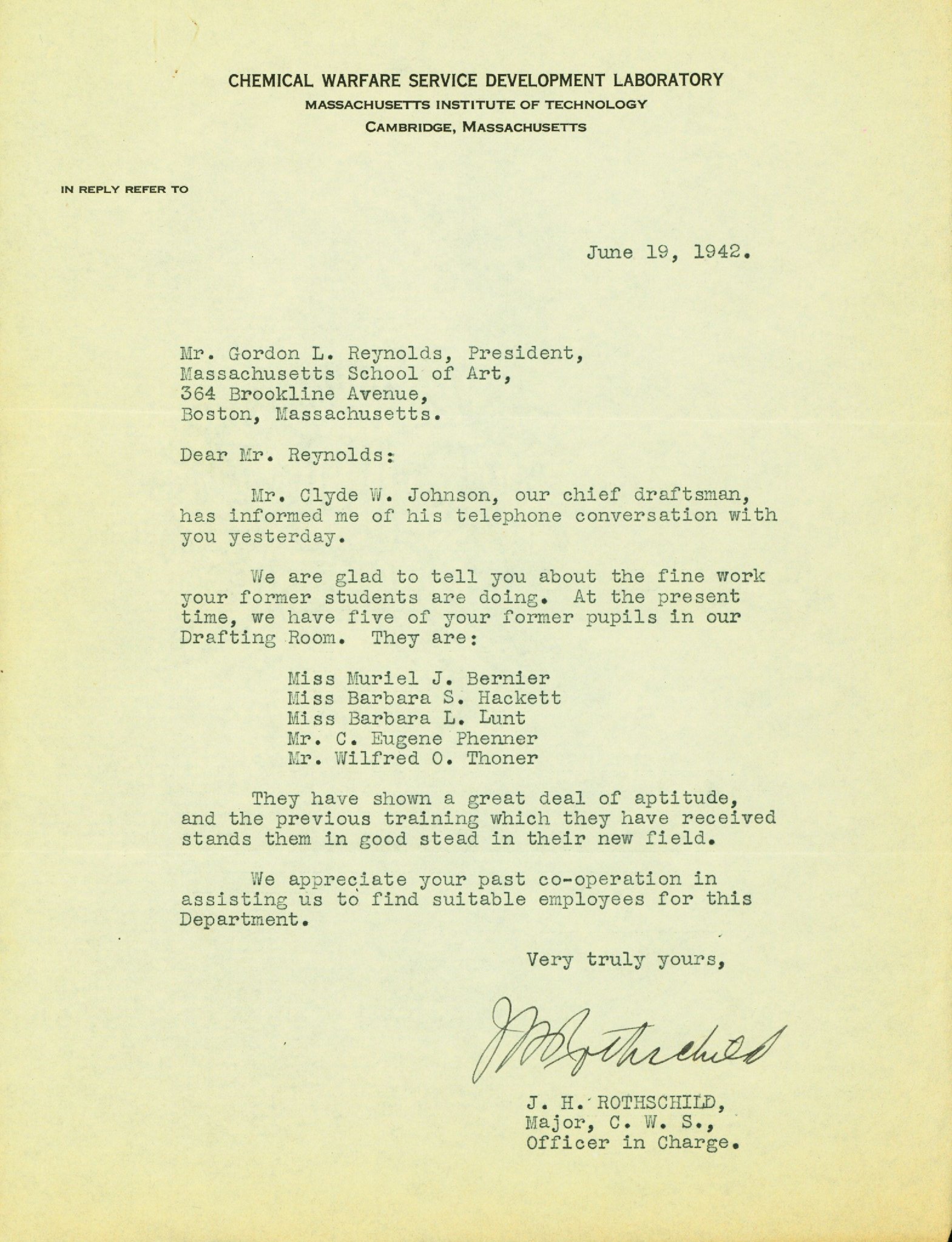 Letter from M.I.T. Chemical Warfare Service Development Laboratory informing President of Massachusetts School of Art of four